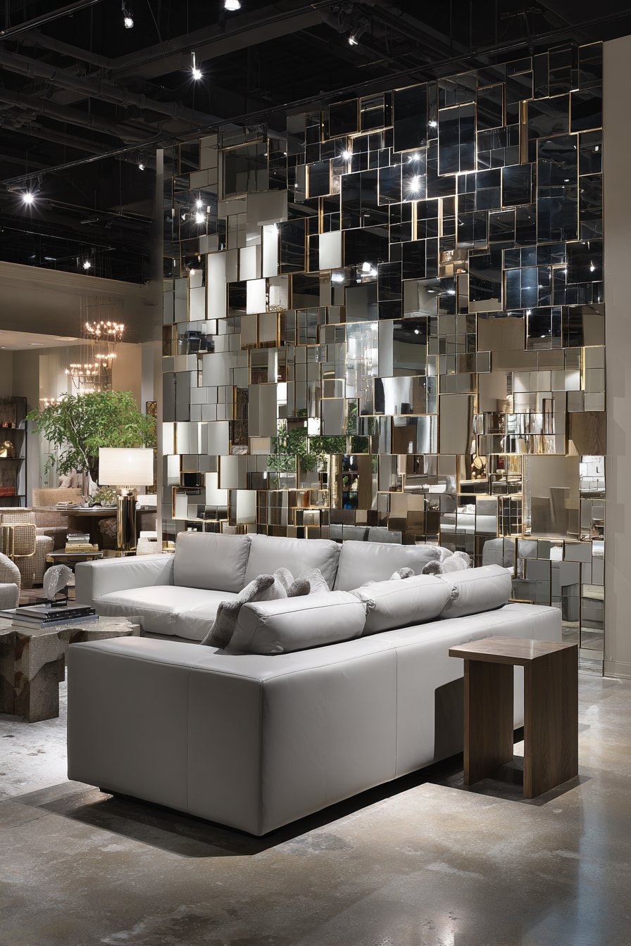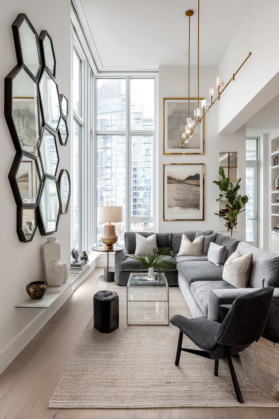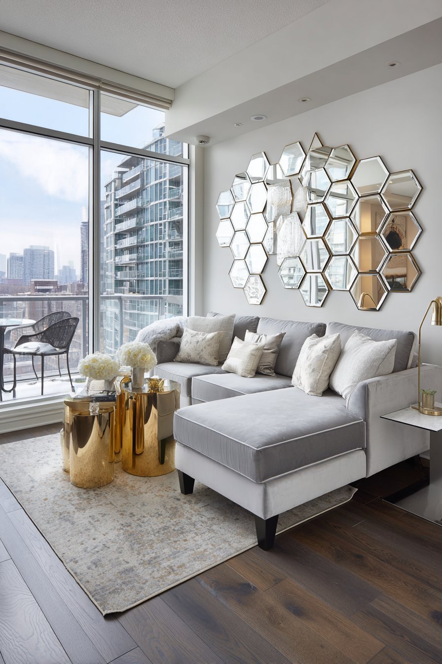 A large geometric frameless mirror arrangement dominates the main wall in this contemporary space. Hexagonal mirror tiles create an intricate honeycomb pattern. The arrangement reflects abundant natural light from adjacent floor-to-ceiling windows. This amplifies the sense of spaciousness dramatically.