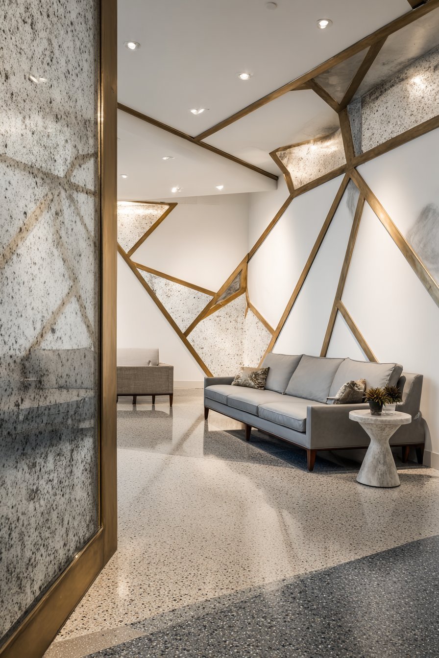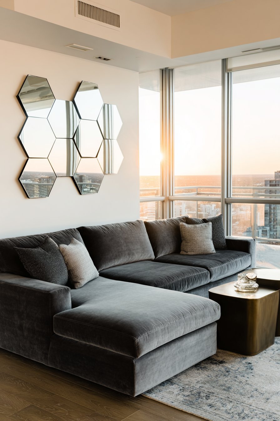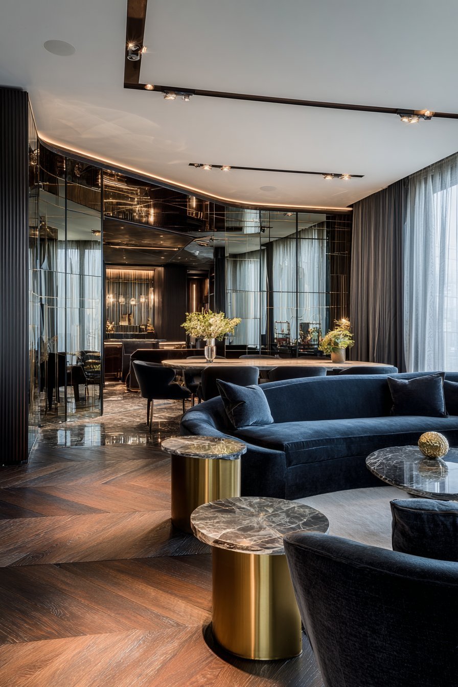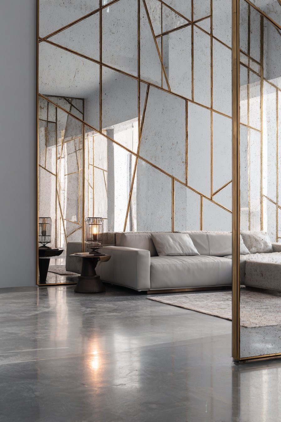 A large geometric frameless mirror arrangement dominates the main wall in this contemporary space. Hexagonal mirror tiles create an intricate honeycomb pattern. The arrangement reflects abundant natural light from adjacent floor-to-ceiling windows. This amplifies the sense of spaciousness dramatically.