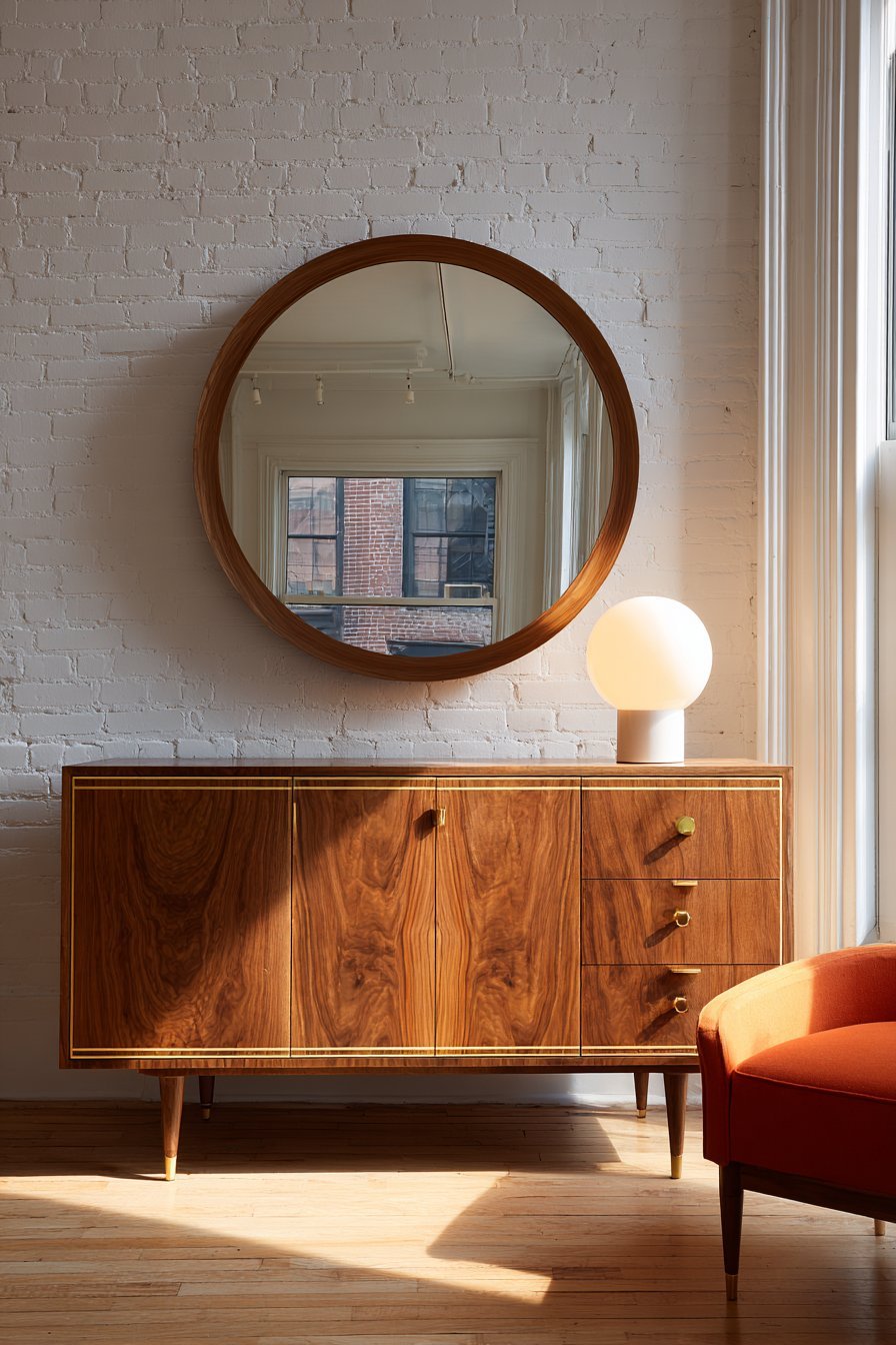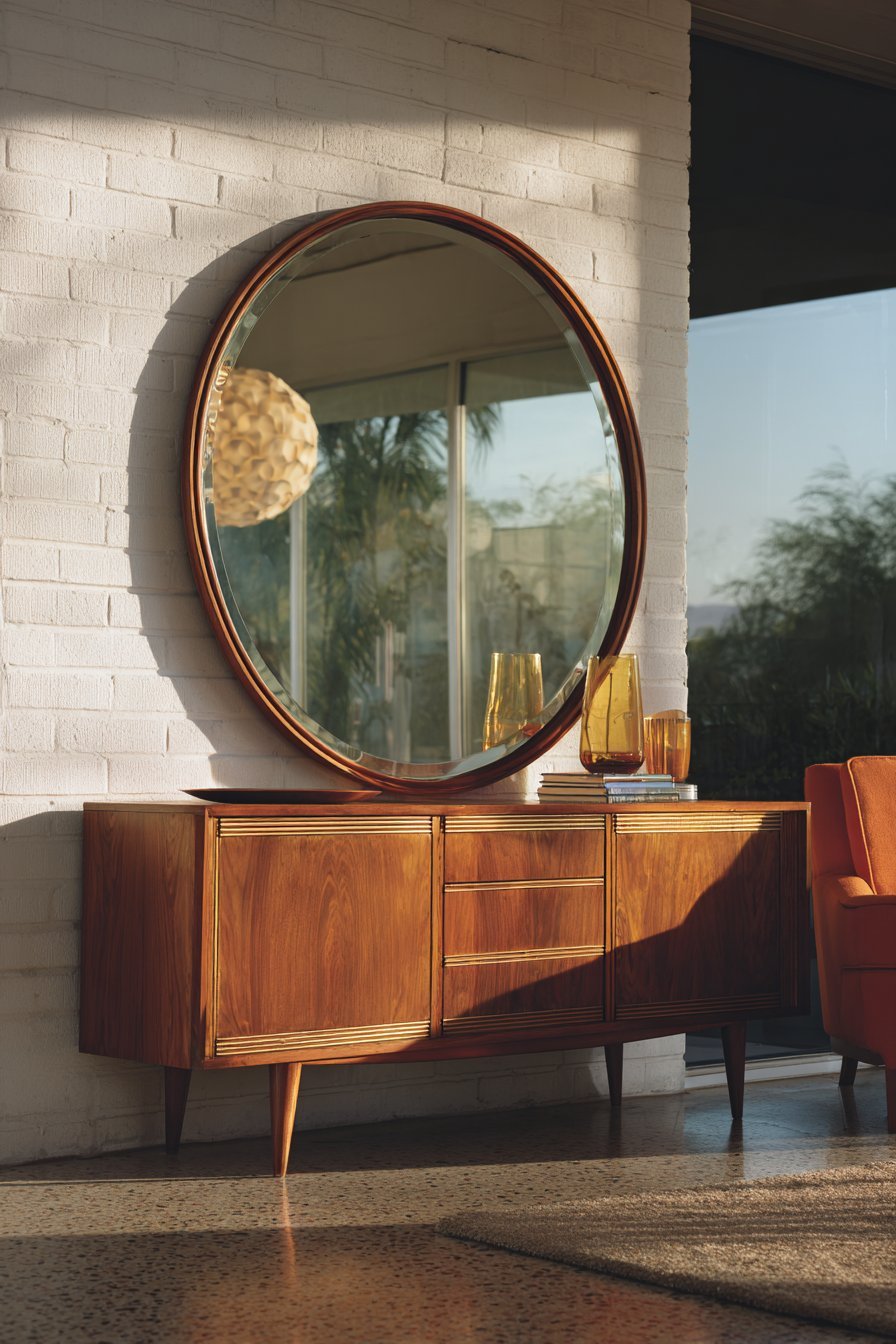 A circular mirror features a walnut wood frame with brass inlay details. This centers on white painted brick wall above low credenza. The mirror reflects George Nelson bubble lamp creating focal point. Teak furniture pieces and burnt orange accent chair complete period palette.