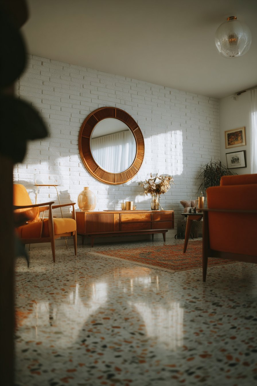 Terrazzo-style flooring adds authentic mid-century character underfoot. Warm afternoon light captures the mirror’s geometric simplicity beautifully. Period-correct materials demonstrate attention to authentic design principles. The wood grain pattern and brass accents show meticulous craftsmanship.