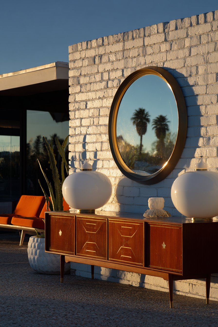The mirror’s placement above the credenza creates balanced composition. The reflection of iconic mid-century lighting reinforces period authenticity. Every element demonstrates an understanding of mid-century design language. This creates cohesive aesthetic that honors the style’s integrity.