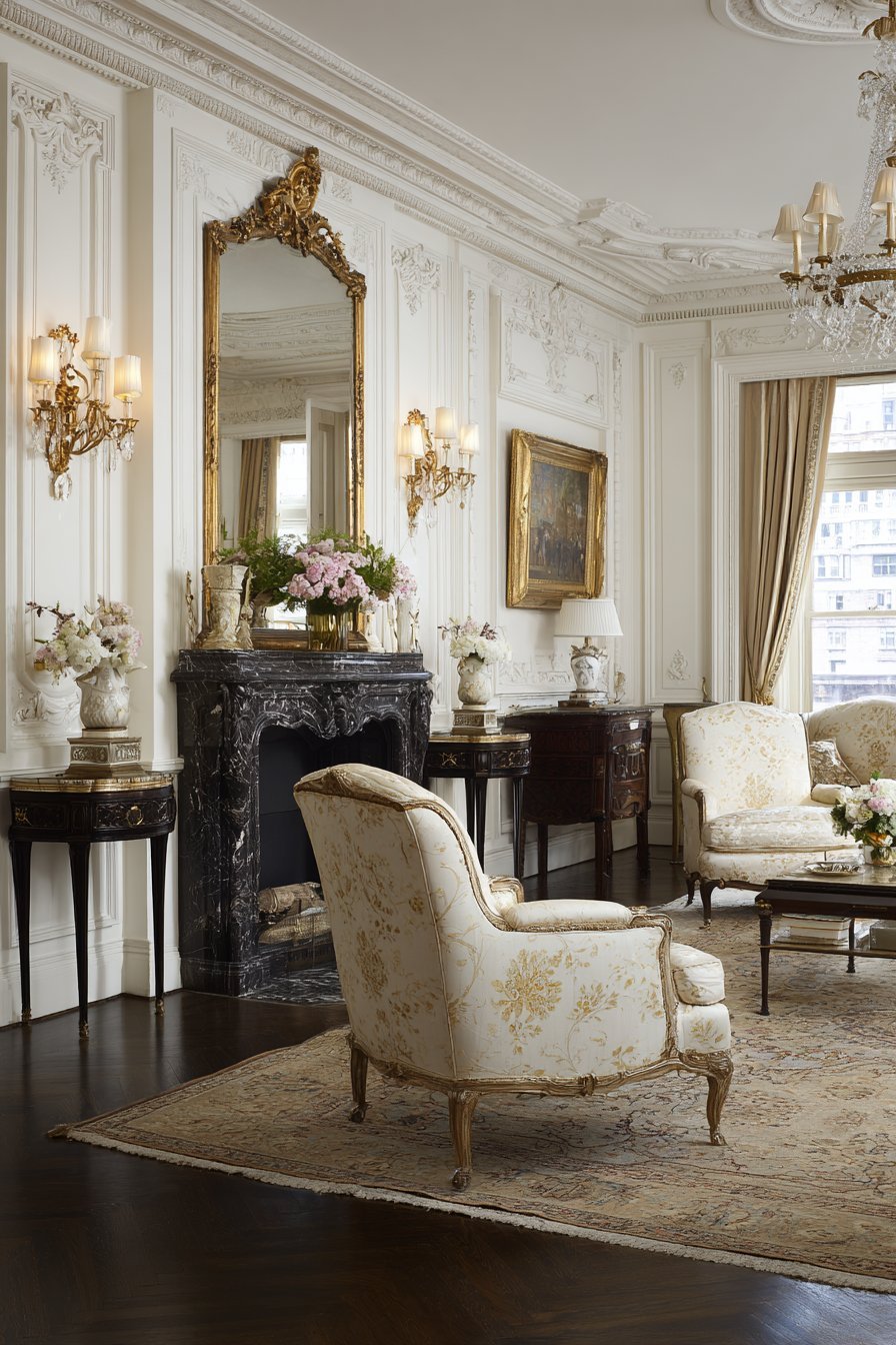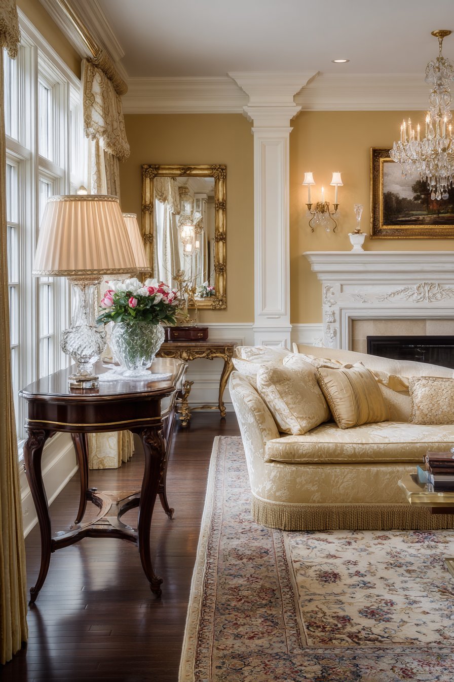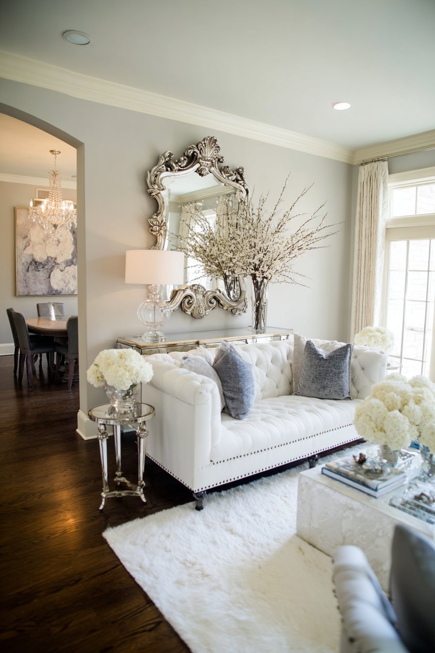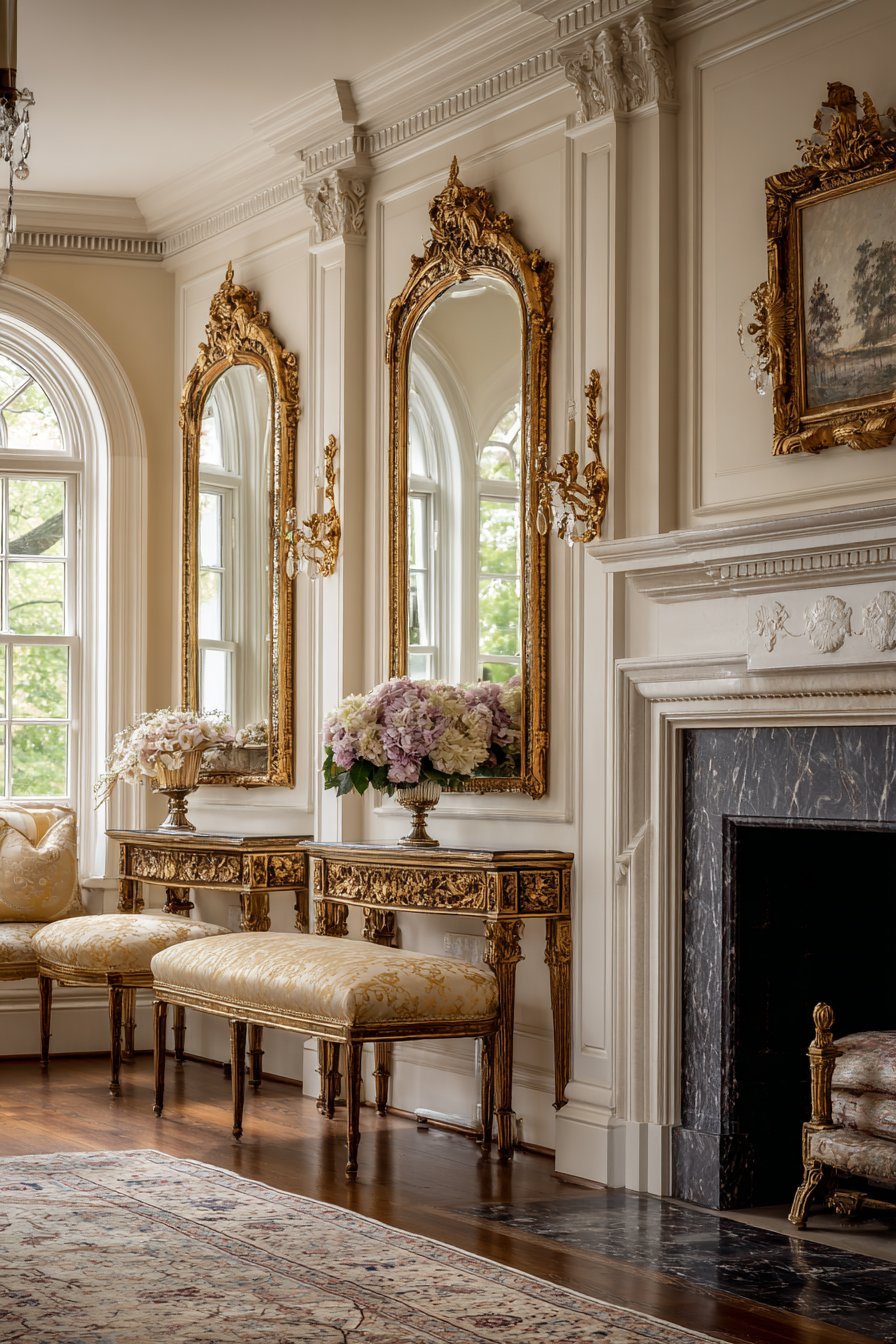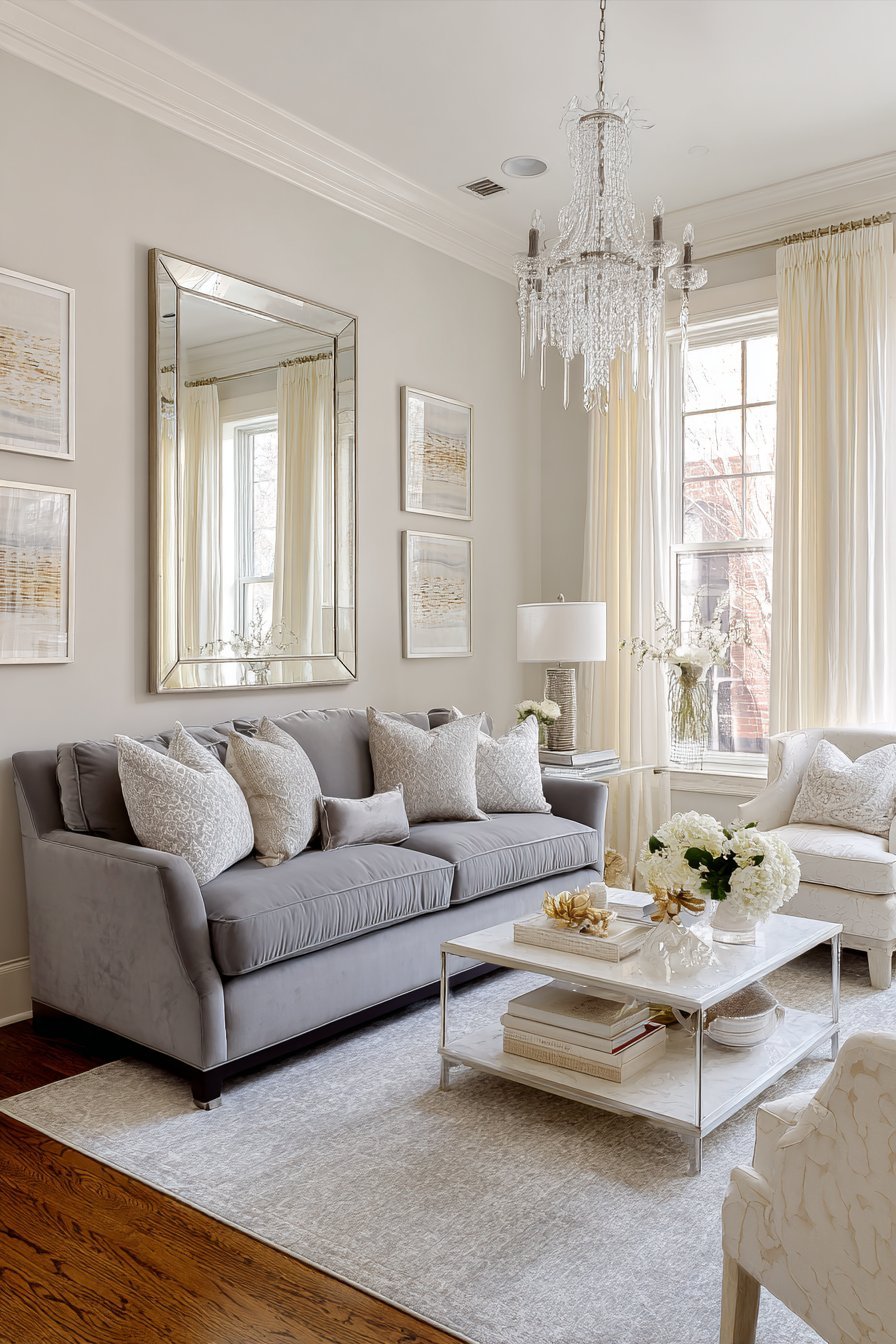 Plush area rug in soft grey tones covers honey-toned hardwood flooring. Balanced natural daylight from sheer-curtained windows provides even illumination. The mirror’s elegant proportions suit the room’s sophisticated neutral palette. Traditional detailing feels timeless rather than dated.