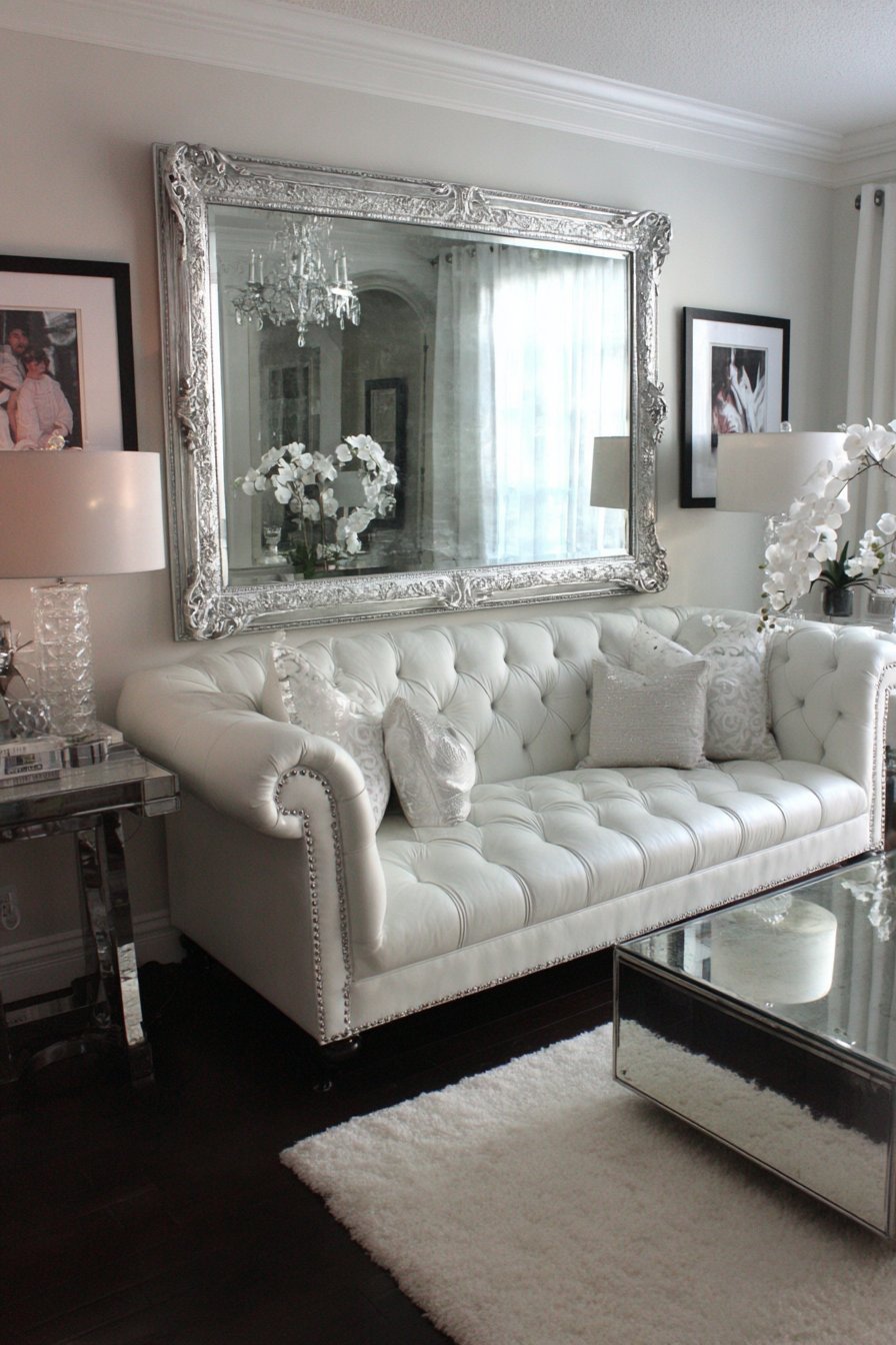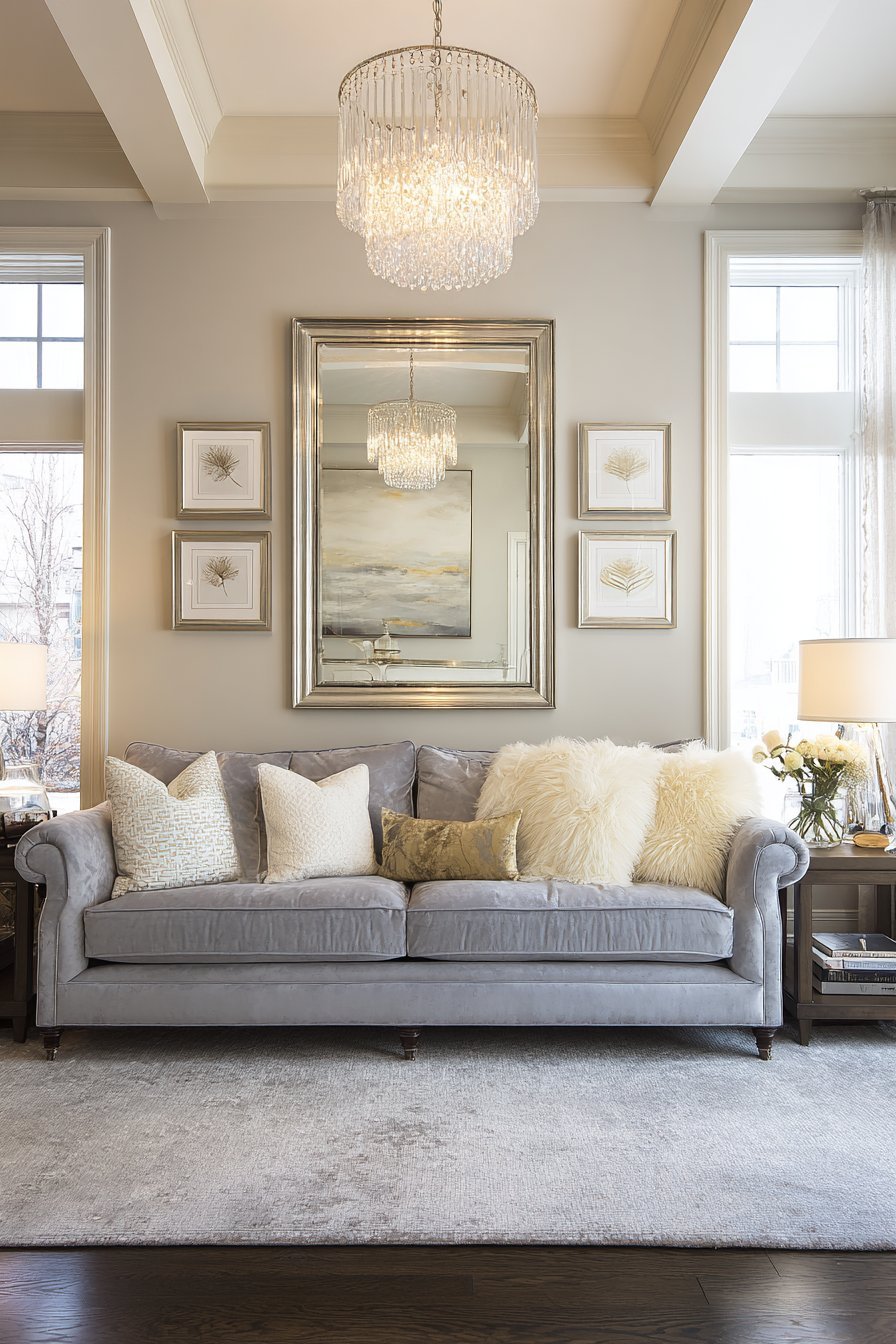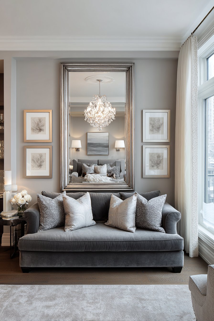 A classic rectangular mirror features beveled edge and brushed silver frame. The traditional profile hangs above grey upholstered sofa with rolled arms. The mirror reflects a crystal chandelier creating depth in neutral-toned space. Coordinating silver-framed artwork flanks the mirror symmetrically.