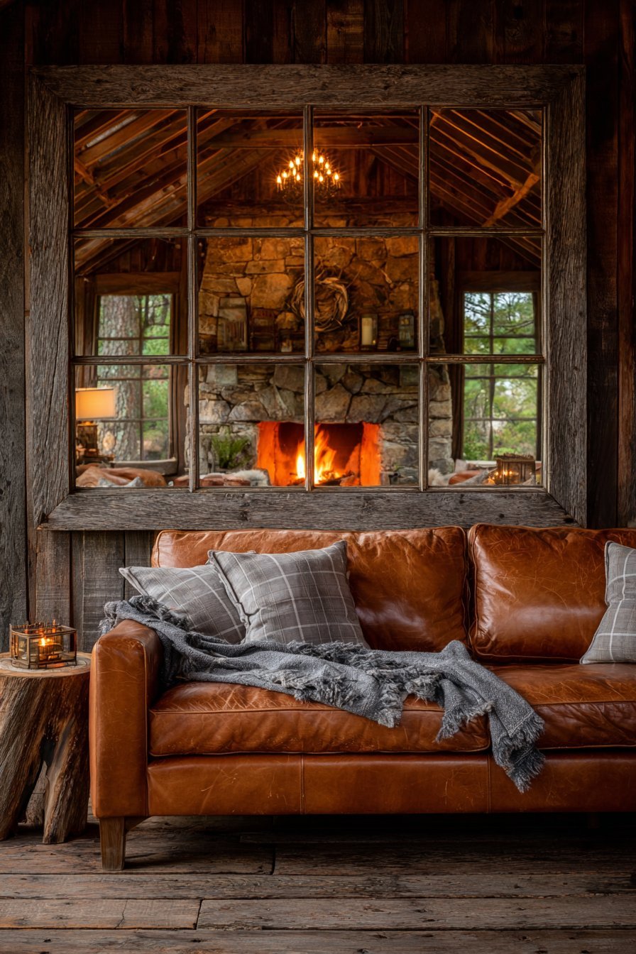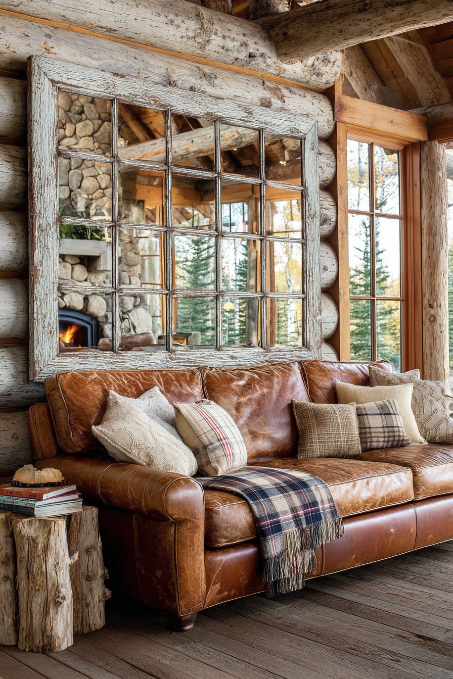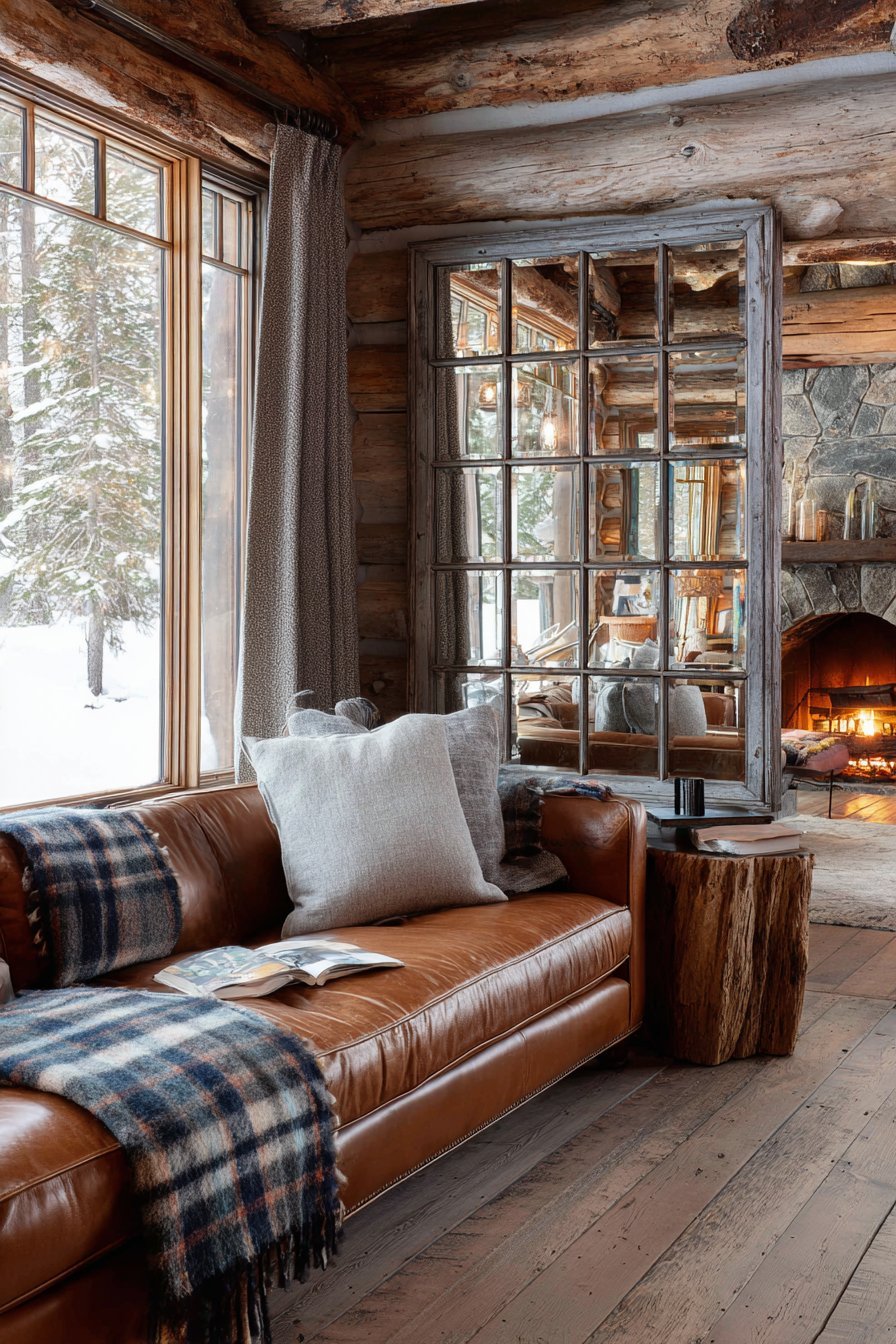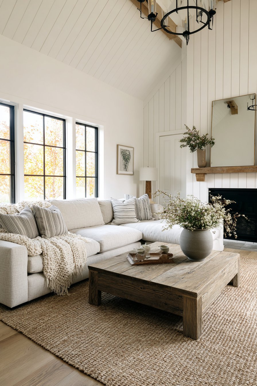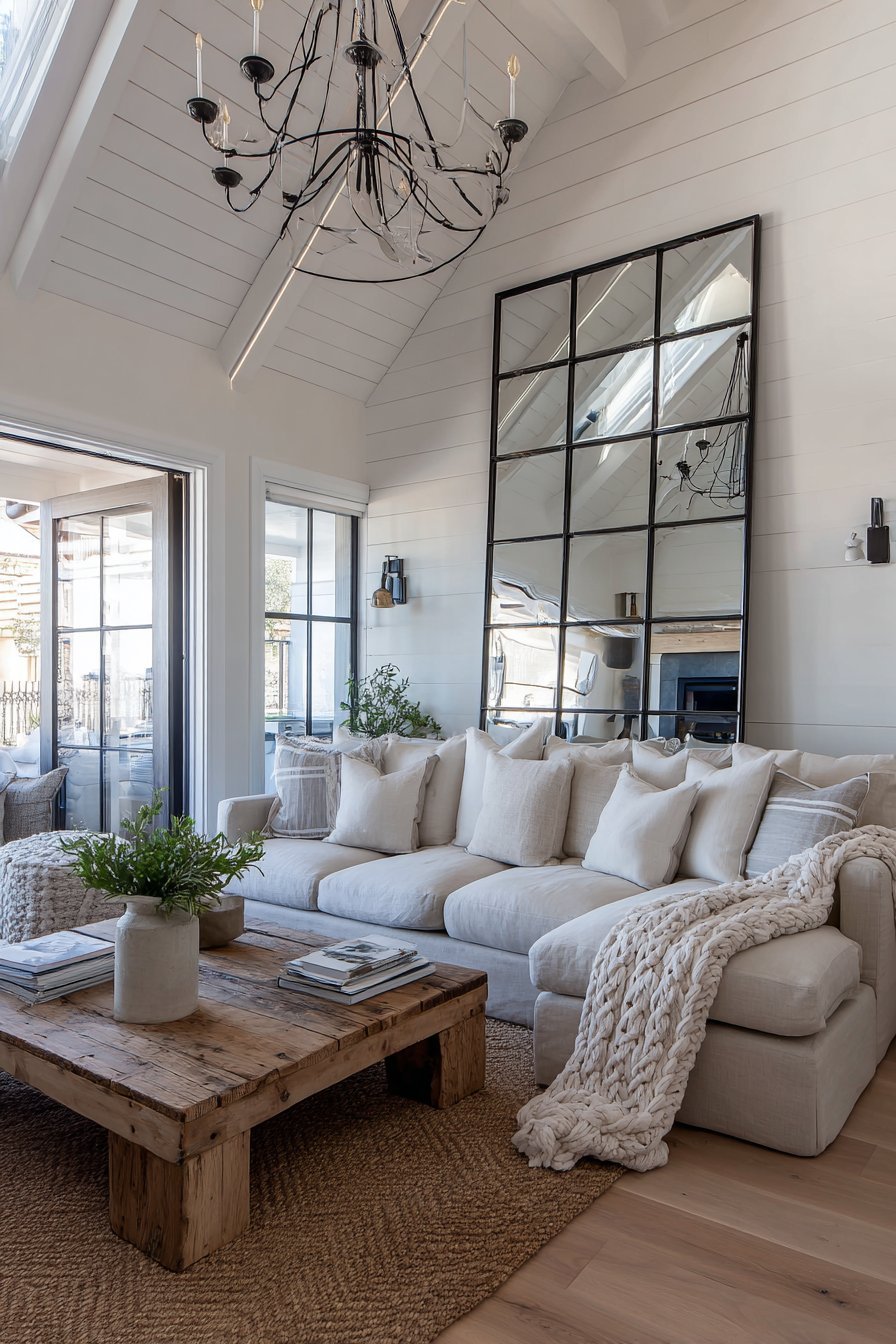 A window-style mirror features black metal frame with divided panes. The grid pattern leans casually against shiplap wall beside fireplace. This oversized mirror reflects vaulted ceiling and modern chandelier. Neutral linen sectional includes chunky knit throws for comfort.