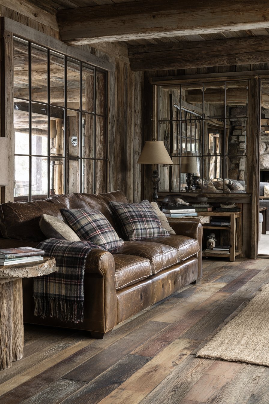 The window-pane design echoes the home’s architectural features successfully. The divided grid creates interesting, fragmented reflections. The casual leaning position feels intentionally relaxed. This approach suits modern farmhouse’s blend of refined and rustic.