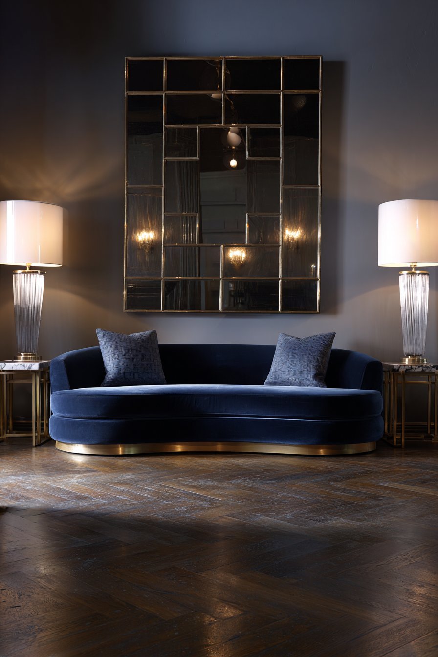 Brass floor lamps and plants in ceramic pots add curated abundance. Warm artificial and natural mixed lighting creates rich atmosphere. The mirror’s sculptural quality makes it art piece and functional object. The bold color palette demonstrates confident design choices.