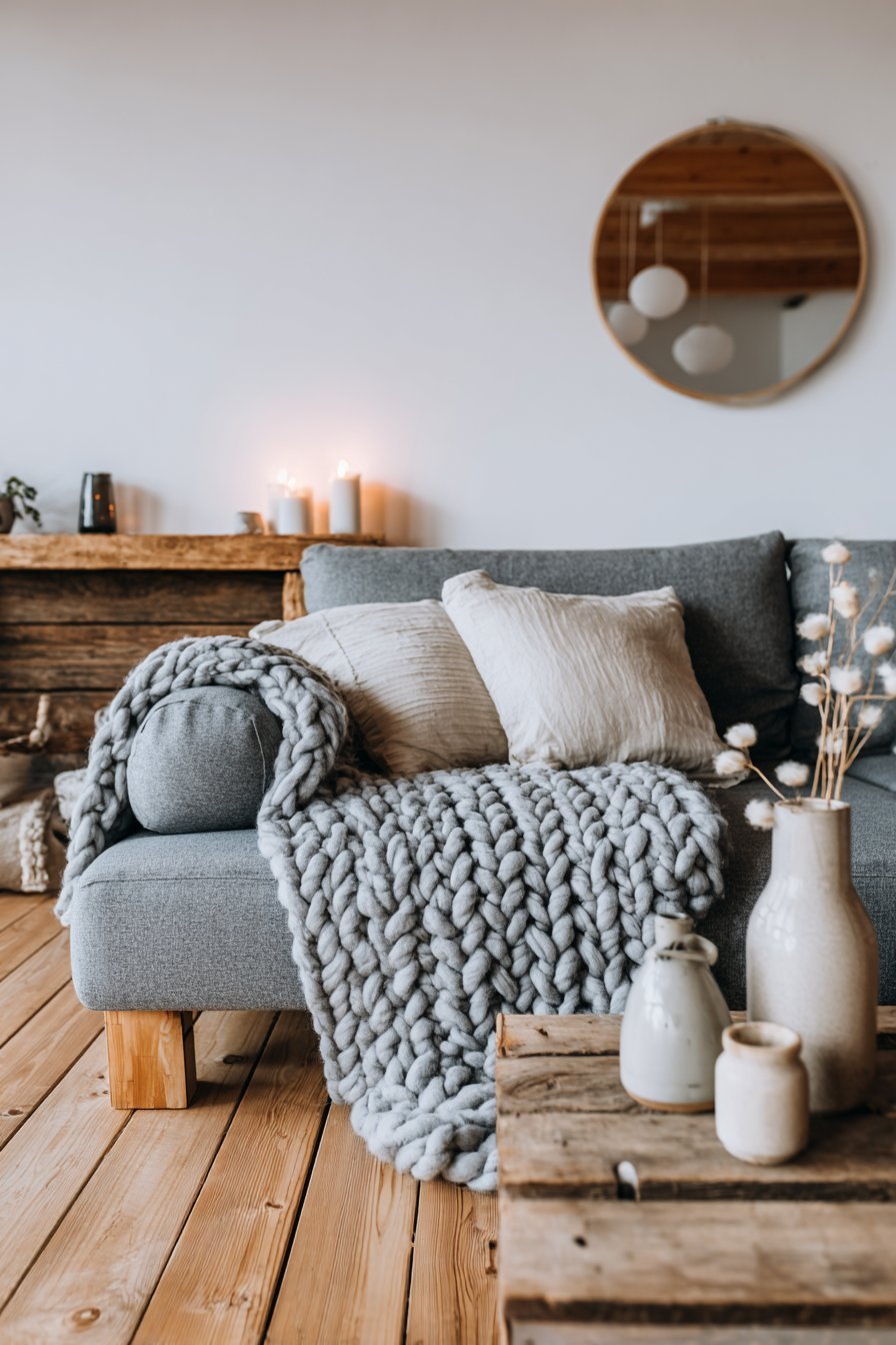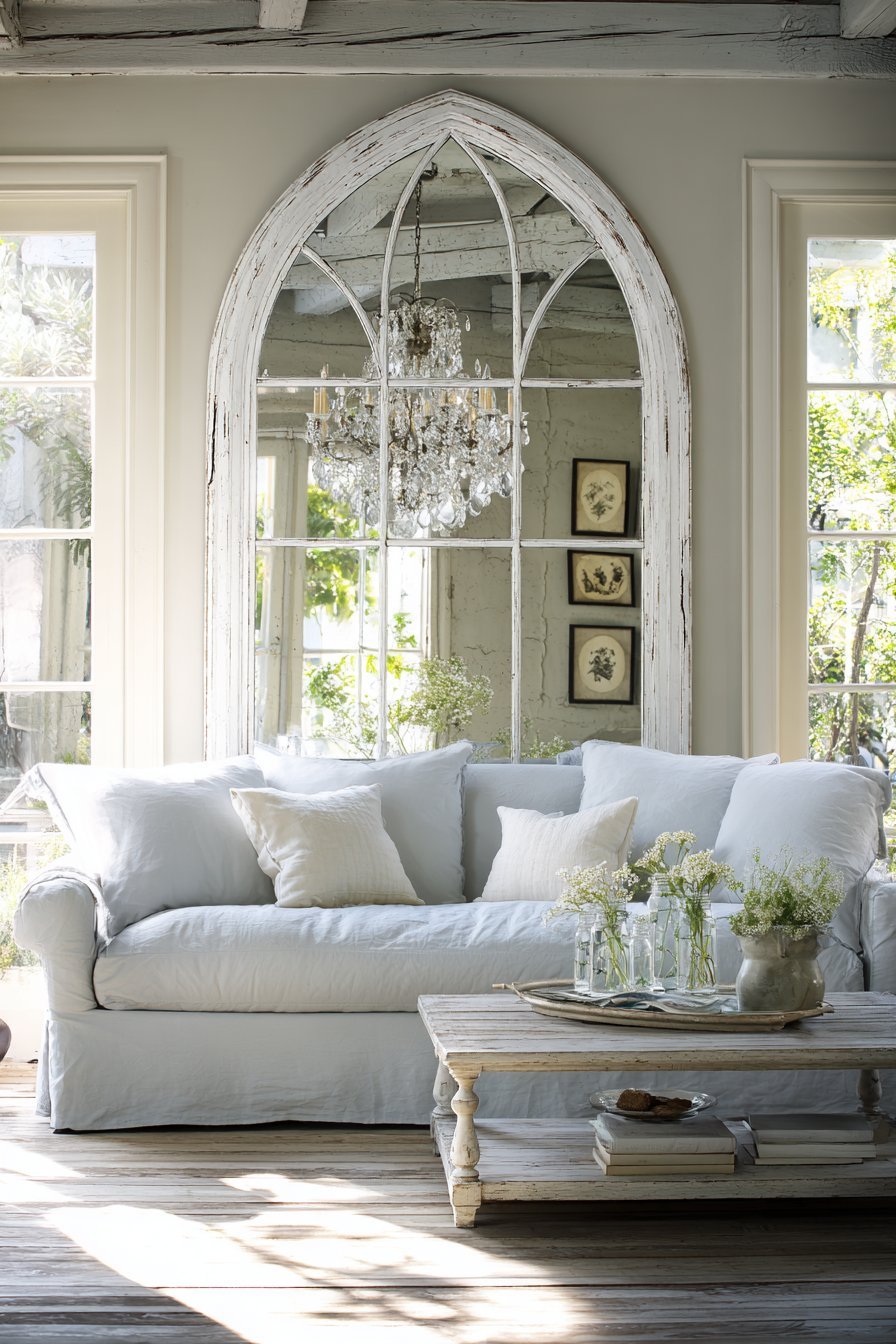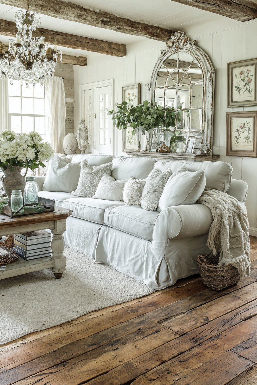 The cream-colored slipcovered sofa faces the fireplace with chunky knit throws. Wide-plank oak flooring in natural finish shows organic color variation. Soft natural window light highlights the rustic mirror frame texture. Warm reflections enhance the refined yet rustic aesthetic.