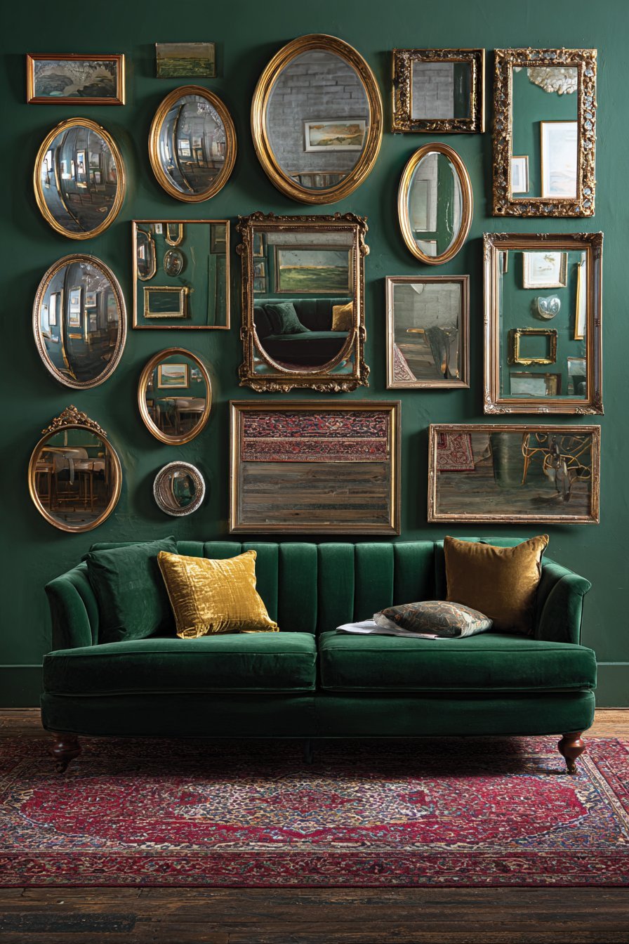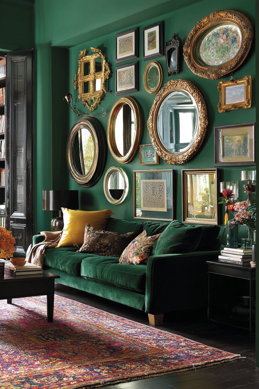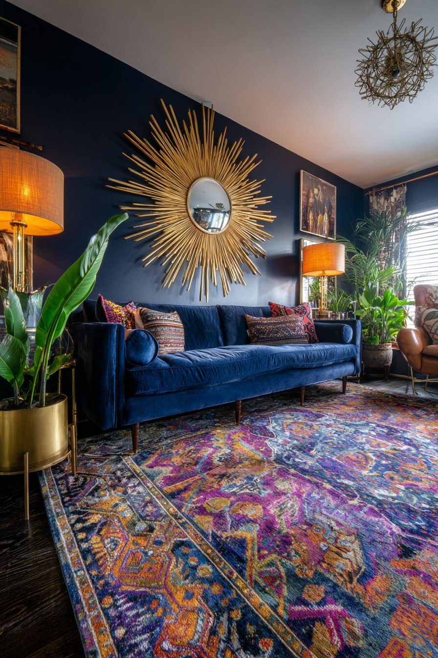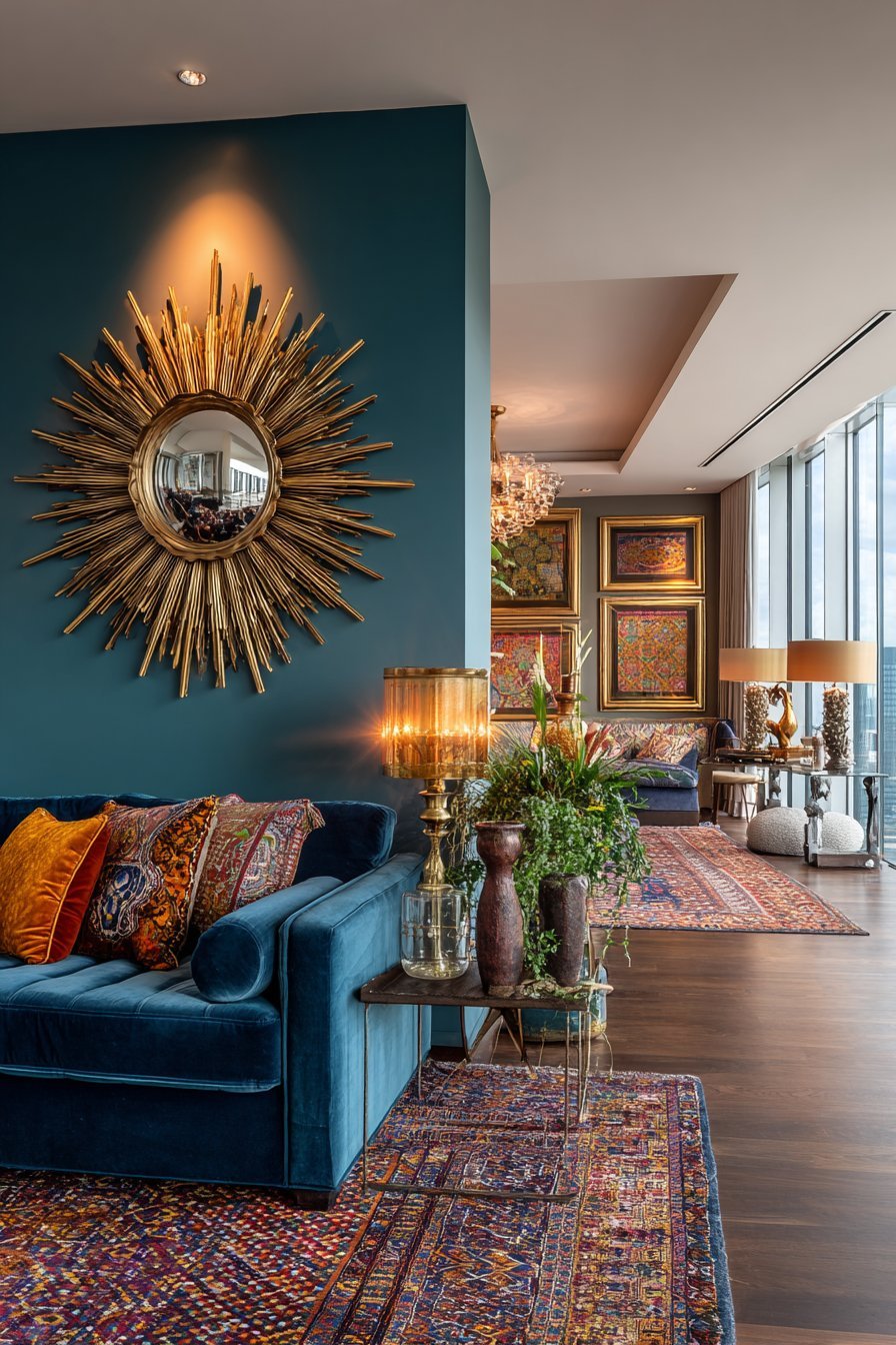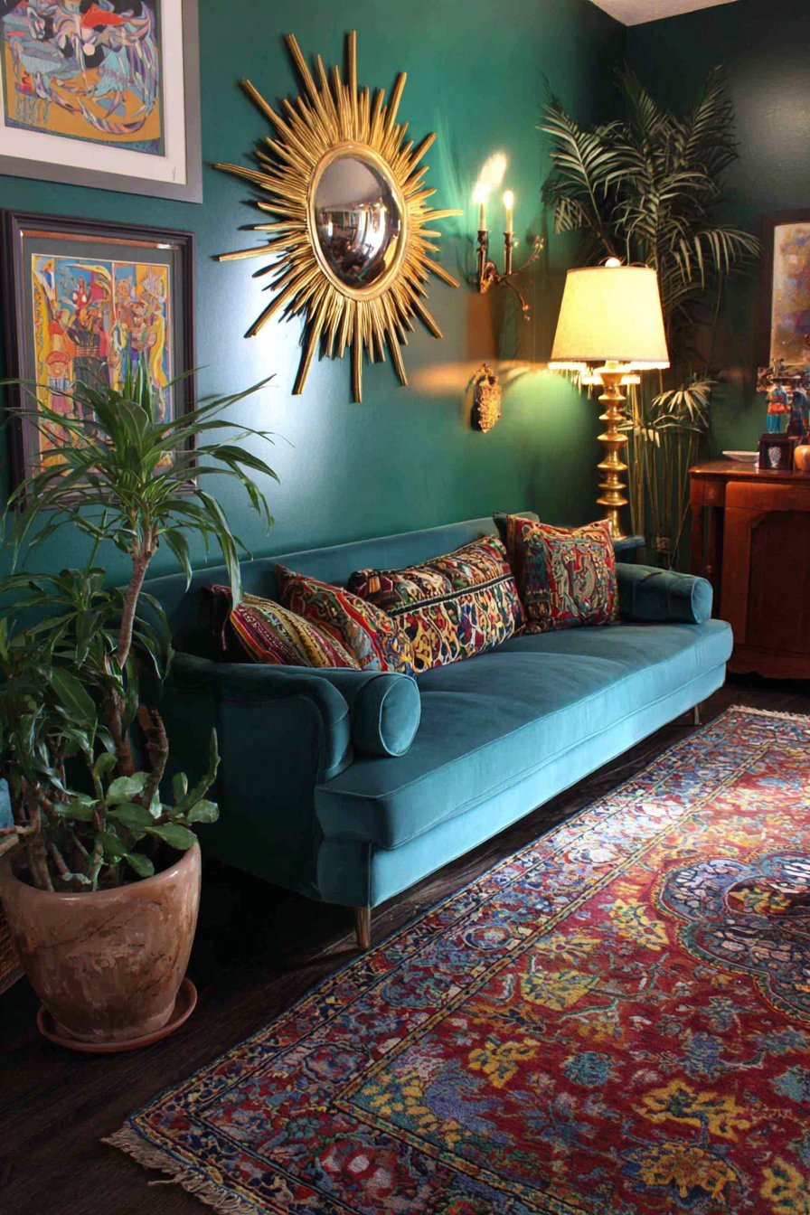 An oversized sunburst mirror with gold metallic rays radiates from convex center. This dramatic statement piece mounts on jewel-tone emerald green accent wall. The mirror reflects colorful patterned throw pillows on peacock blue velvet sofa. Layered vintage rugs in complementary colors cover dark hardwood floors.