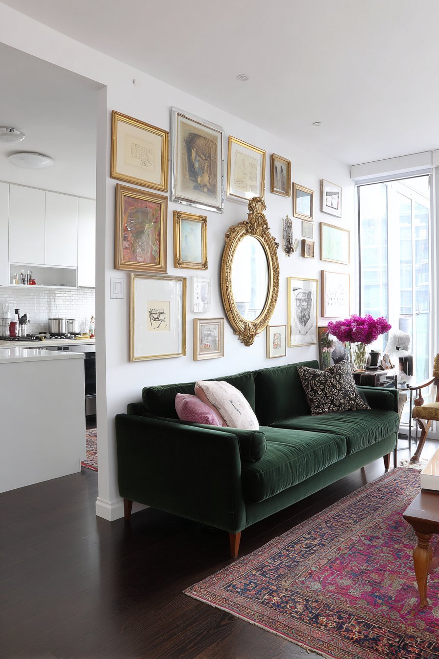 The emerald accent wall provides dramatic backdrop for the gold mirror. This color combination exudes luxury and personality. The maximalist approach celebrates pattern, color, and texture fearlessly. Every element contributes to the collected, curated aesthetic.