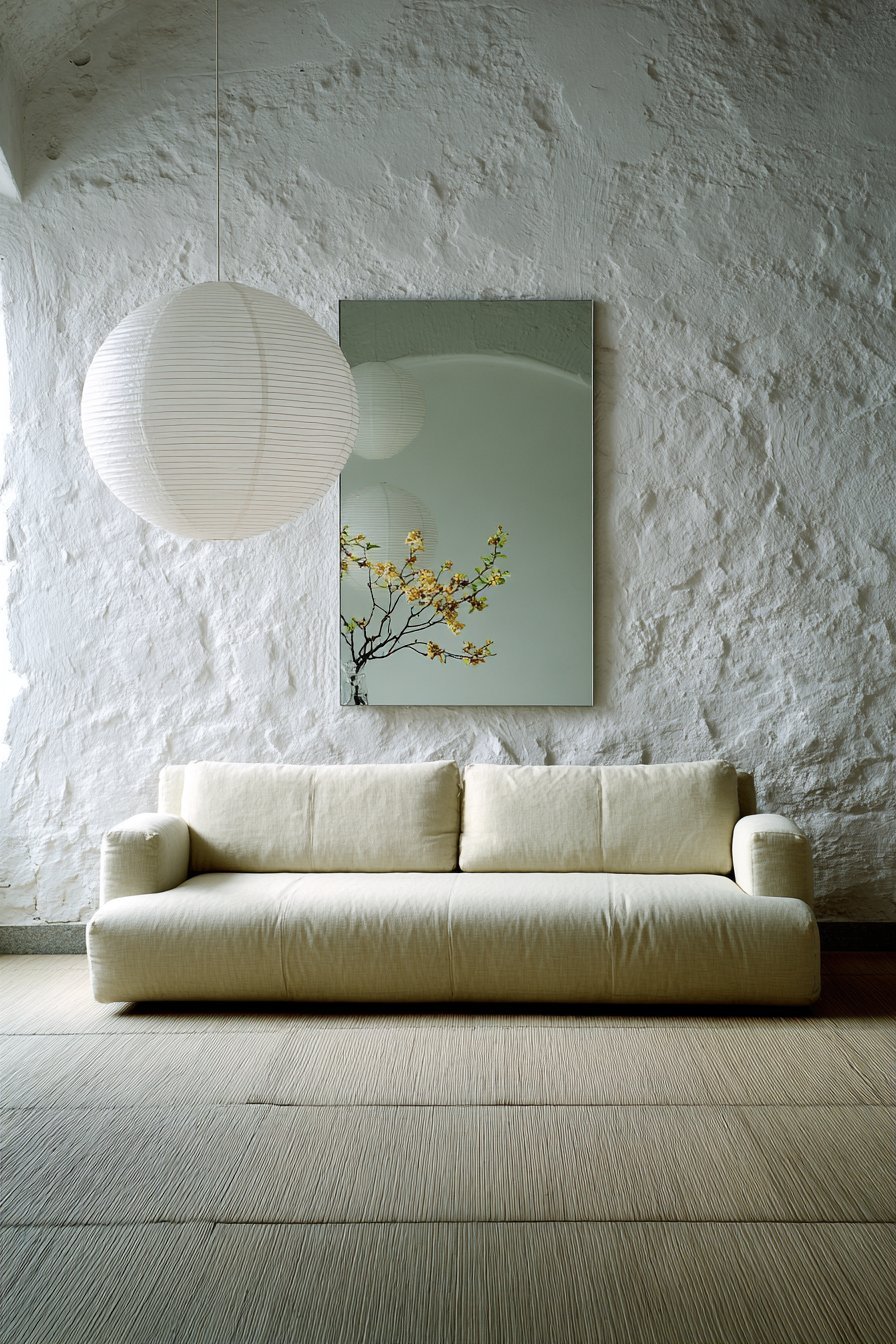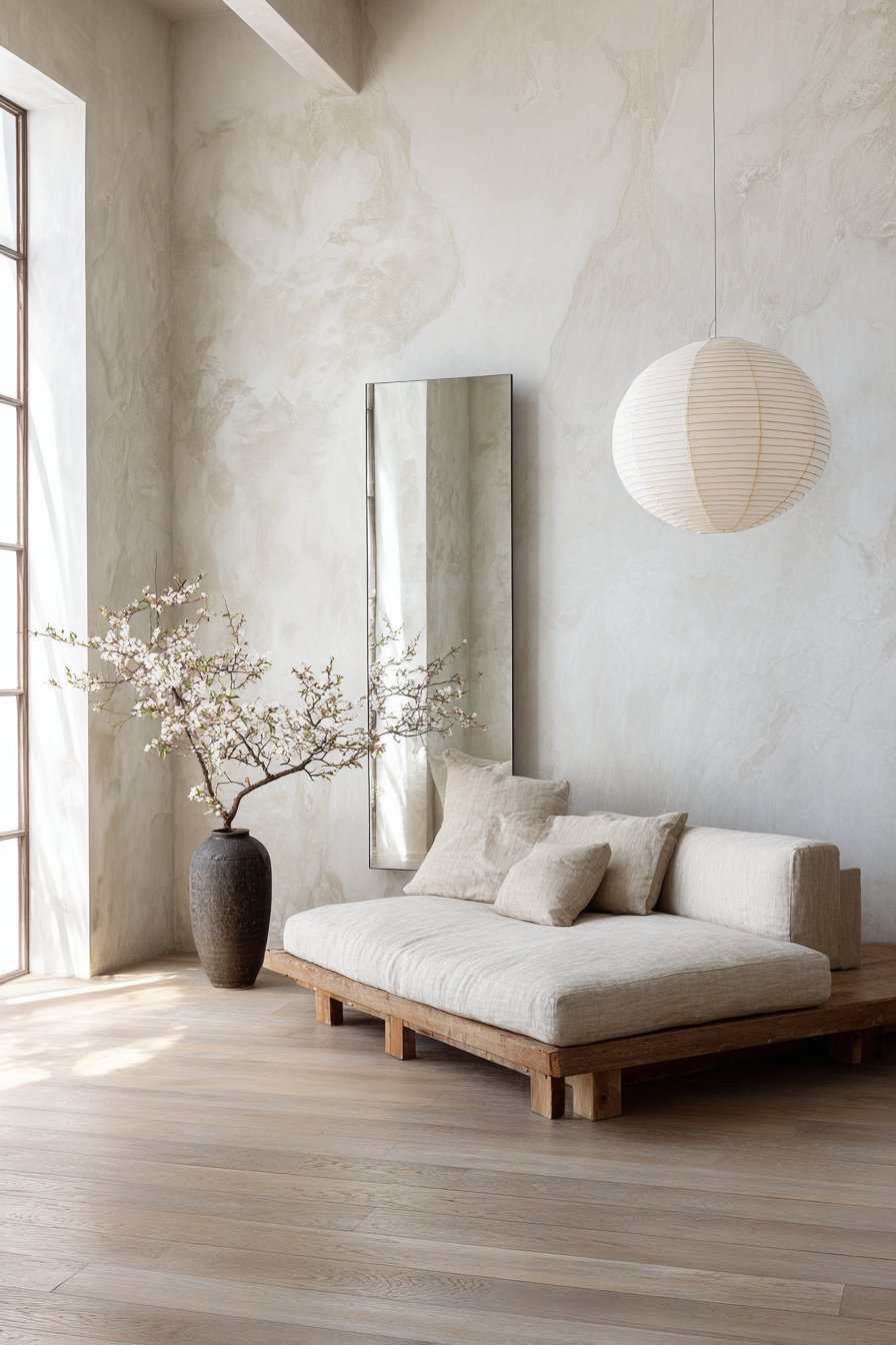 Morning light diffuses gently through the space creating soft illumination. The mirror’s vertical emphasis draws the eye upward naturally. This creates the impression of higher ceilings. The reflection captures the room’s carefully curated simplicity perfectly.