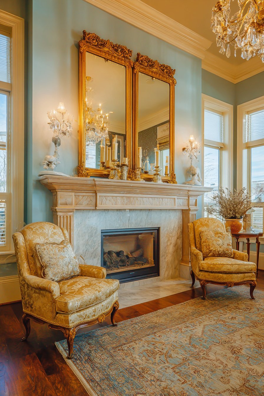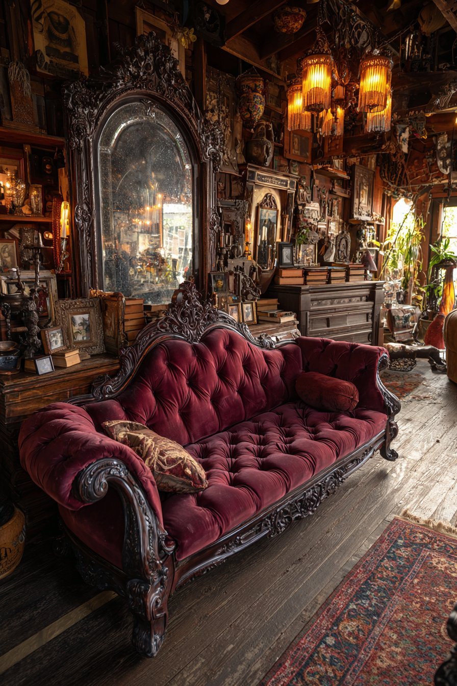 The mirror anchors the collected, layered vintage aesthetic completely. Aged glass reflections feel appropriately nostalgic and romantic. Every element contributes to the room’s historical, collected character. The design honors authentic antiques and traditional craftsmanship.