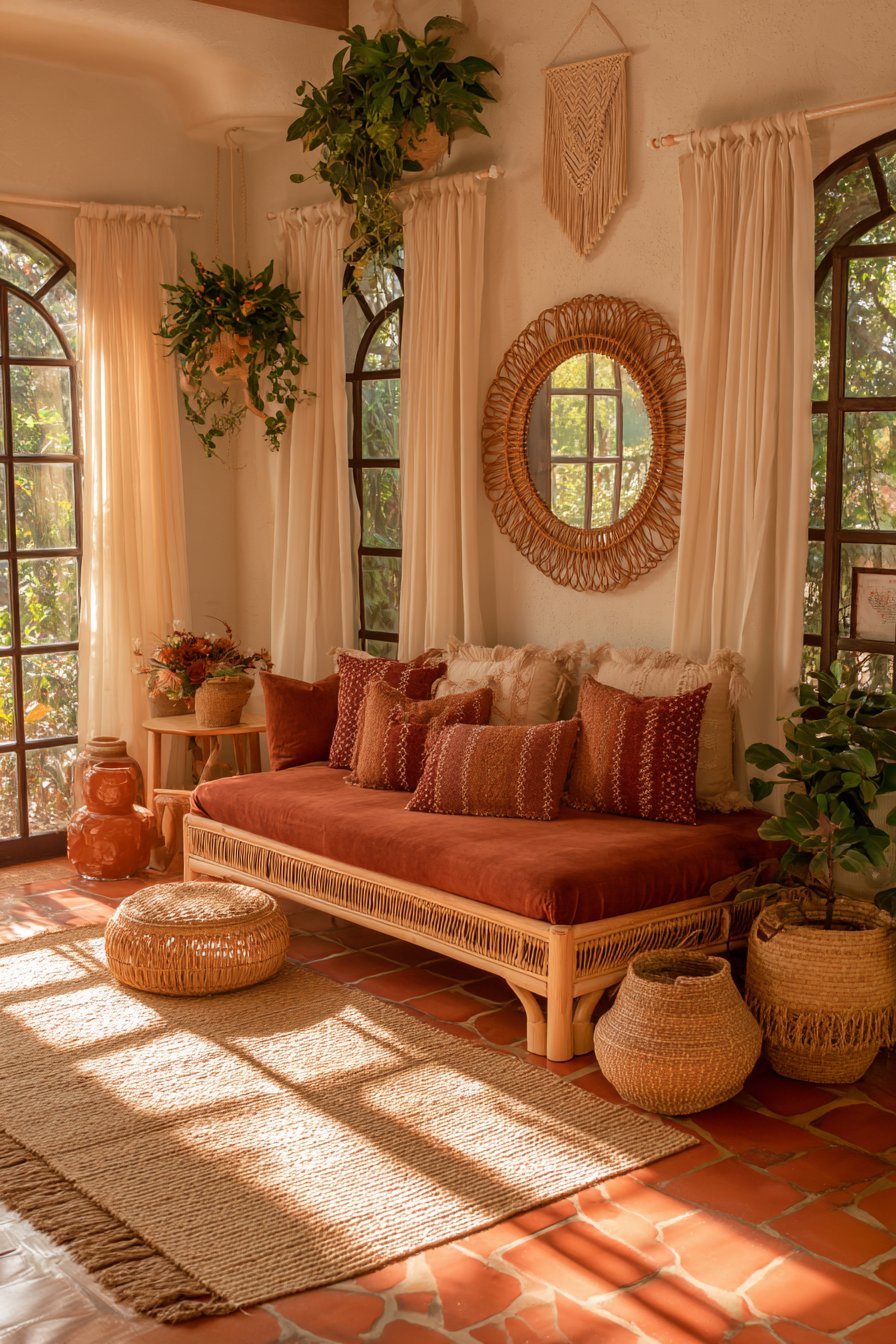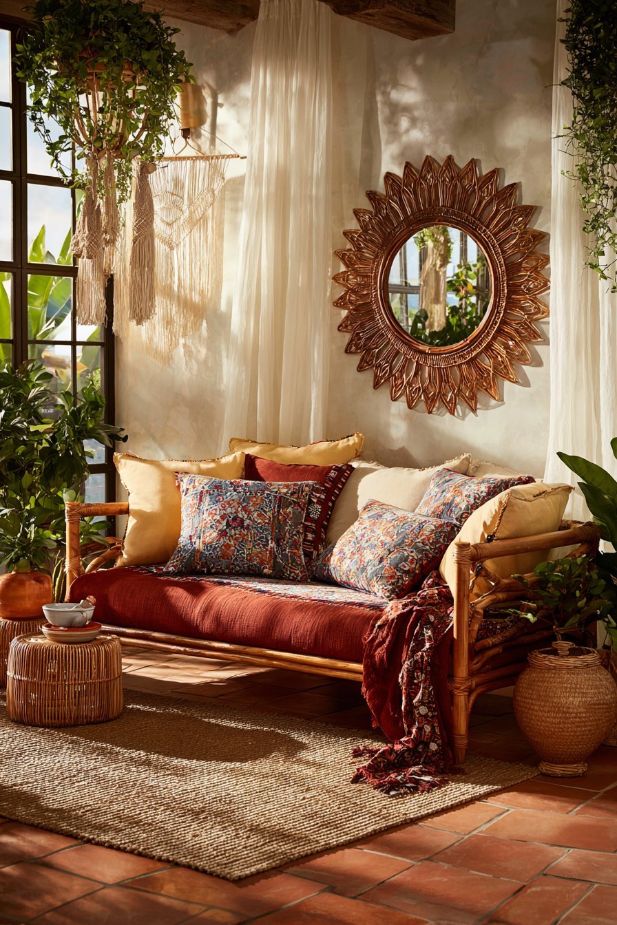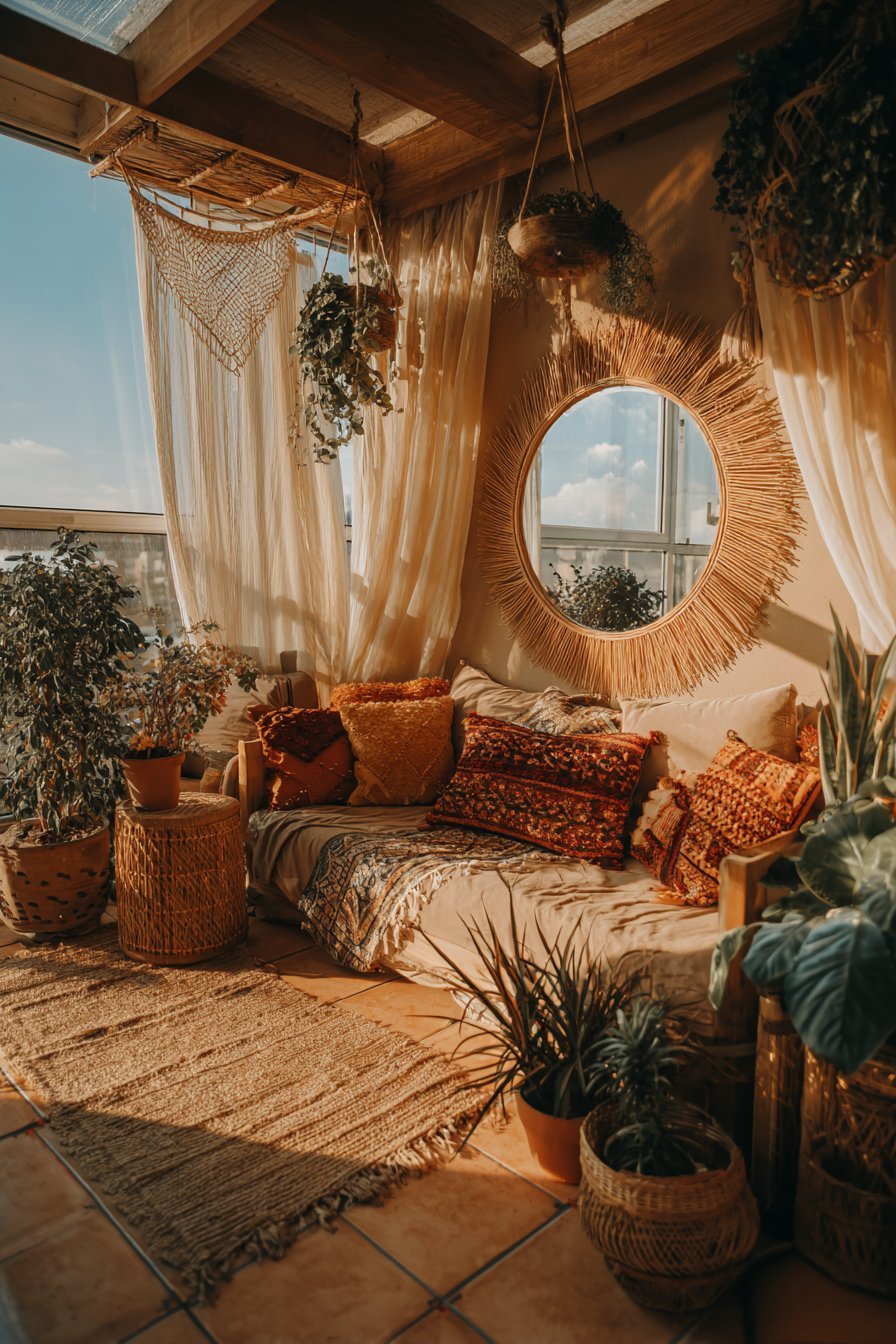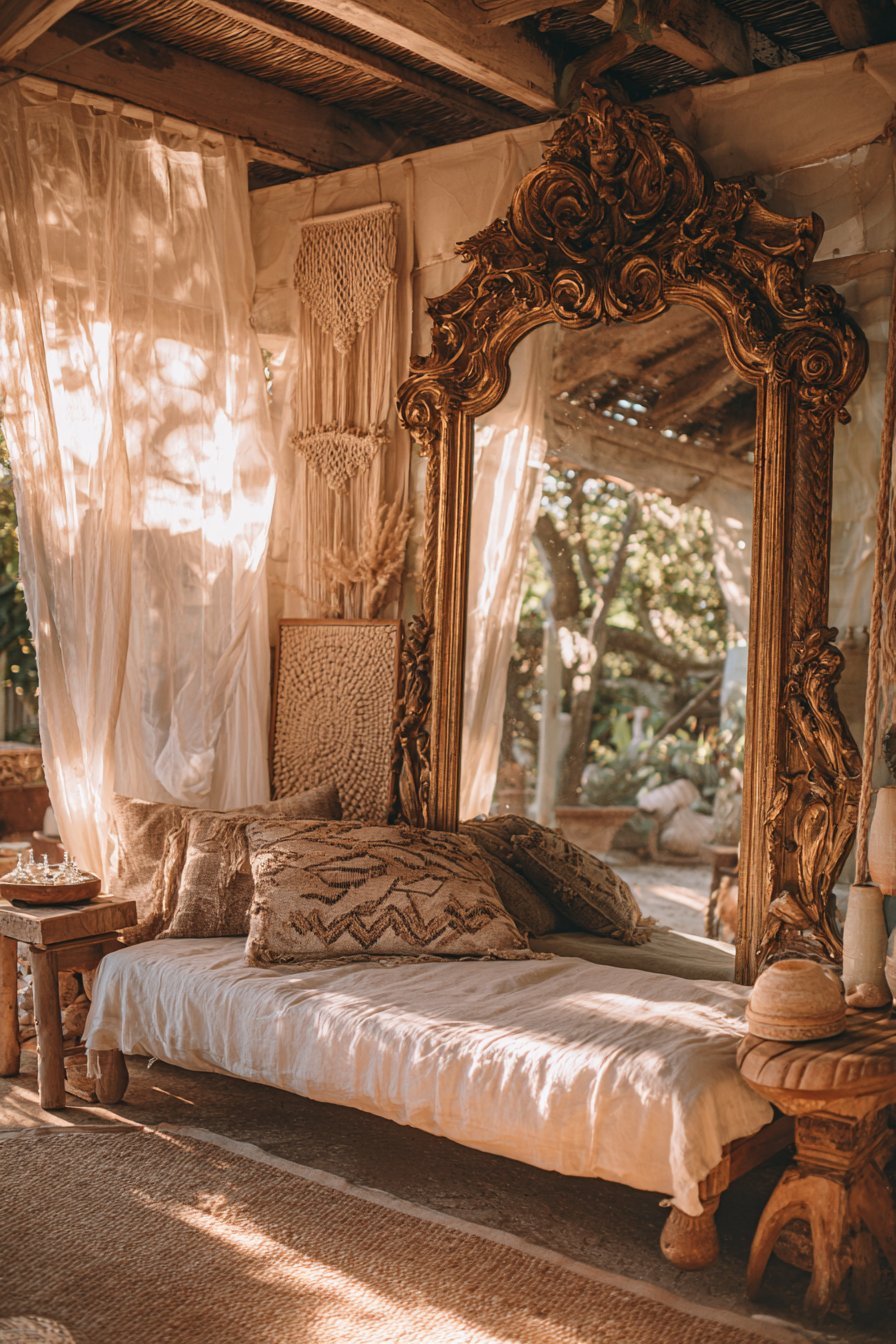 The baroque frame’s elaborate scrollwork creates romantic visual interest. This ornate style contrasts beautifully with the casual bohemian textiles. The combination of refined and relaxed elements feels curated yet comfortable. This balance defines successful bohemian interior design.
