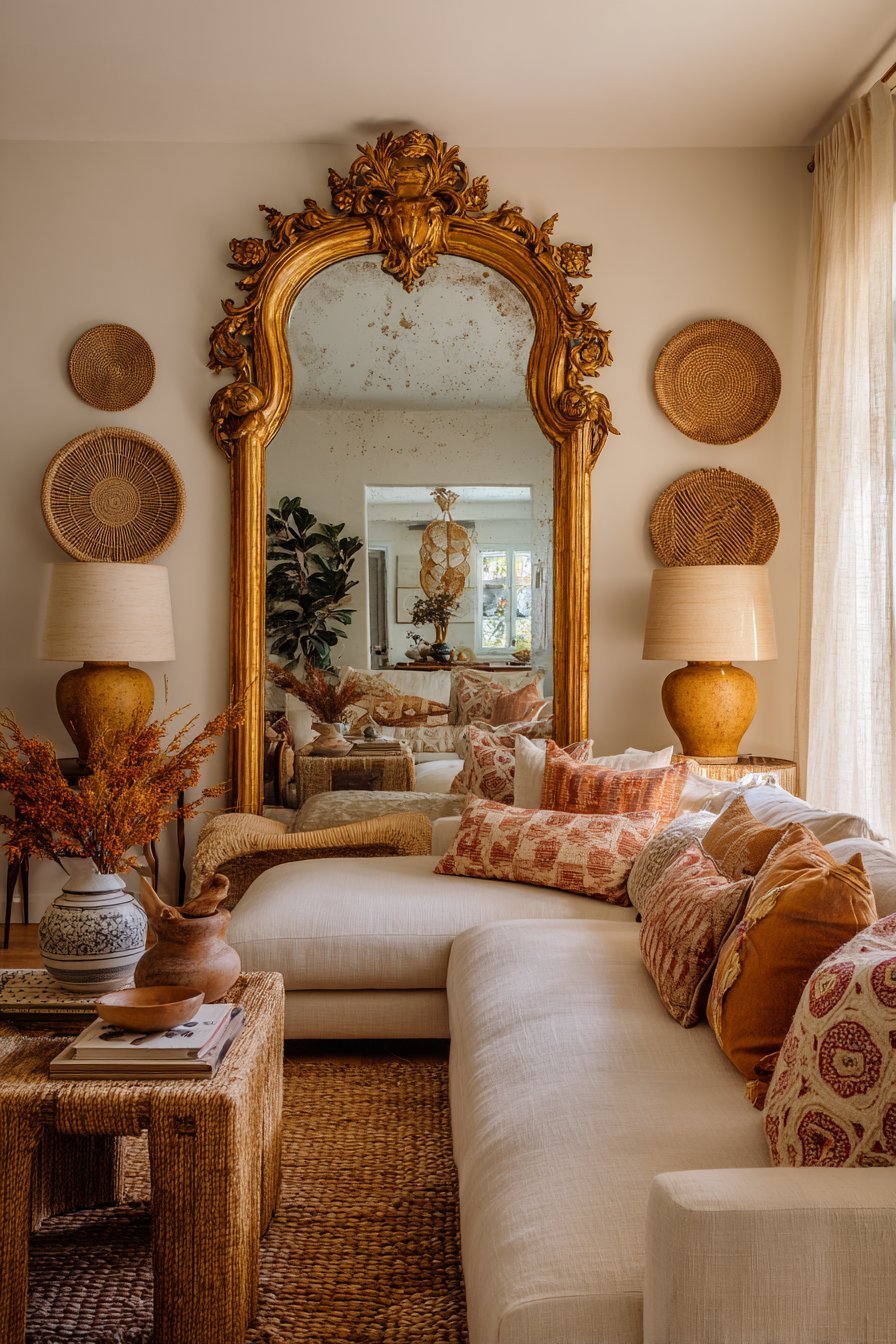 An ornate vintage gilt mirror commands attention above a low-profile cream linen sofa. The elaborate baroque-style frame features intricate carved details. This piece serves as the undisputed focal point of the bohemian living room. The mirror reflects a gallery wall of macramé hangings opposite.