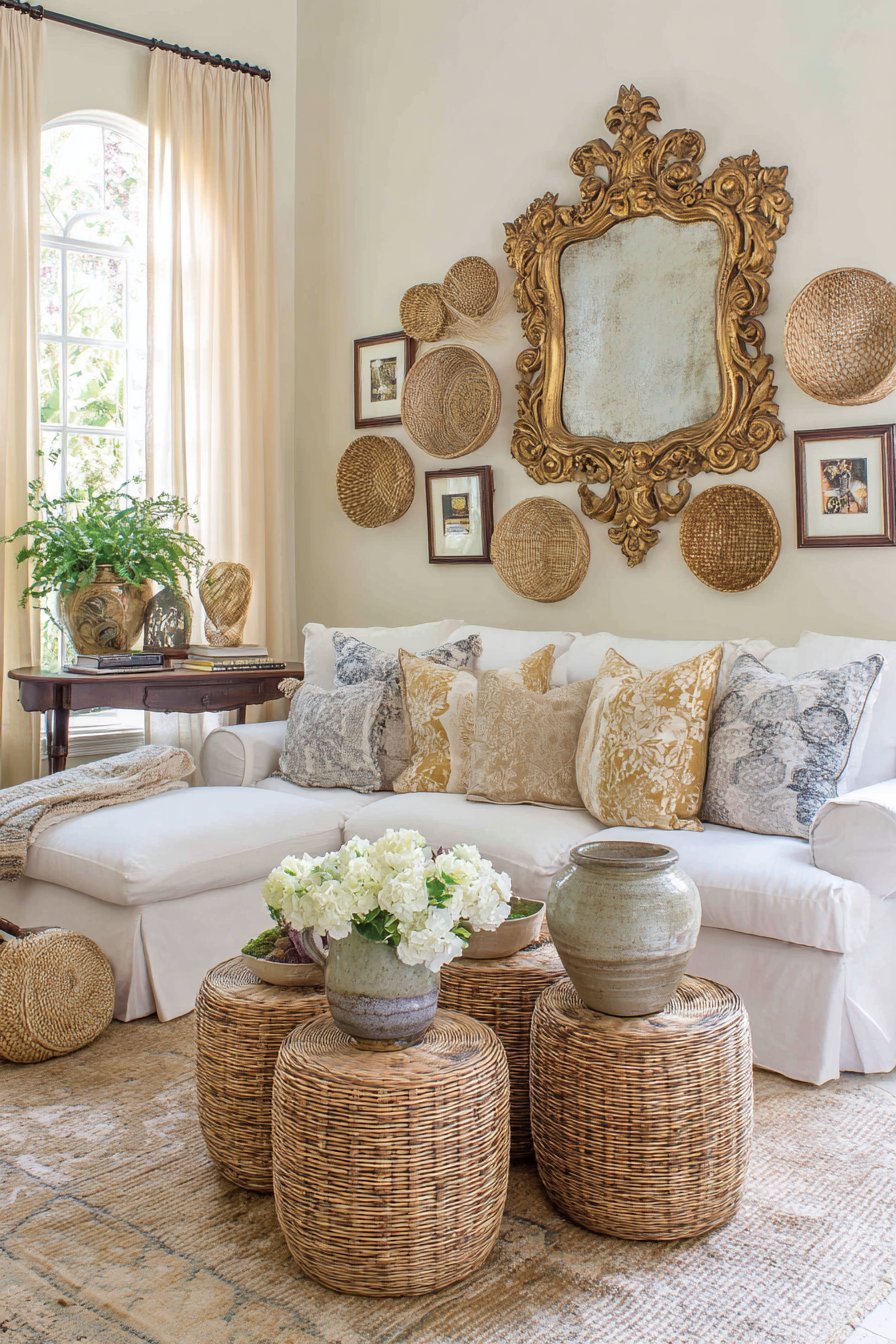 Layered textiles create warmth throughout this eclectic space. Patterned throw pillows in rich colors complement the neutral sofa. A jute rug provides earthiness beneath natural rattan side tables. Ceramic vessels in organic shapes add artisanal character.