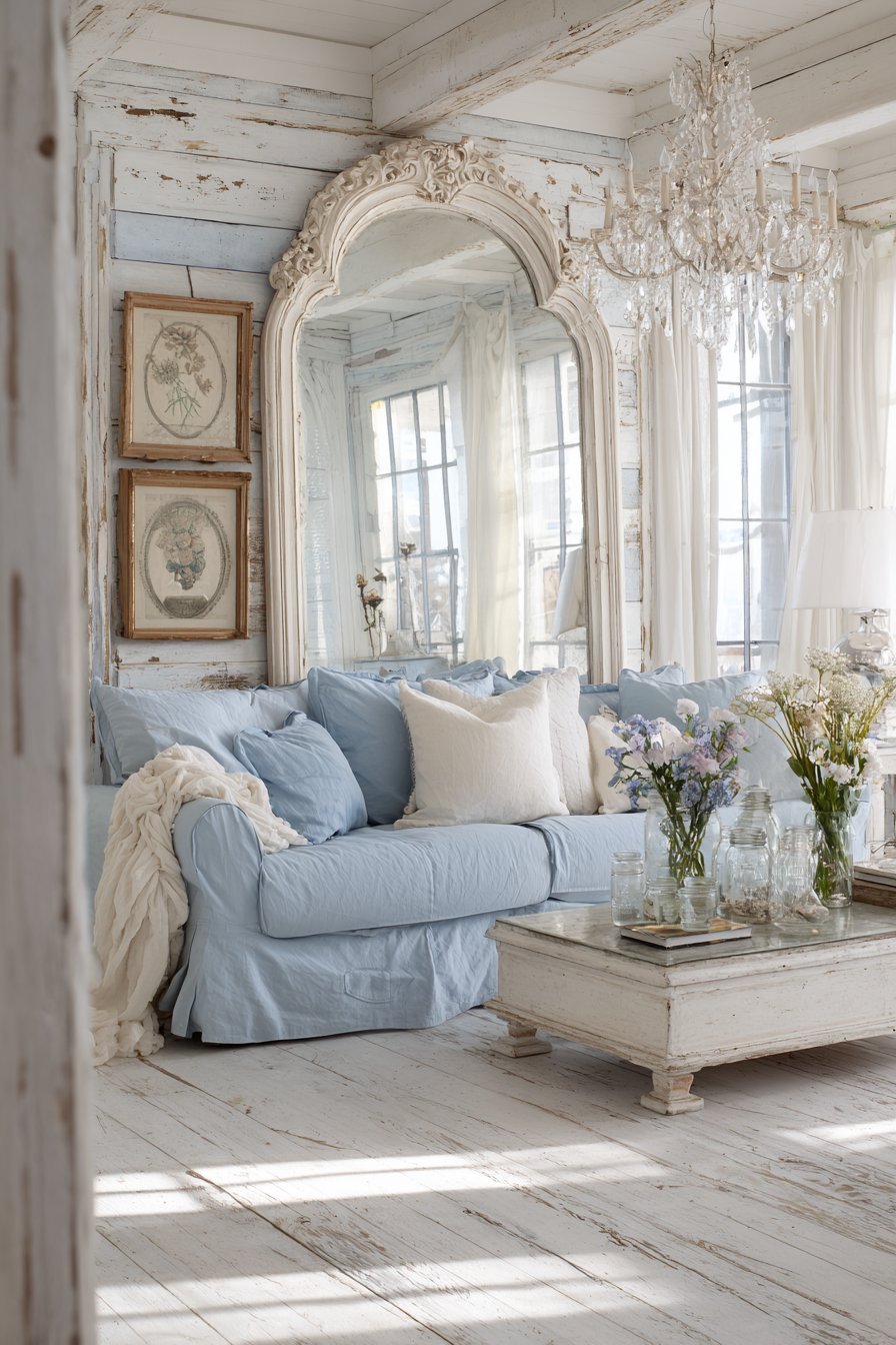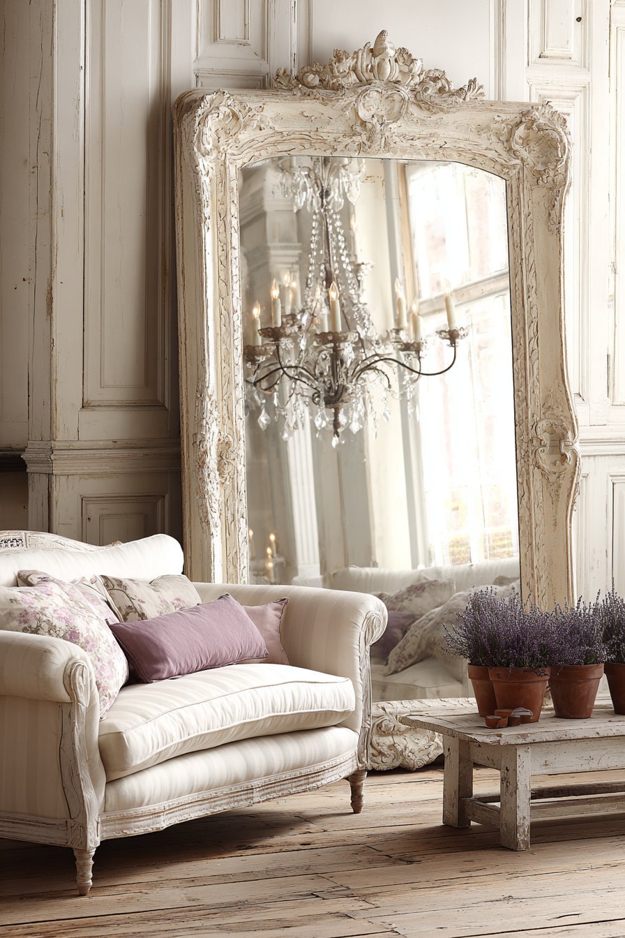 The mirror serves as refined centerpiece in country French scheme. Reflected candlelight creates romantic, intimate atmosphere. Every detail supports the provincial, pastoral aesthetic. The design celebrates rural French elegance and charm.