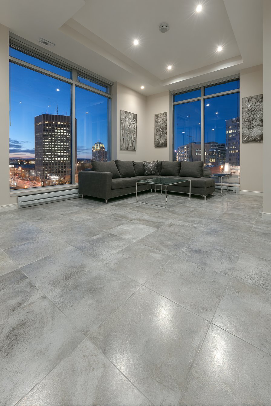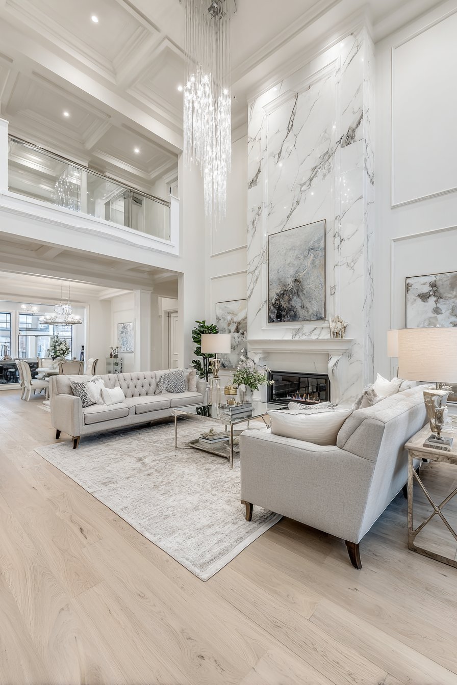 Neutral area rug covers engineered oak flooring in natural finish. Balanced symmetrical styling includes matching table lamps throughout. Controlled lighting prevents glare while highlighting beveled edges. The beveled edge craftsmanship catches light beautifully.
