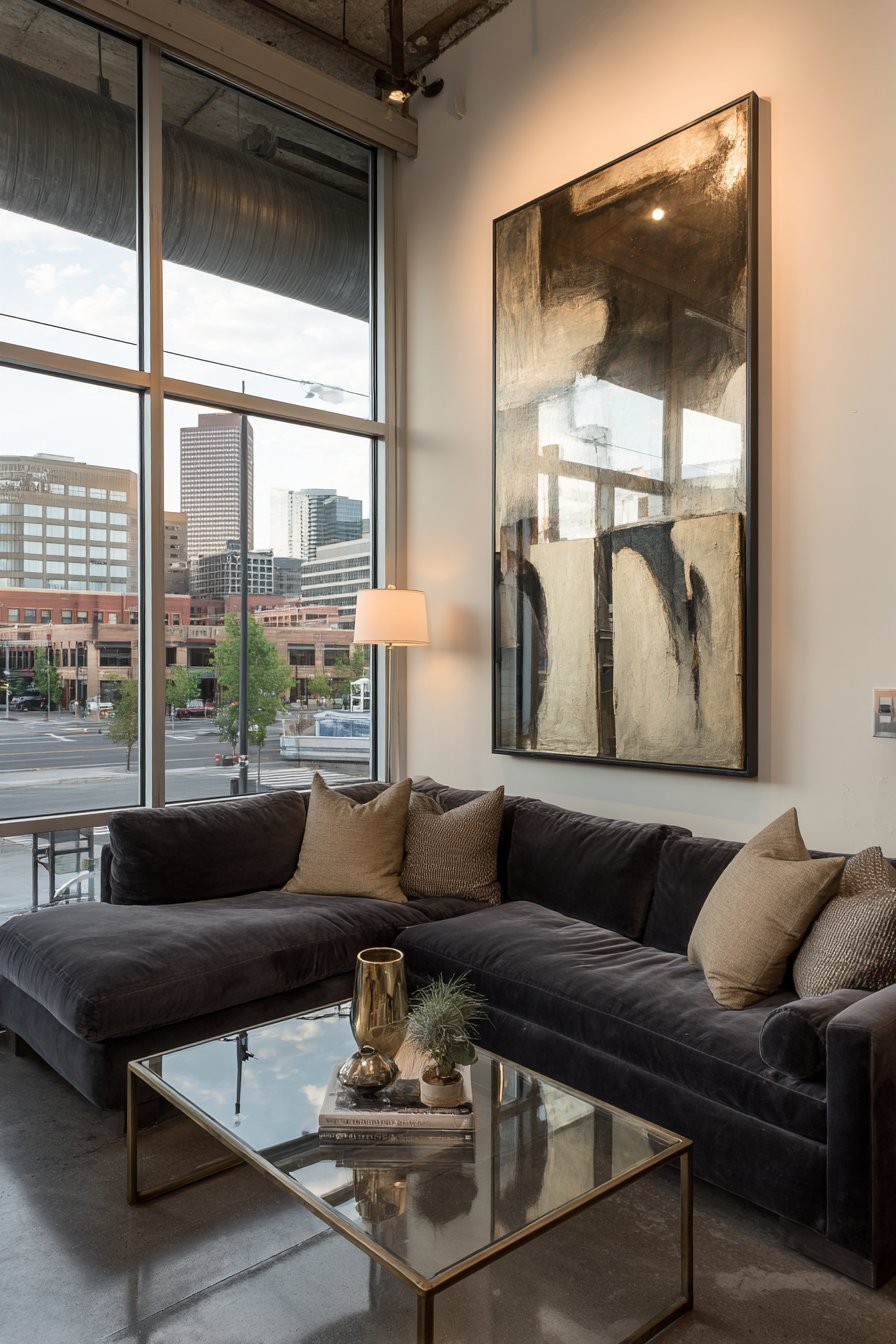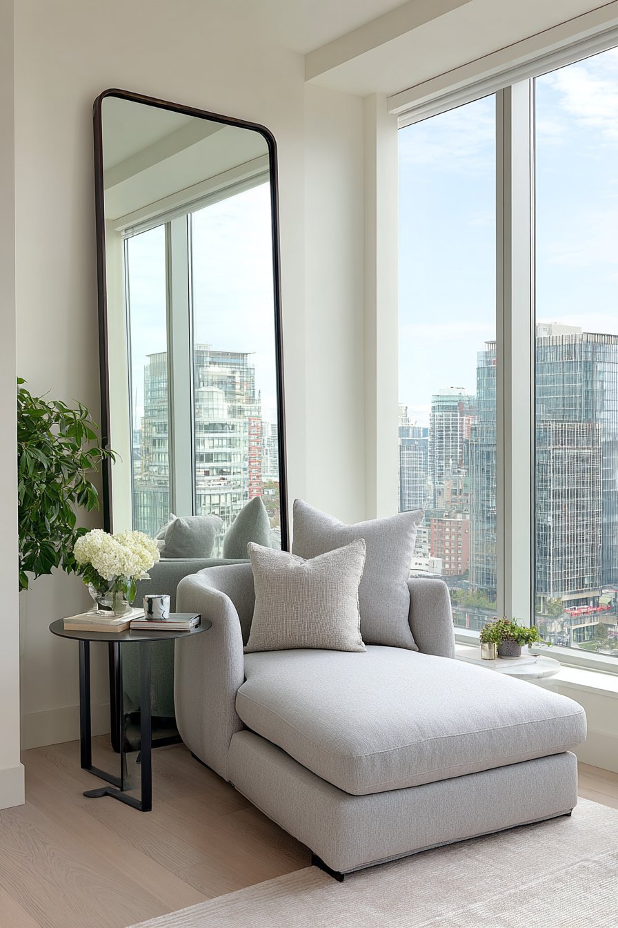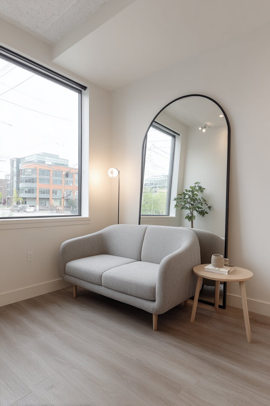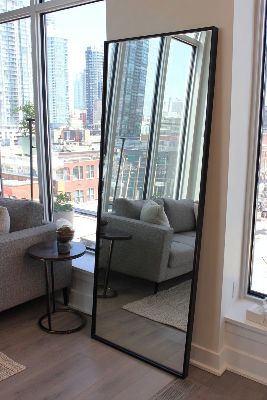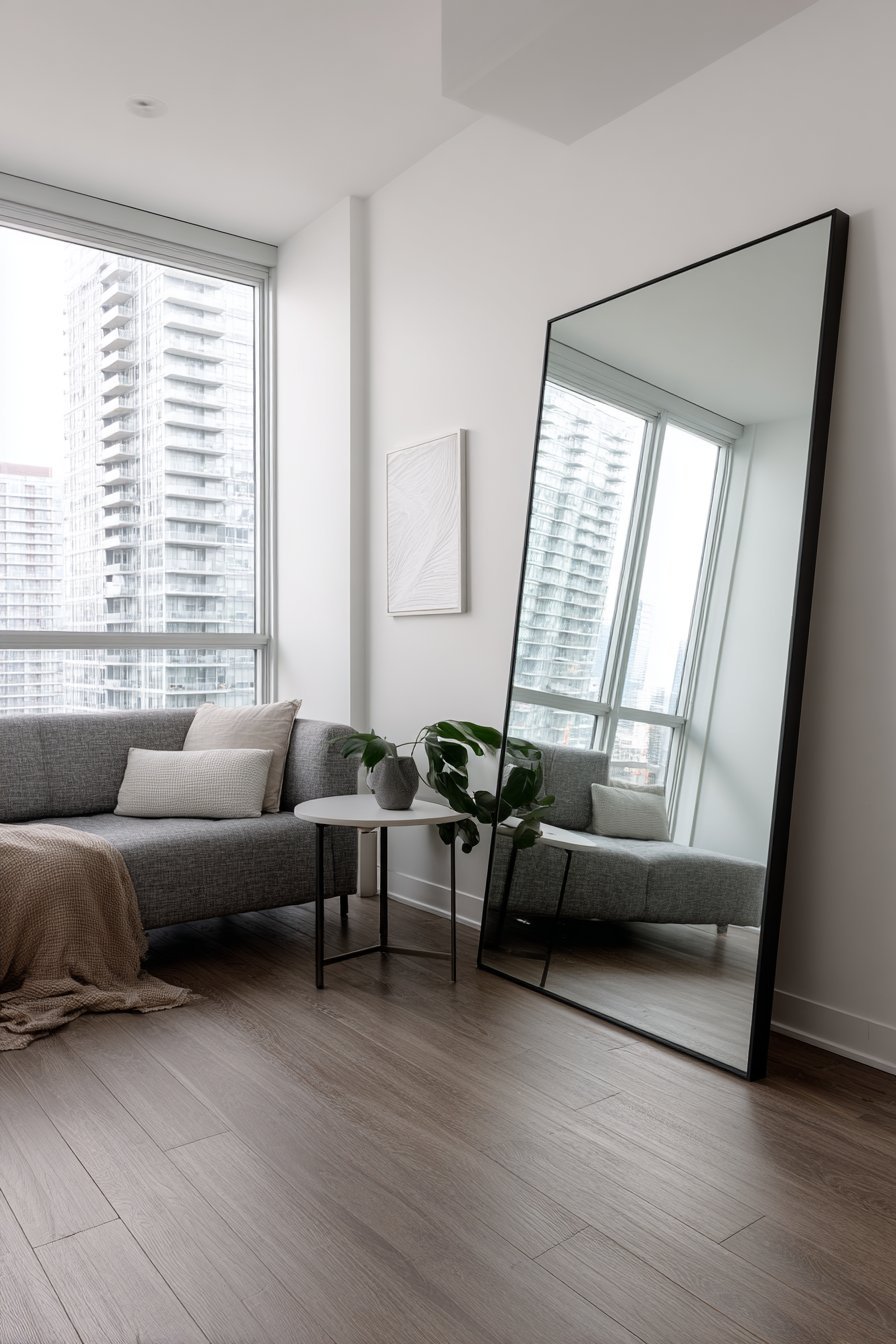 An oversized floor mirror with slim black metal frame leans opposite window. This strategic placement maximizes natural light reflection in small urban living room. The mirror sits beside compact grey loveseat, reflecting room back. This creates convincing illusion of expanded space.