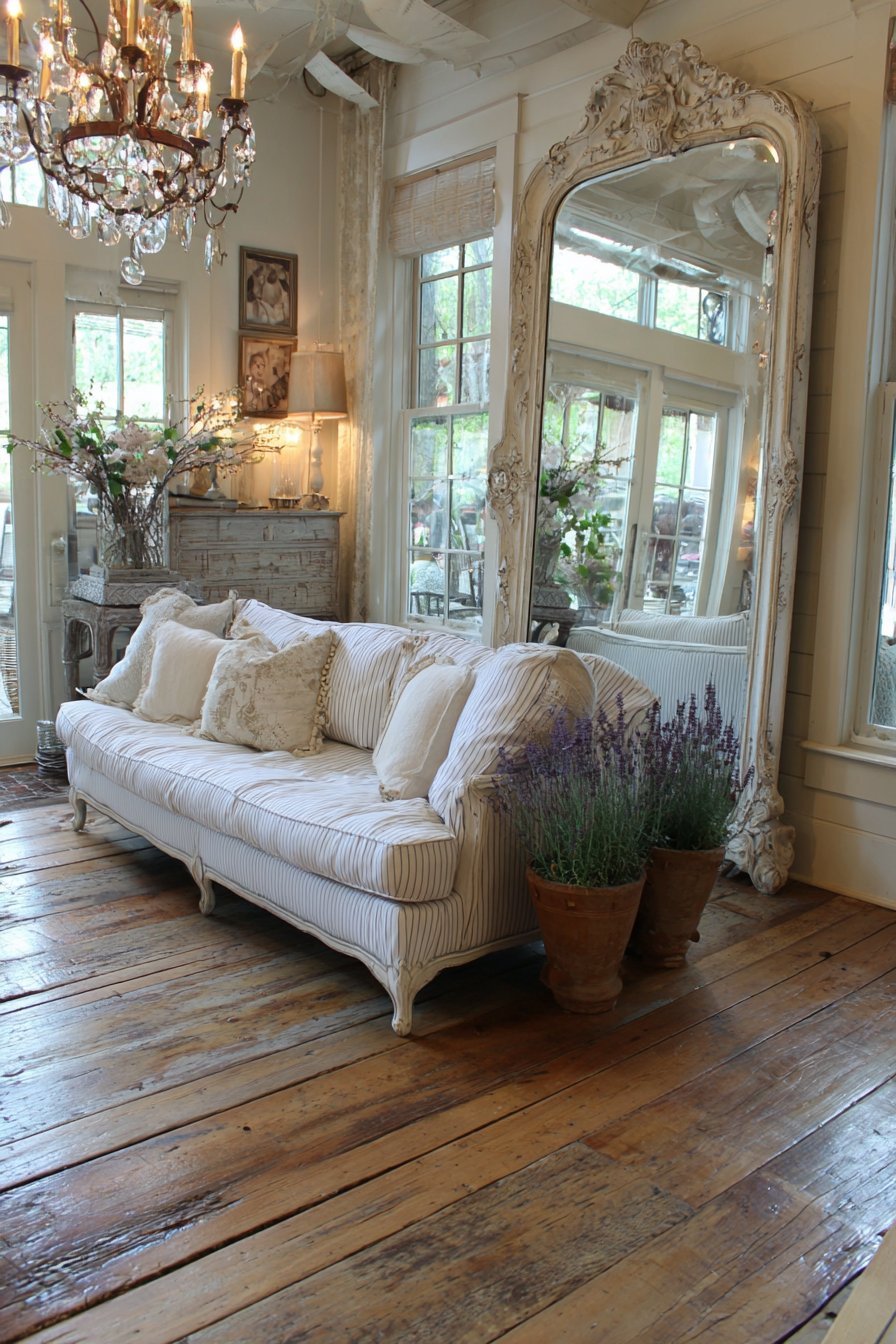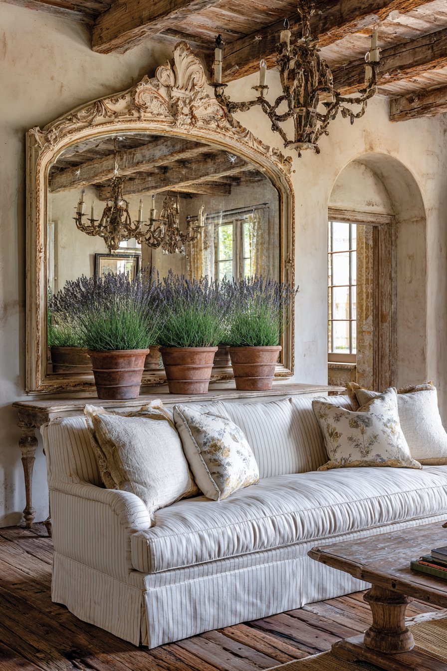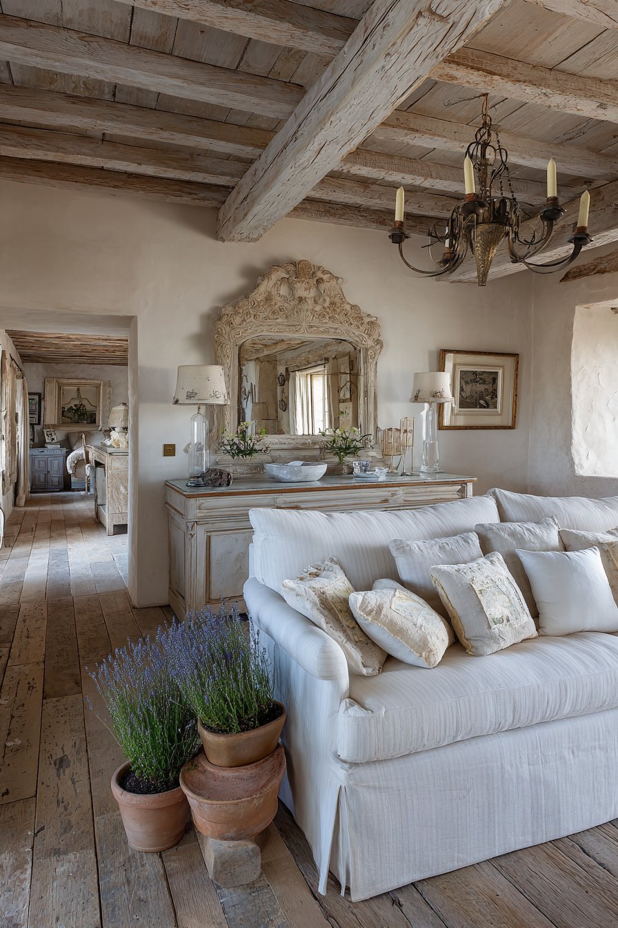 Distressed whitewashed console table beneath holds lavender in terracotta pots. Wide-plank oak flooring features hand-scraped texture underfoot. Toile fabric throw pillows add provincial charm throughout. Soft diffused natural light creates gentle romantic reflections.