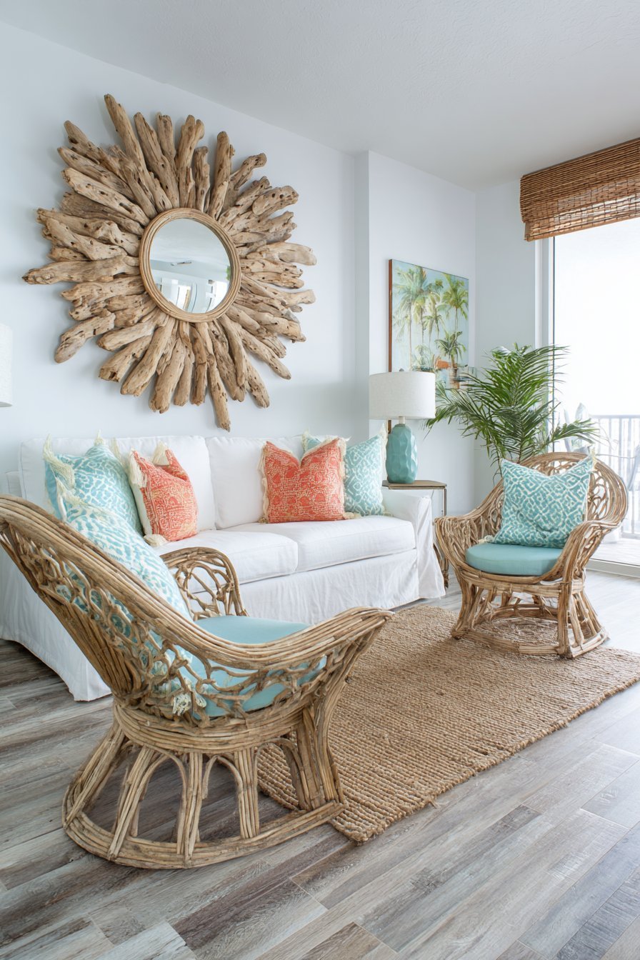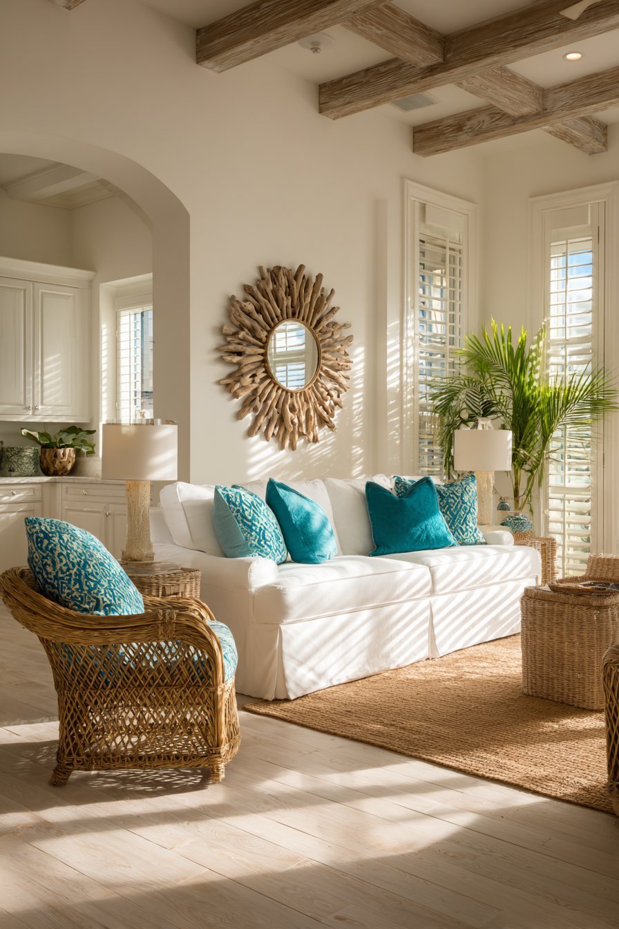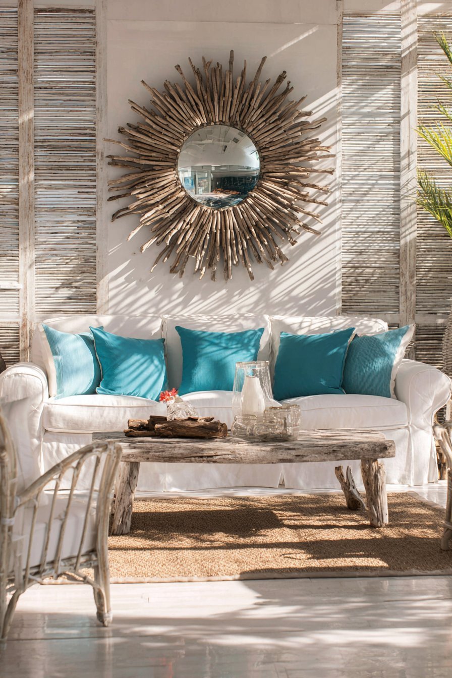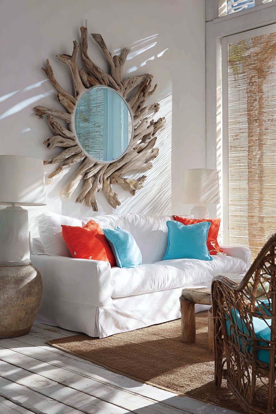A driftwood-framed mirror features naturally weathered wood pieces arranged organically. The sunburst pattern radiates around round central mirror. This hangs above white slipcovered sofa with turquoise and coral pillows. Rattan peacock chairs and palm frond shadows create island ambiance.
