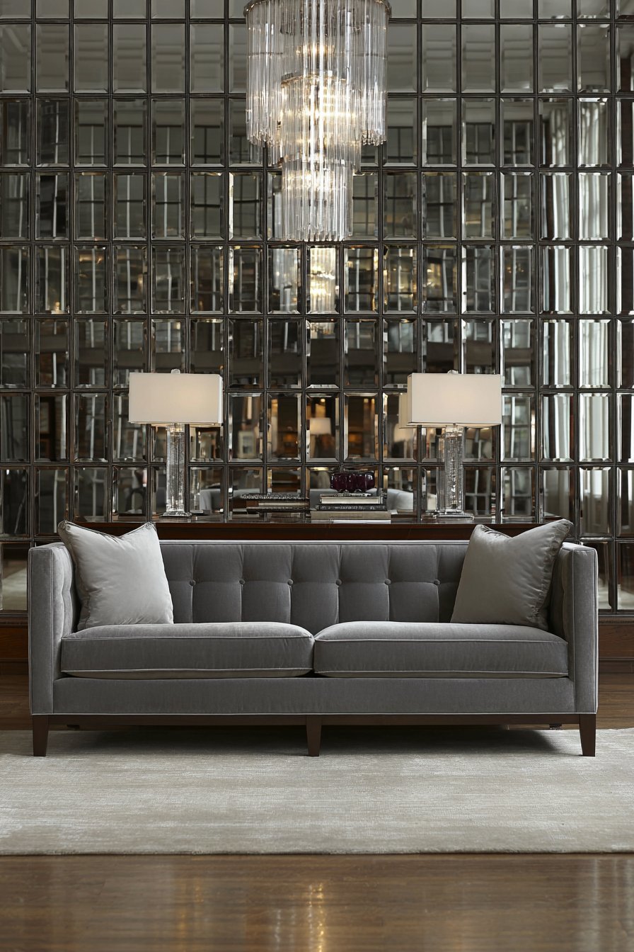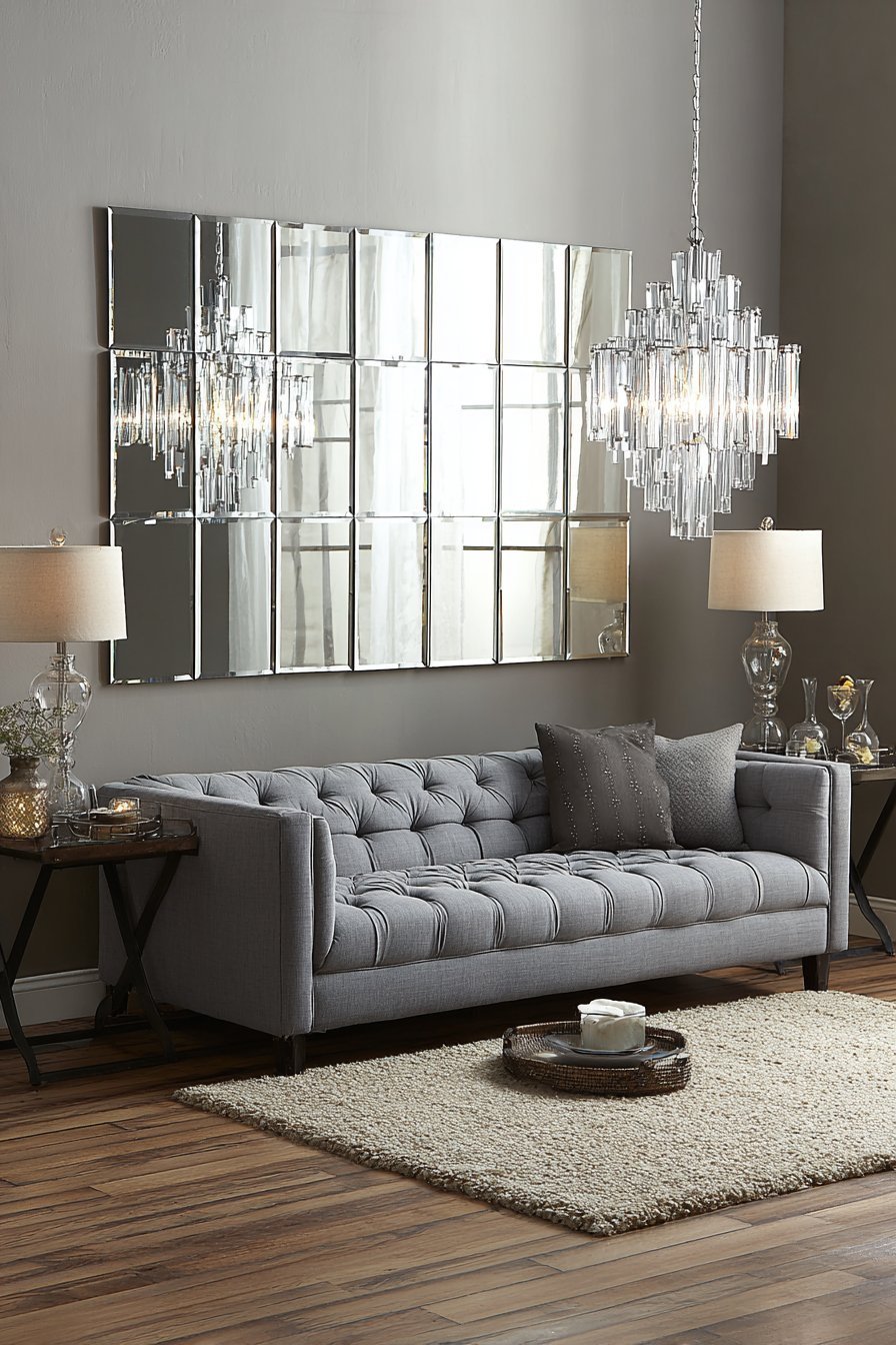 Beveled mirror panel wall installation creates sophisticated grid pattern. Slim chrome channels separate each mirror panel precisely. The mirrors reflect modern crystal linear chandelier creating luxury. This sits above tufted grey linen sofa in a transitional space.