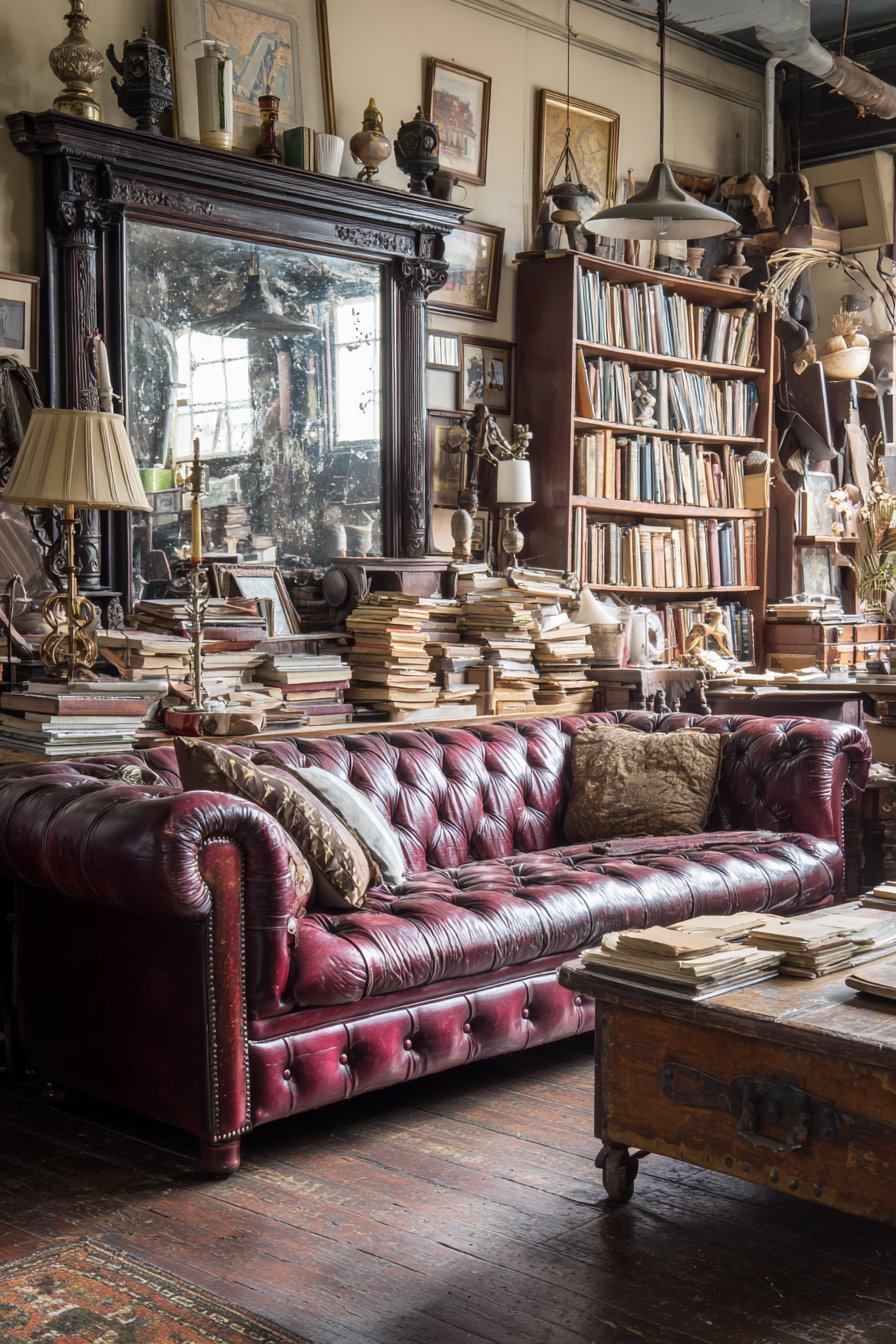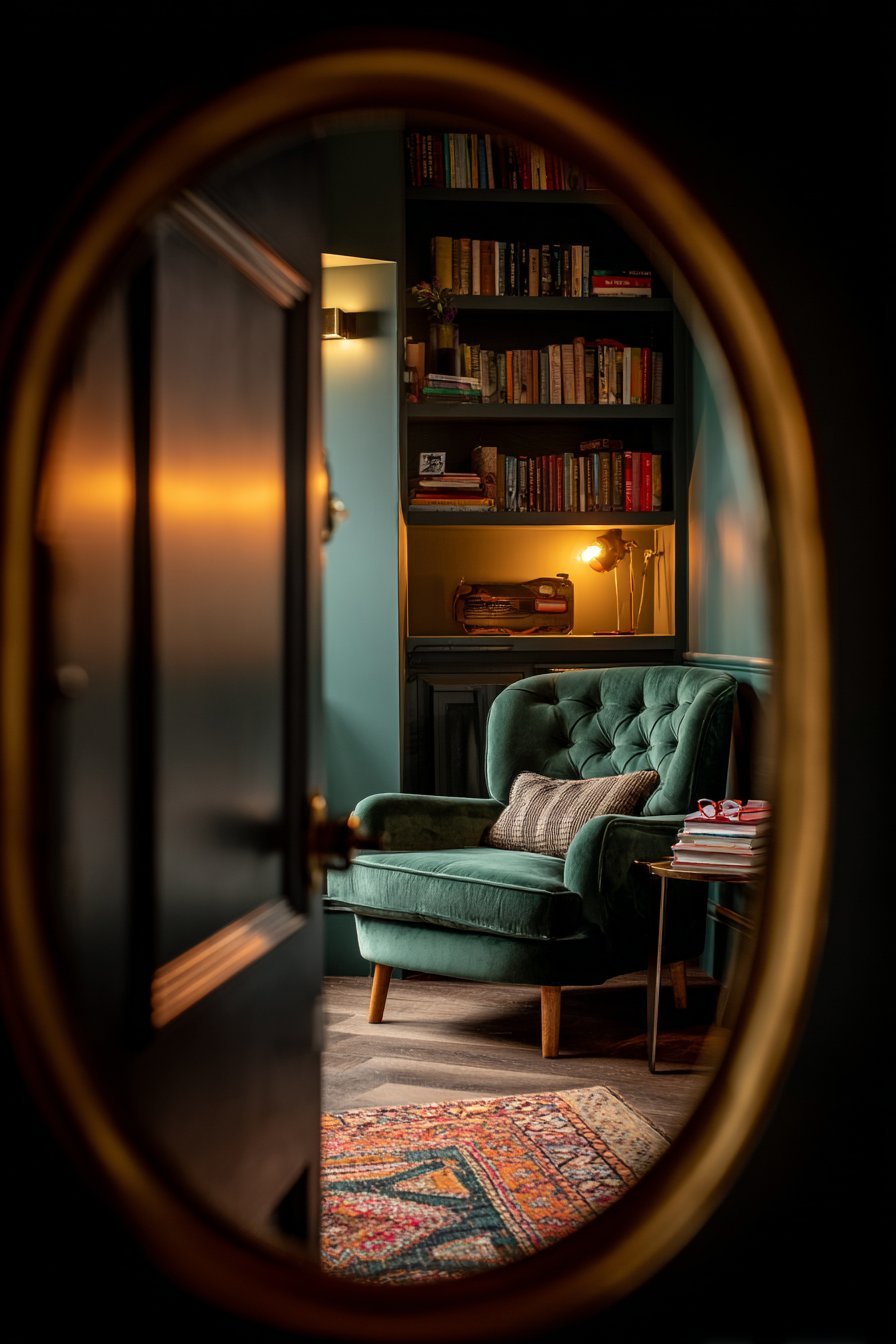 The mirror enhances the cozy, literary character beautifully. Reflected bookshelves multiply the room’s intellectual atmosphere. Every element supports the contemplative reading retreat. The design celebrates quiet comfort and literary pursuit.
