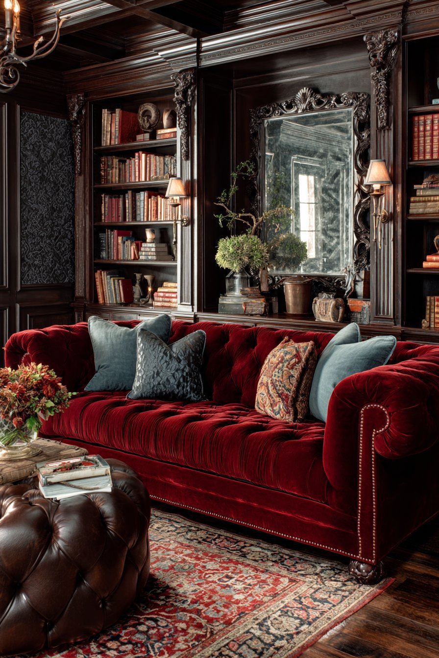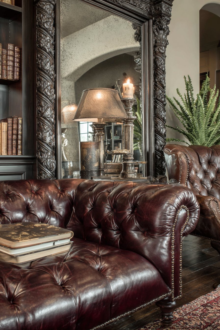 An antique mercury glass mirror shows authentic age spots and silvering variations. The carved mahogany frame features Renaissance revival details throughout. This hangs above burgundy velvet Chesterfield sofa with deep tufting. Persian rugs layer over dark stained oak flooring.