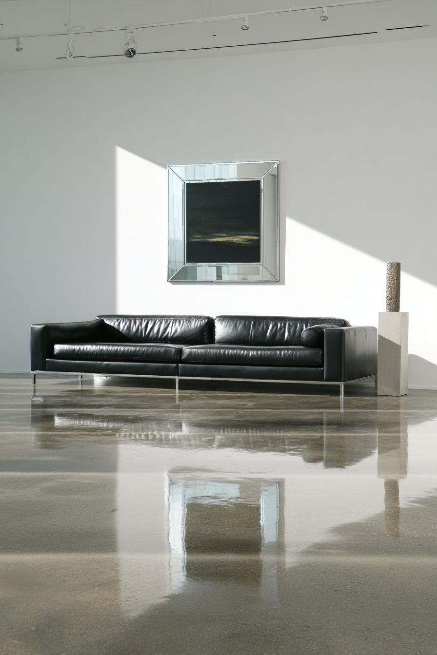 Polished concrete flooring in natural grey grounds the monochromatic scheme. Single statement sculpture sits on minimalist side table alone. Clean bright natural light creates sharp reflections without distortion. The minimal frame allows mirror to function as reflection and art.