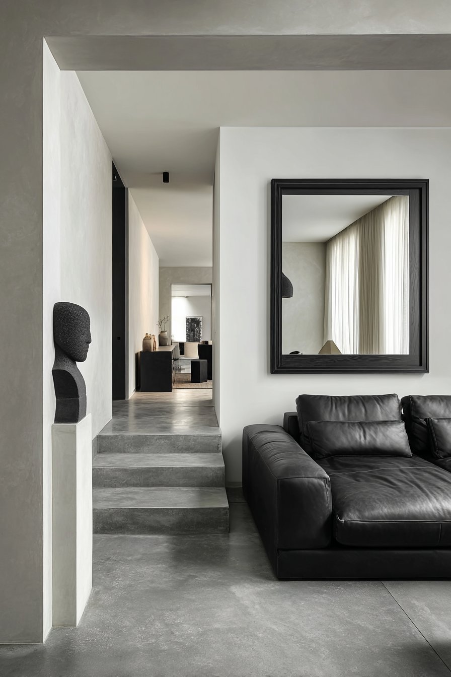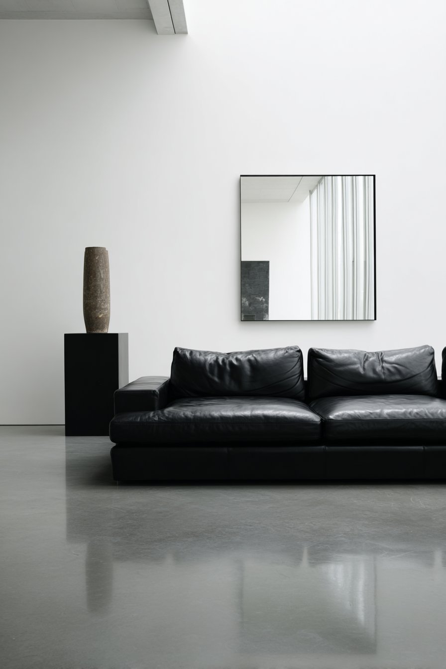 A large square mirror features ultra-thin black aluminum frame. The minimal frame creates floating appearance on white wall. This sits above low-profile black leather sofa in stark space. The mirror reflects the room’s disciplined black and white palette.