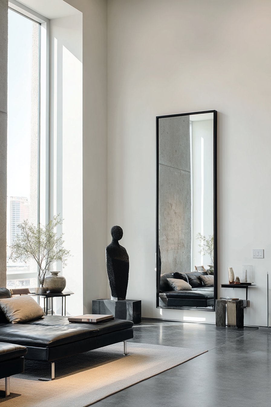 The slim black frame provides definition without visual weight. This allows maximum reflective surface within minimal footprint. The floor-leaning position feels casual yet intentional. This approach works perfectly in compact urban apartments.