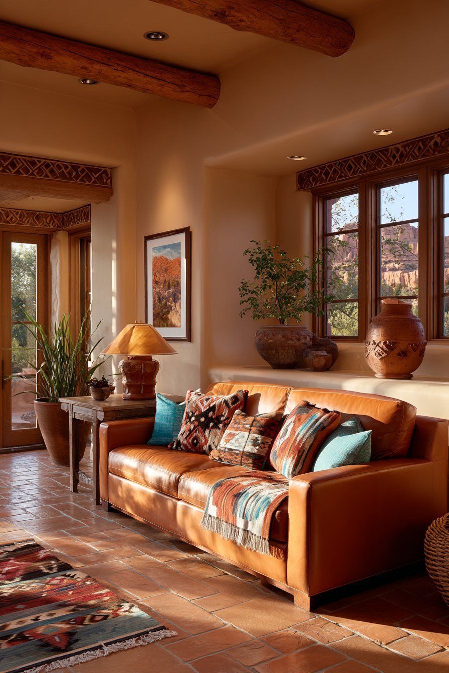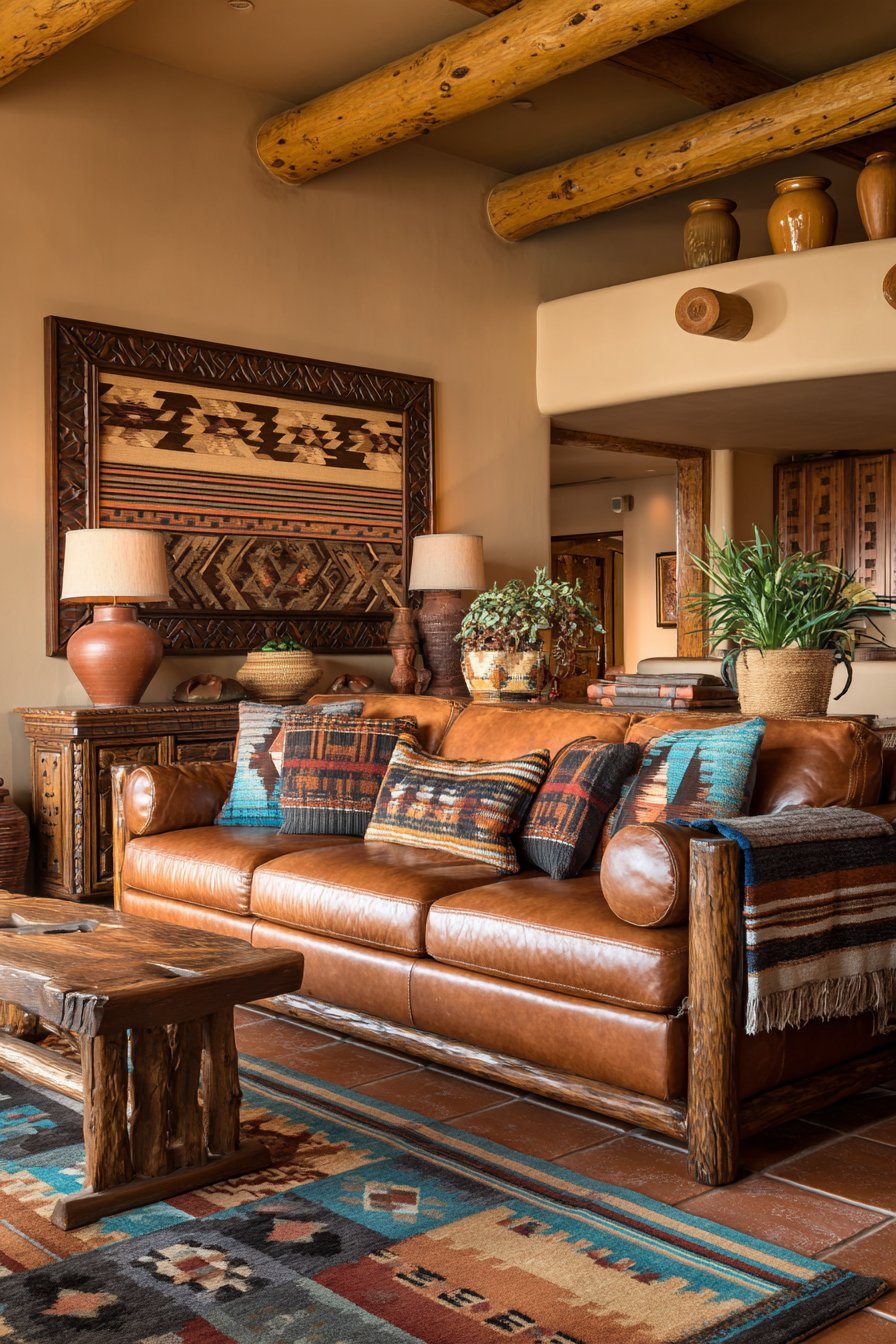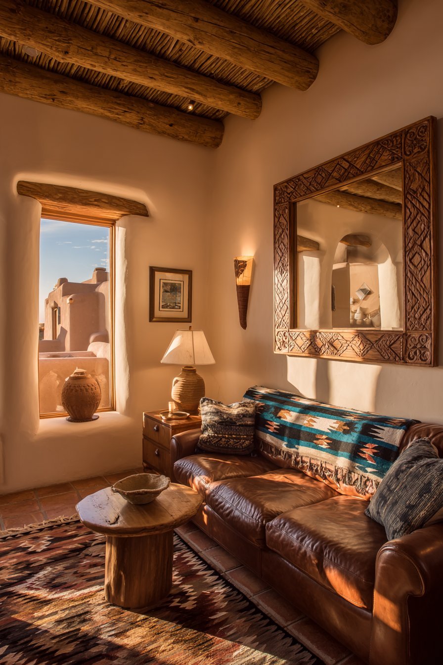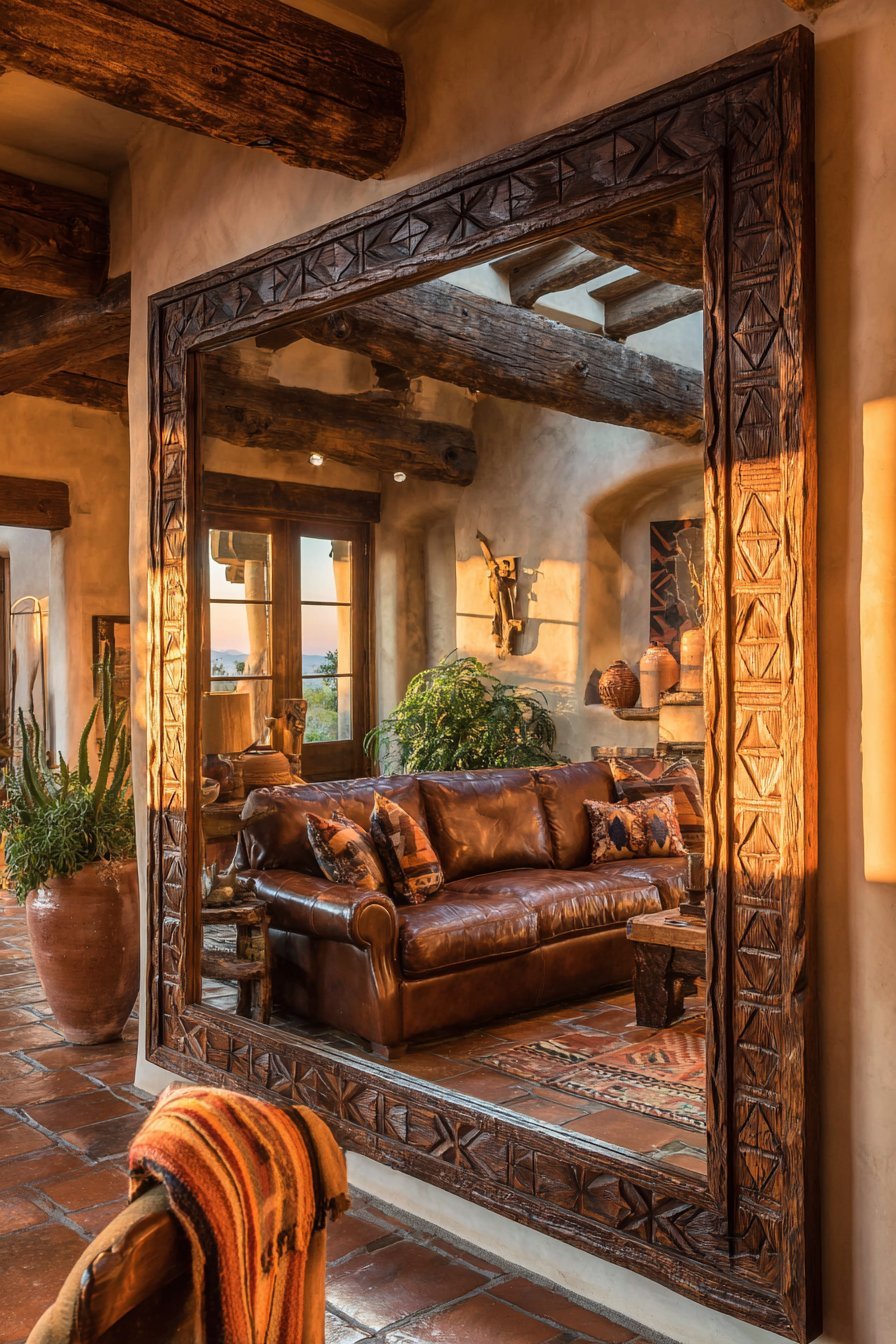 A mirror features hand-carved wood frame with Native American-inspired patterns. Traditional geometric designs demonstrate cultural artistry and craftsmanship. This displays above low-slung leather sofa with Pendleton wool blankets. The mirror reflects terracotta pottery and woven baskets.
