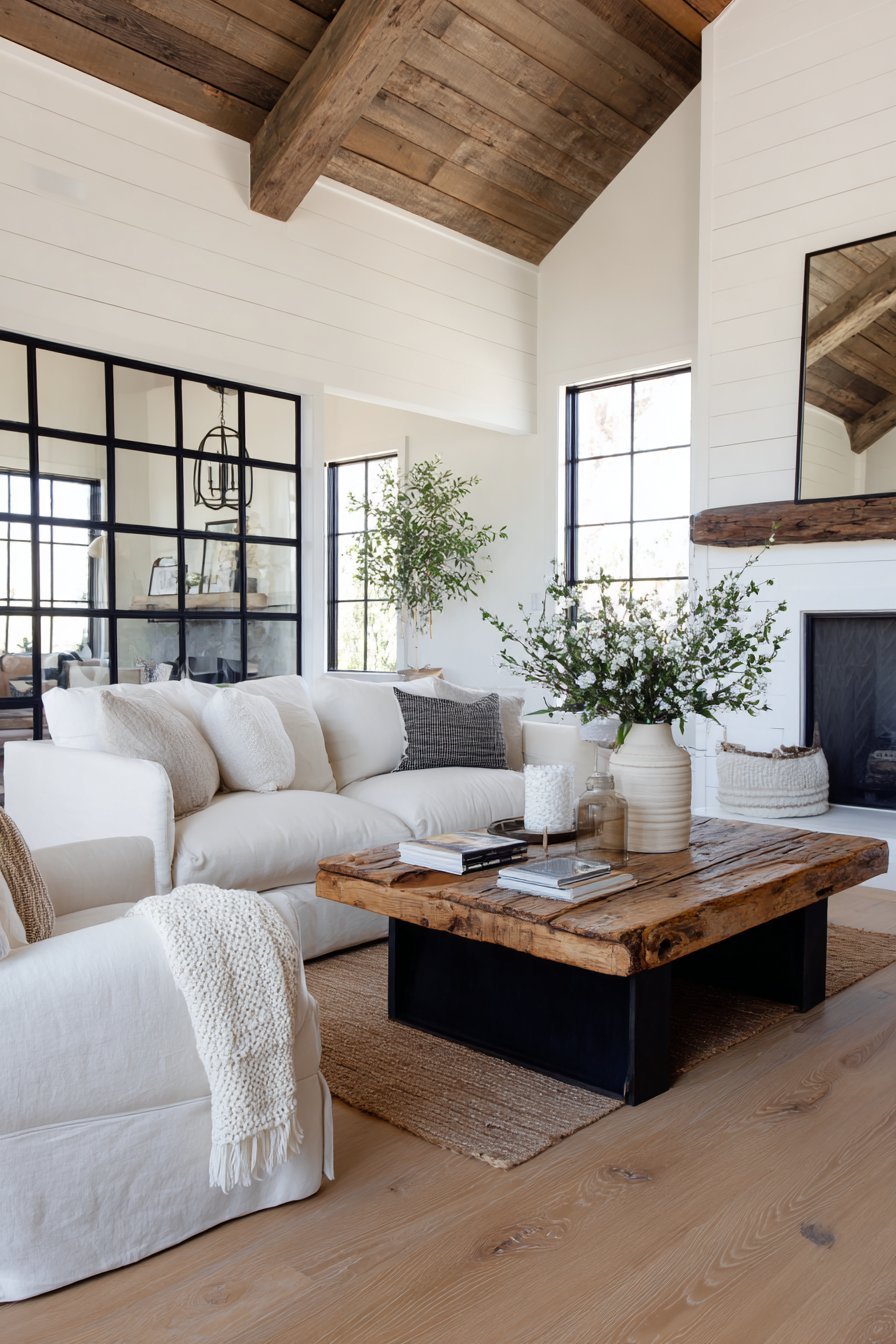 Reclaimed wood coffee table sits on jute rug over white oak flooring. Natural light from actual windows mirrors in reflection creating luminosity. The leaning position adds relaxed modern farmhouse charm. Black metal frame provides industrial character against white shiplap.