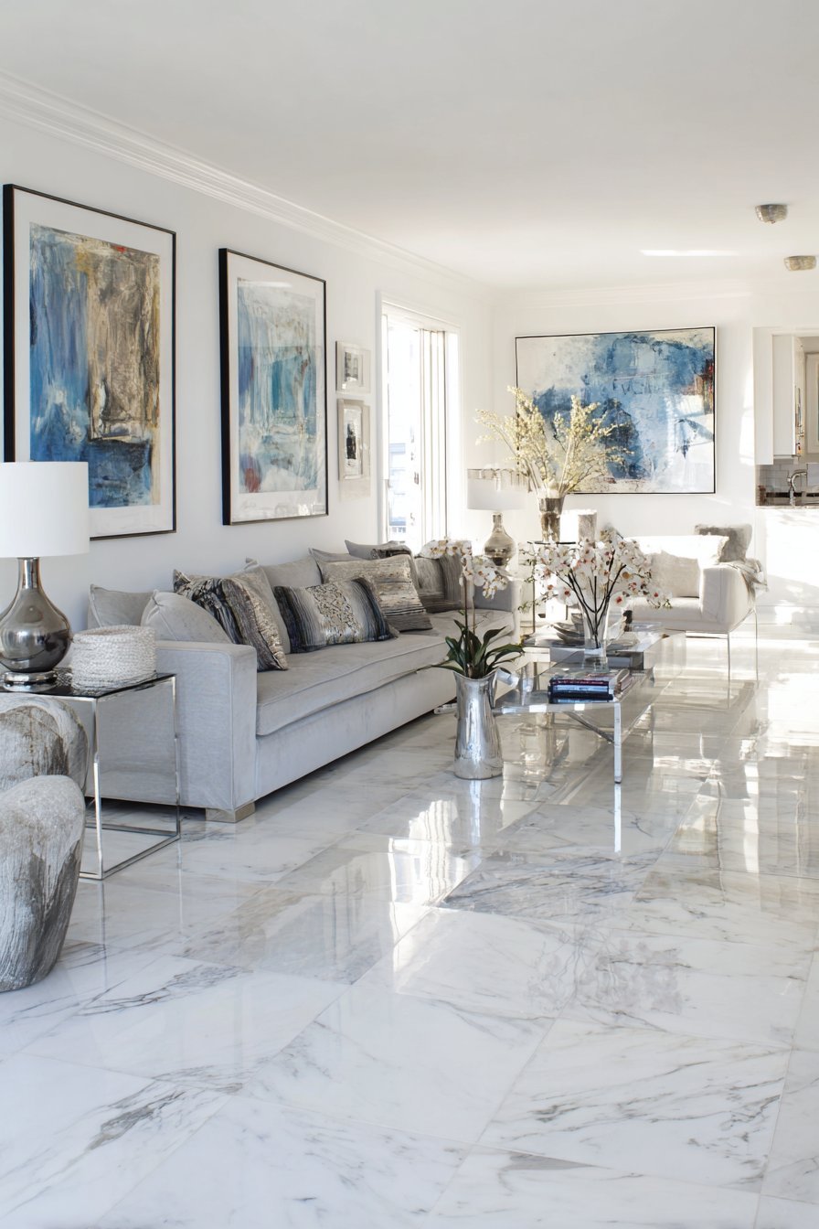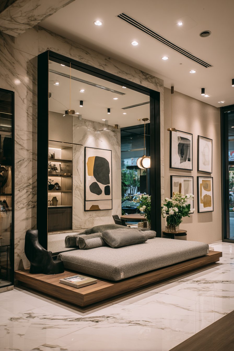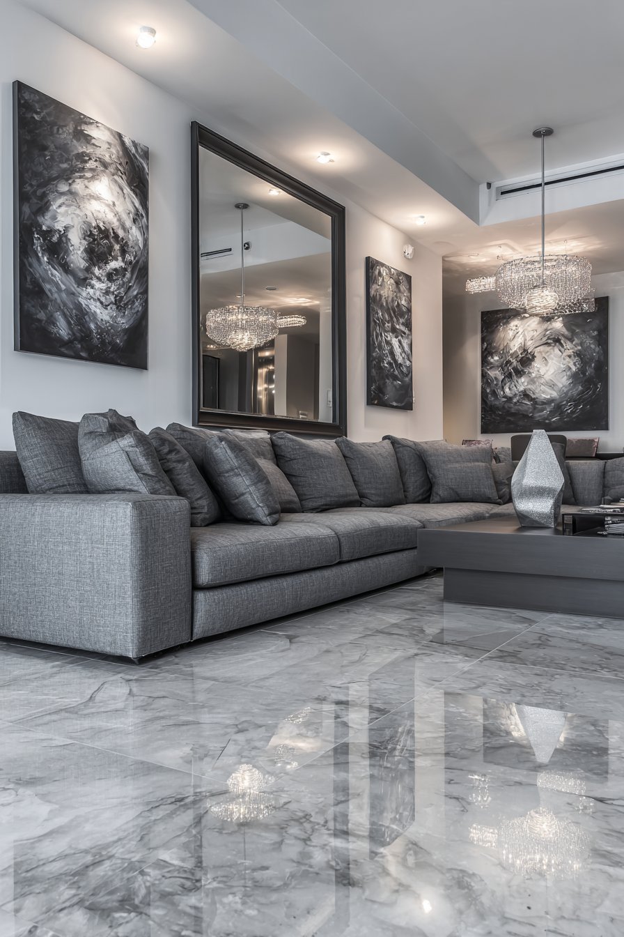 An oversized modern mirror features wide matte black frame. The bold statement piece sits above low-profile grey platform sofa. The mirror reflects contemporary abstract paintings creating layered art views. Polished white marble flooring shows subtle grey veining.
