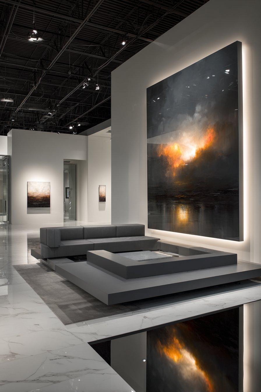 The installation suits spaces treating design as curated art. The reflected paintings create fascinating layered compositions. Every element demonstrates commitment to gallery-quality presentation. The design elevates everyday living to museum-quality experience.