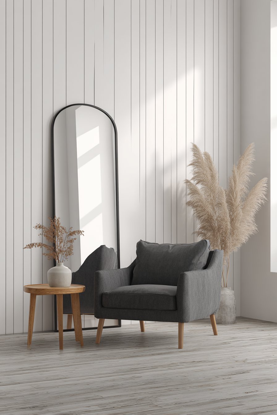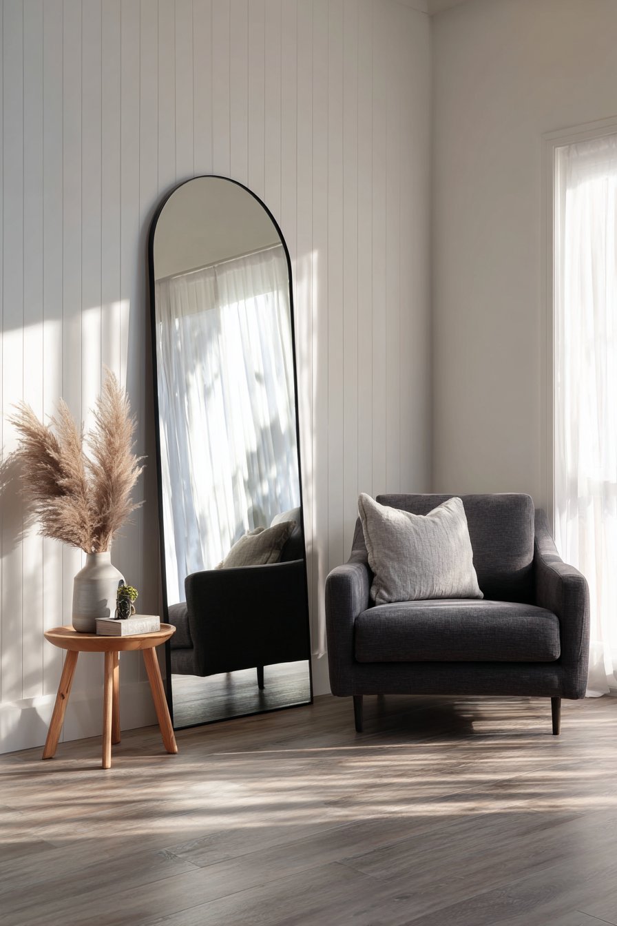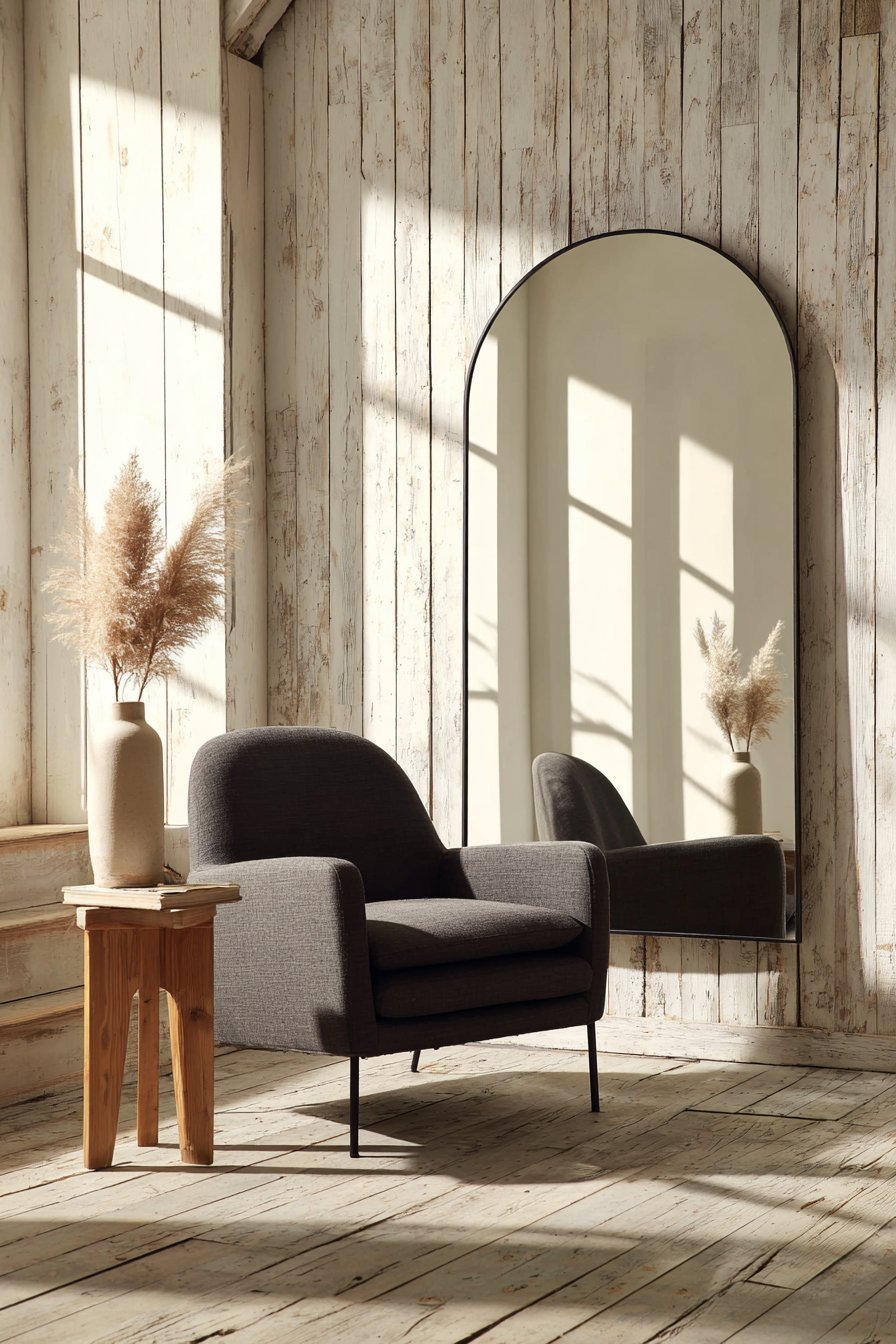 A full-length arched mirror leans gracefully against white shiplap wall. The thin black metal frame provides subtle definition without overwhelming. This is positioned beside a charcoal grey mid-century modern armchair creates balance. The rounded top softens the angular furniture beautifully.