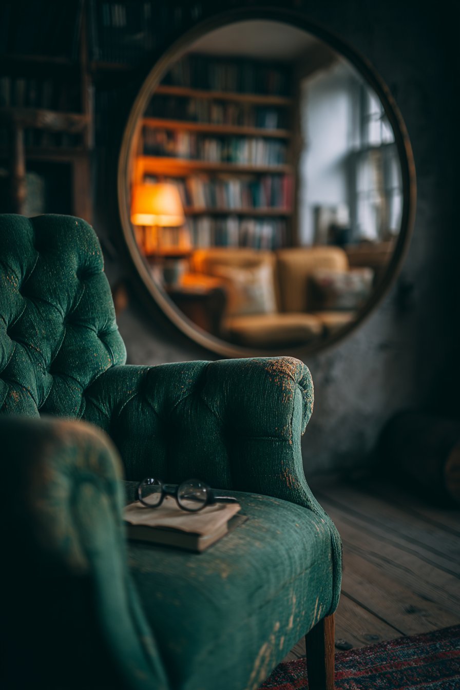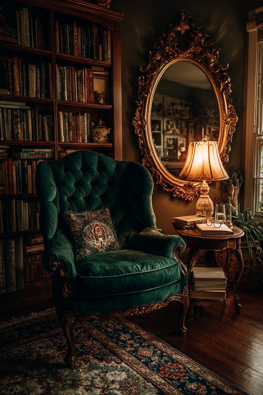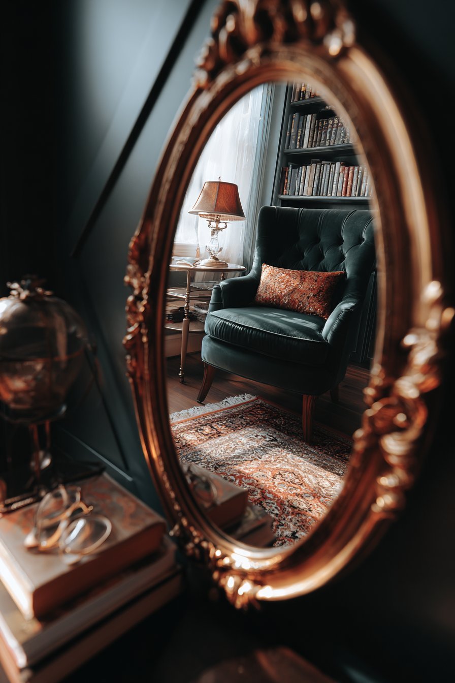 A vintage-style oval mirror features an antiqued brass frame with gentle patina. This hangs above tufted velvet armchair in forest green. The mirror reflects wall of built-in bookshelves and reading lamp. Layered vintage rugs in jewel tones cover dark walnut flooring.