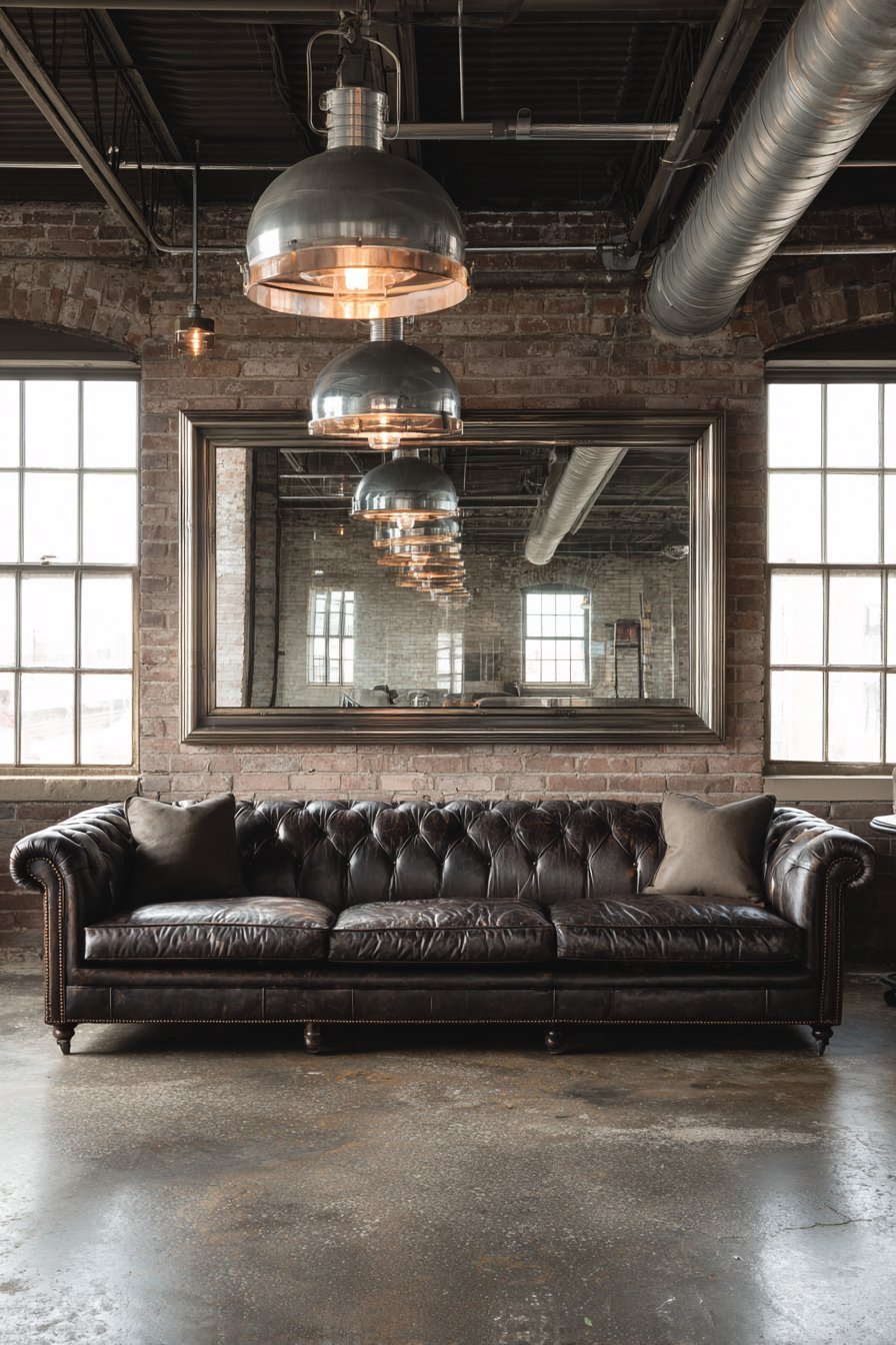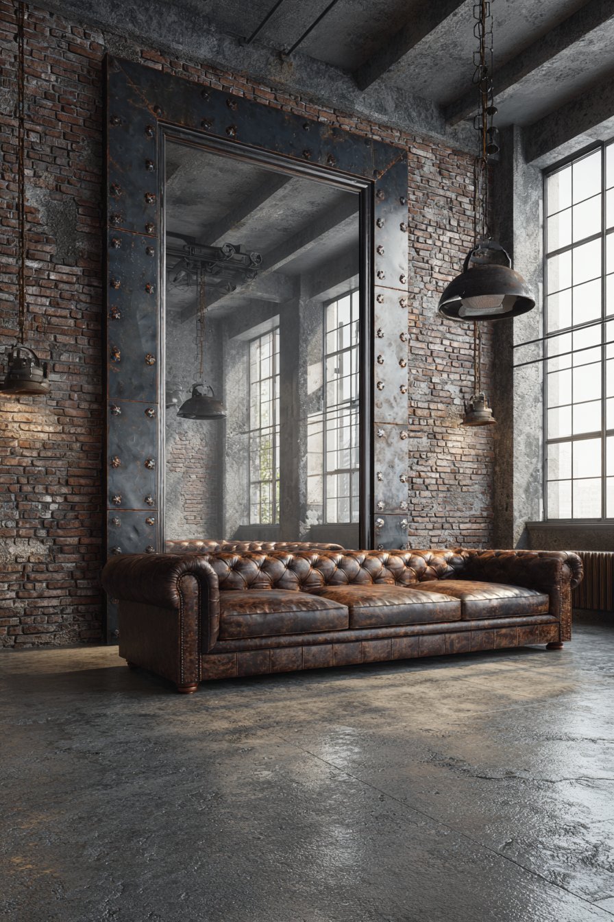 Balanced natural light from large industrial windows illuminates the space. The steel frame’s substantial presence matches the room’s architectural weight. The mirror doesn’t shy away from showing its construction methods. This honesty about materials defines authentic industrial design.