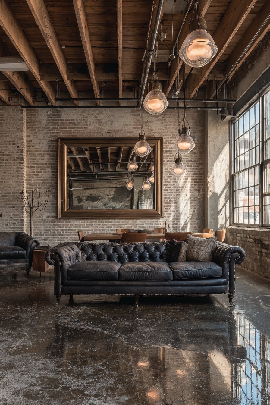 Metal factory-style pendant lights appear in the mirror’s reflection. Concrete polished floors show natural variations and honest imperfections. The mirror amplifies the warehouse aesthetic throughout the space. Every reflected element reinforces the industrial design language.
