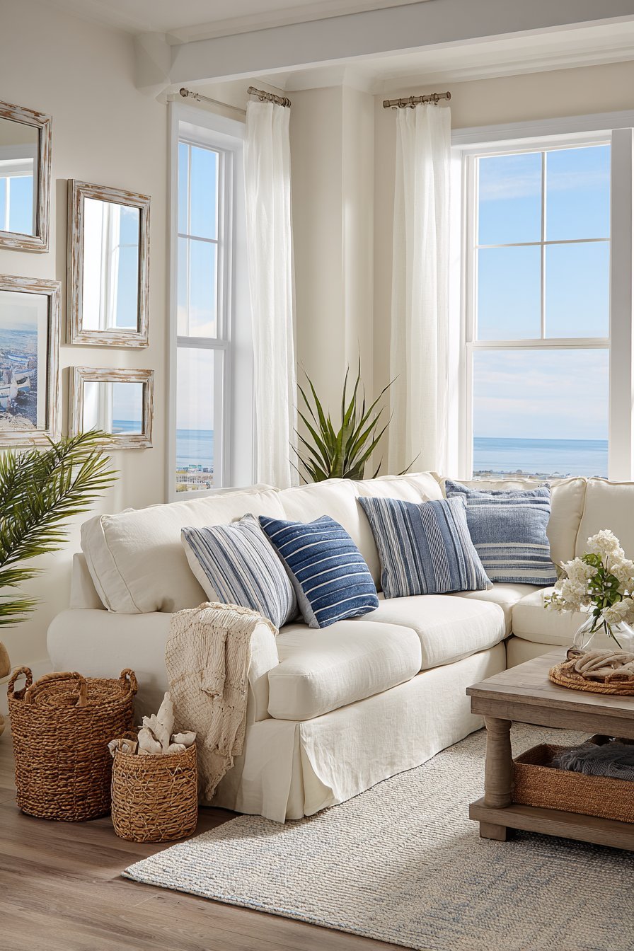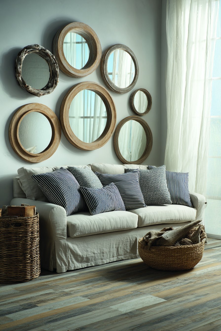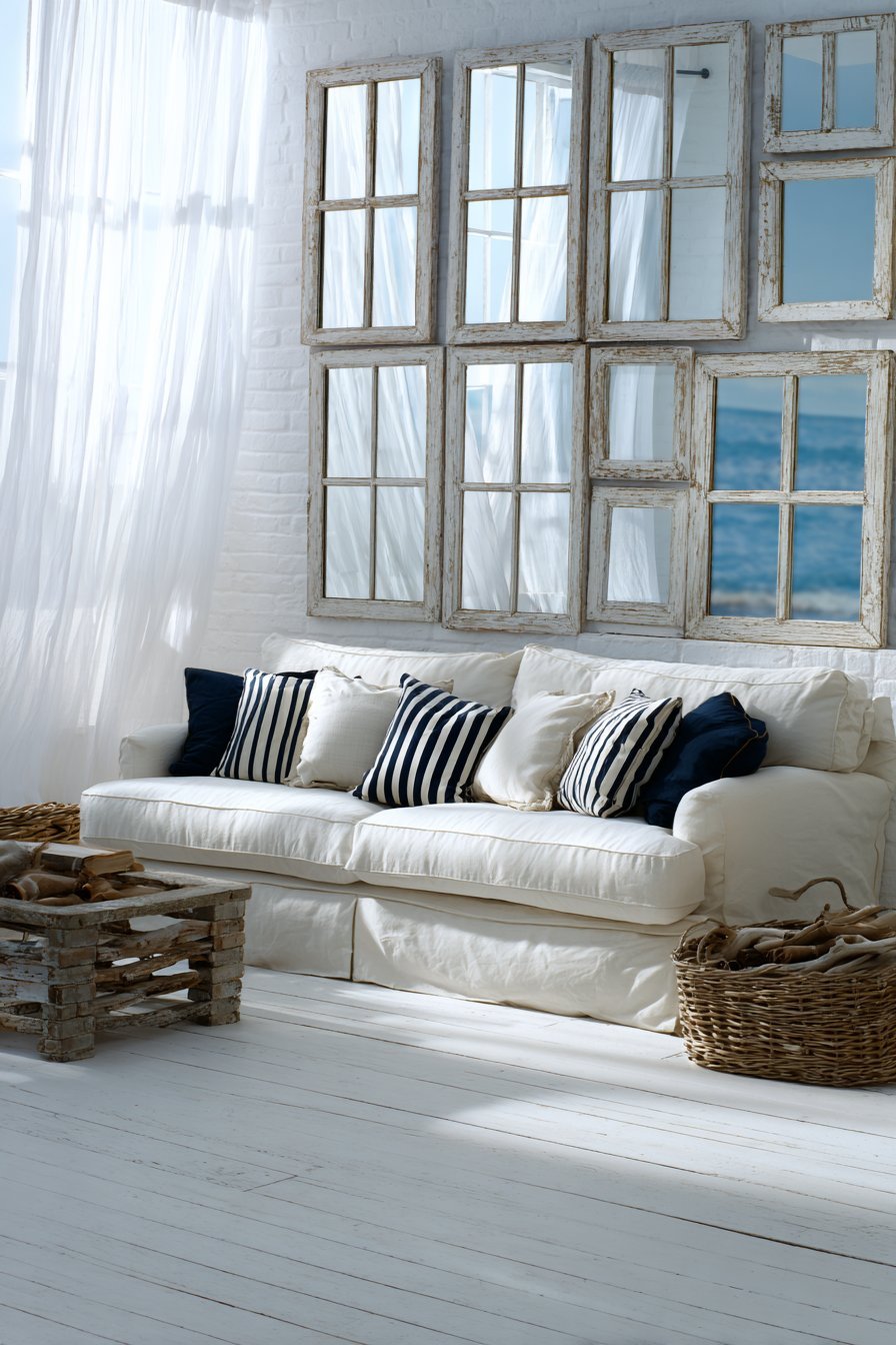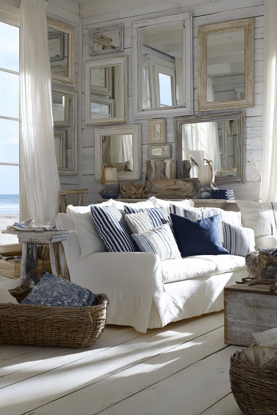 Multiple whitewashed wooden-framed mirrors cluster organically above natural linen slipcover sofa. The varying sizes create gallery-style composition that feels collected over time. Navy and white striped pillows introduce nautical elements. Driftwood accents and sea grass baskets add coastal texture.