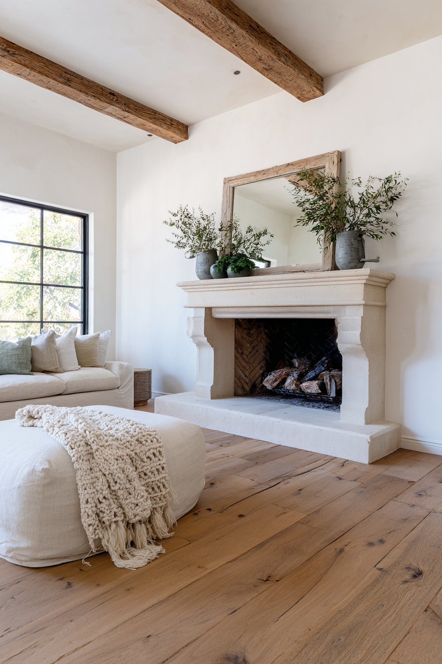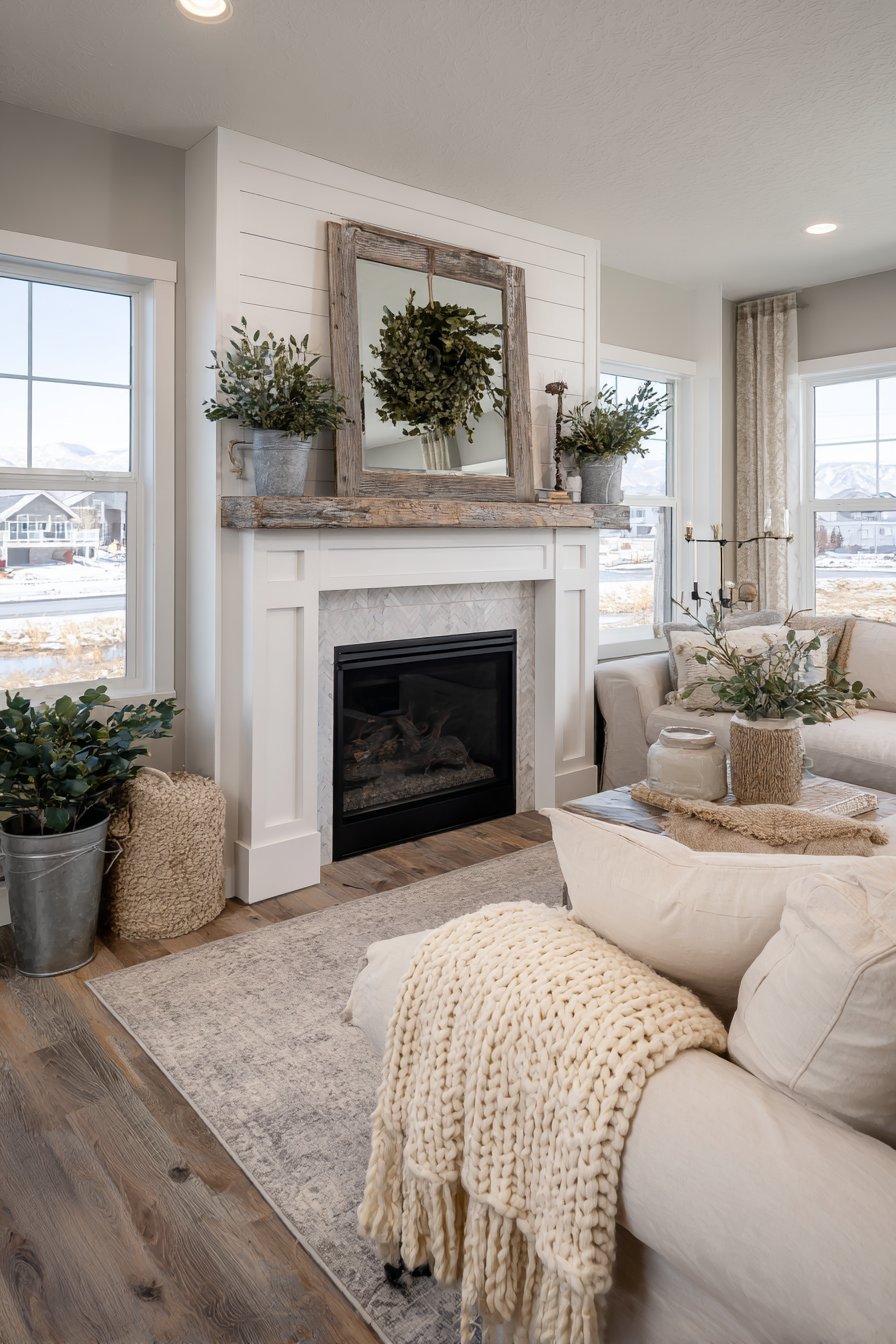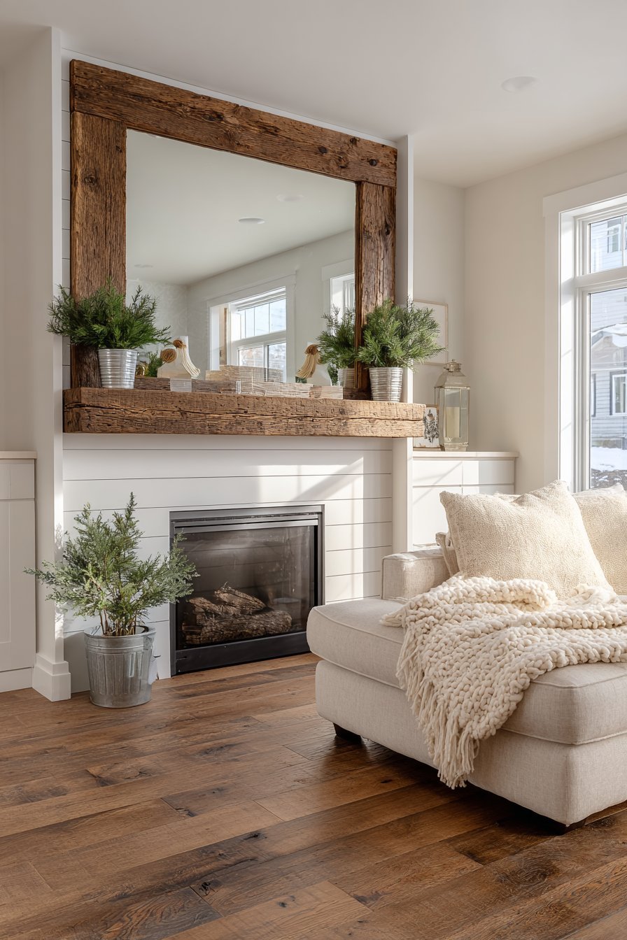 The mirror’s substantial frame grounds the fireplace wall arrangement. Its horizontal orientation complements the mantel’s linear form. The simple greenery styling keeps focus on architectural elements. This restraint characterizes successful modern farmhouse design.