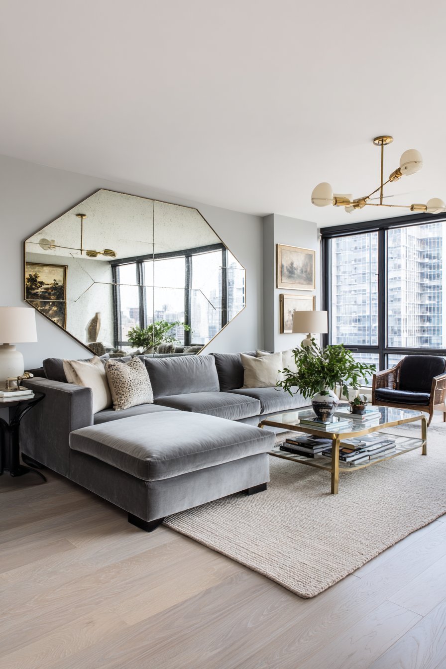 The grey velvet sectional sofa sits perfectly positioned below the mirror installation. Brass accent tables provide metallic contrast against the soft upholstery. Light oak hardwood flooring grounds the space with subtle grain variation. The natural wood tones balance the reflective surfaces beautifully.