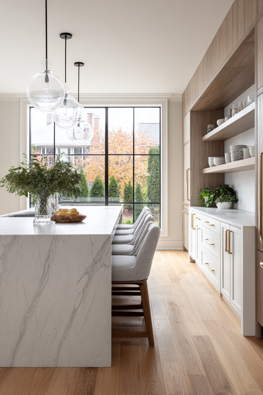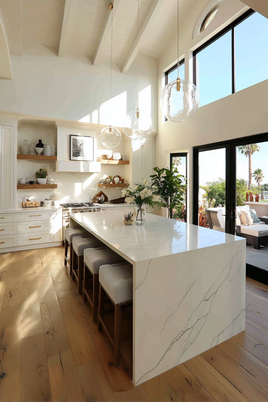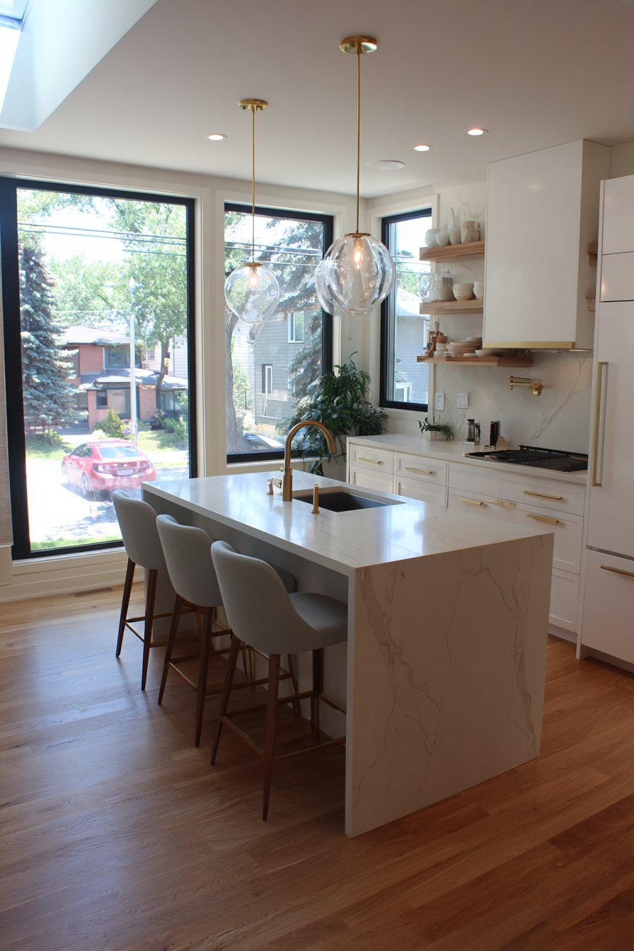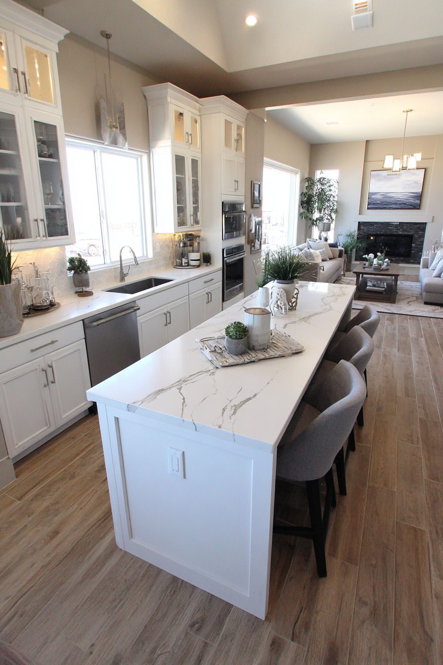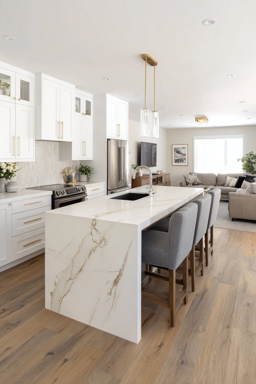 Picture an open kitchen where a magnificent waterfall-edge island commands attention. White quartz countertops cascade elegantly down the sides. Four modern bar stools with light grey upholstery invite casual dining. The visual impact creates an immediate focal point upon entering the space.