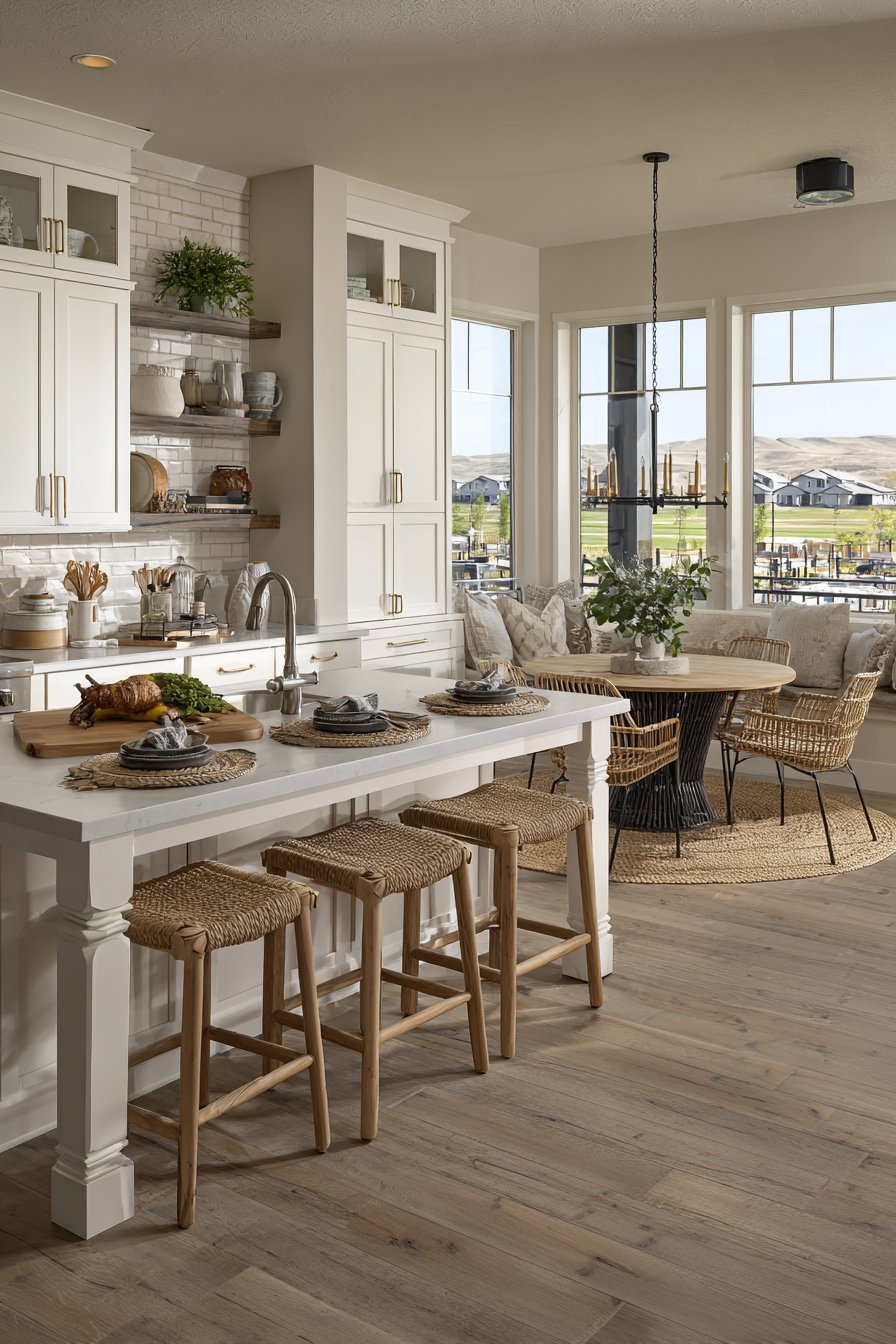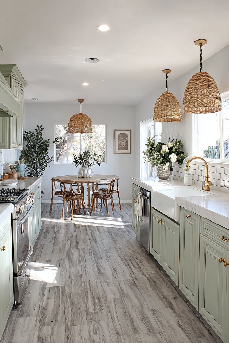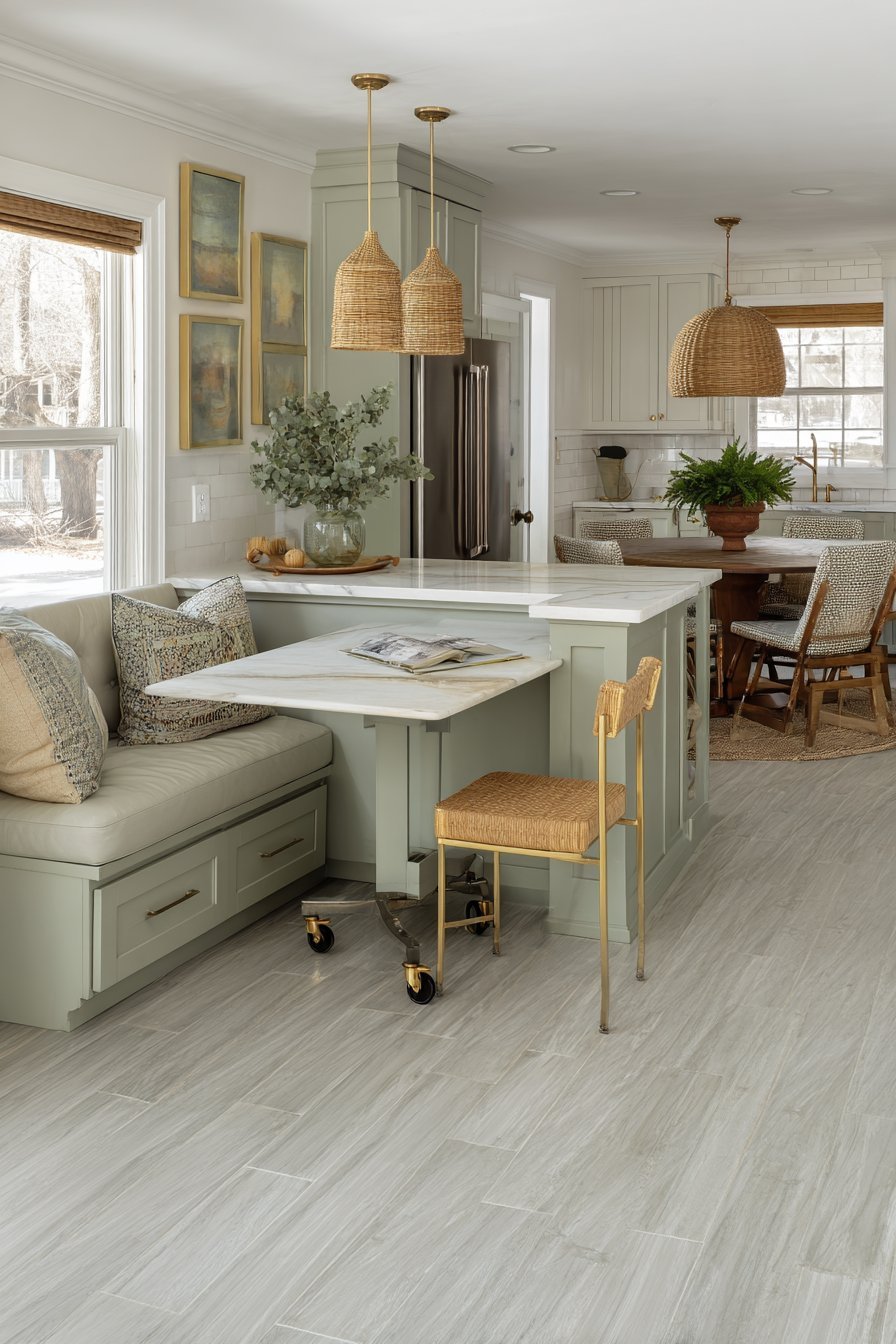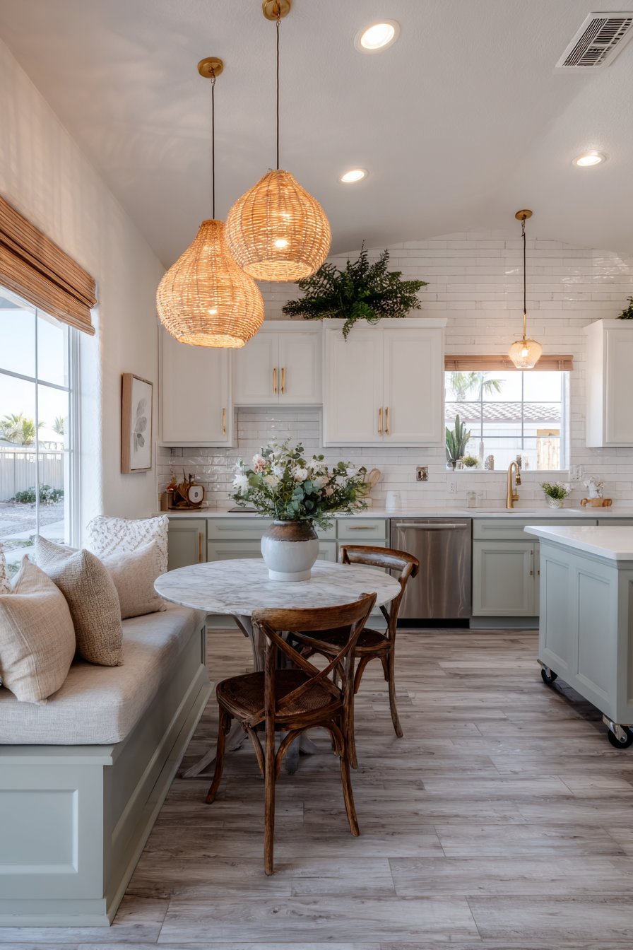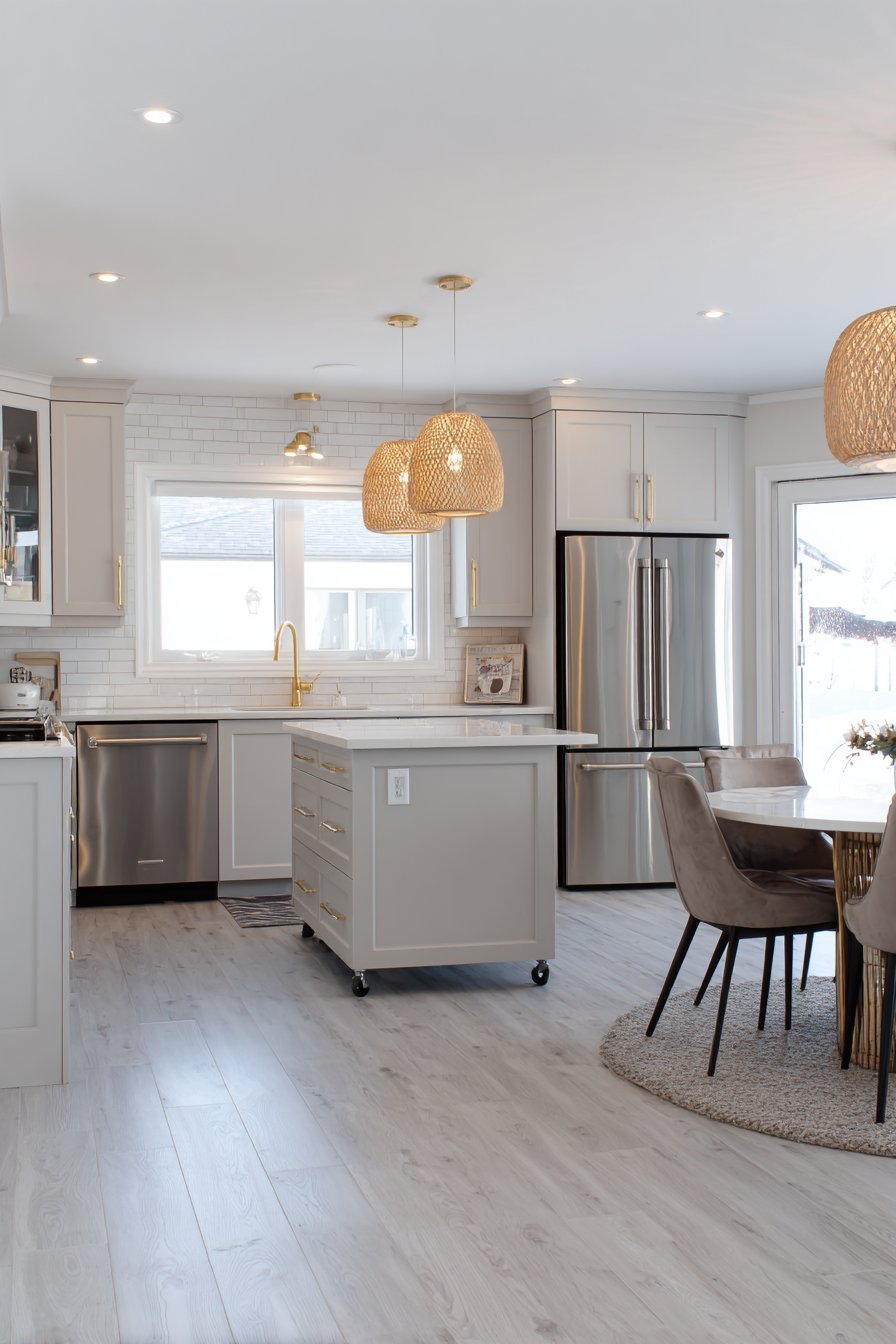 The kitchen opens to a dining area with round table. Mixed seating styles add personality and collected charm. Light grey luxury vinyl flooring with realistic wood grain extends throughout. Pendant lights with woven rattan shades hang above the island.
