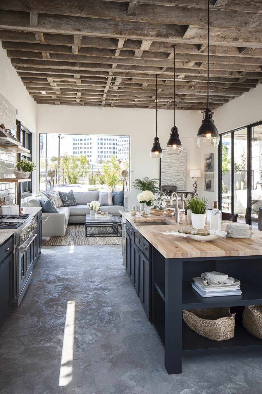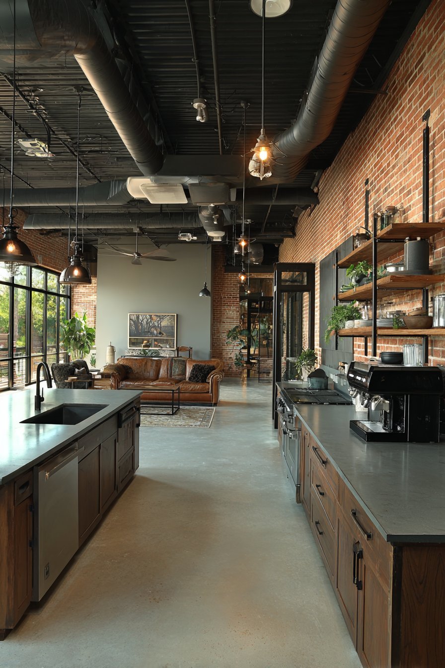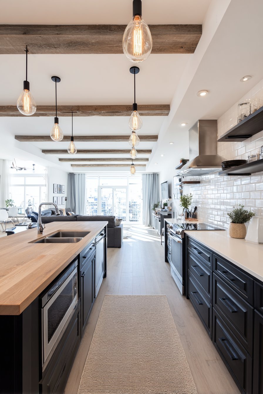 An open kitchen embraces industrial authenticity through exposed ceiling beams. Edison bulb pendants provide vintage-inspired task lighting. The raw architectural elements create urban character. This design celebrates honest materials and utilitarian beauty.