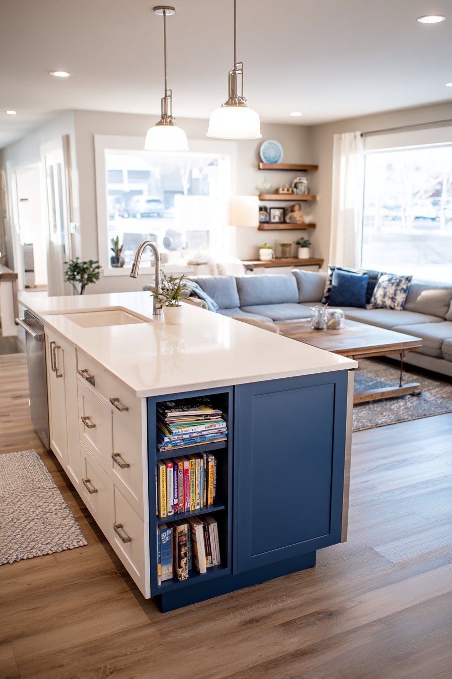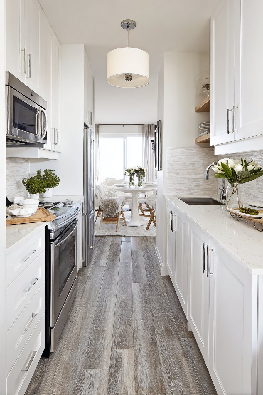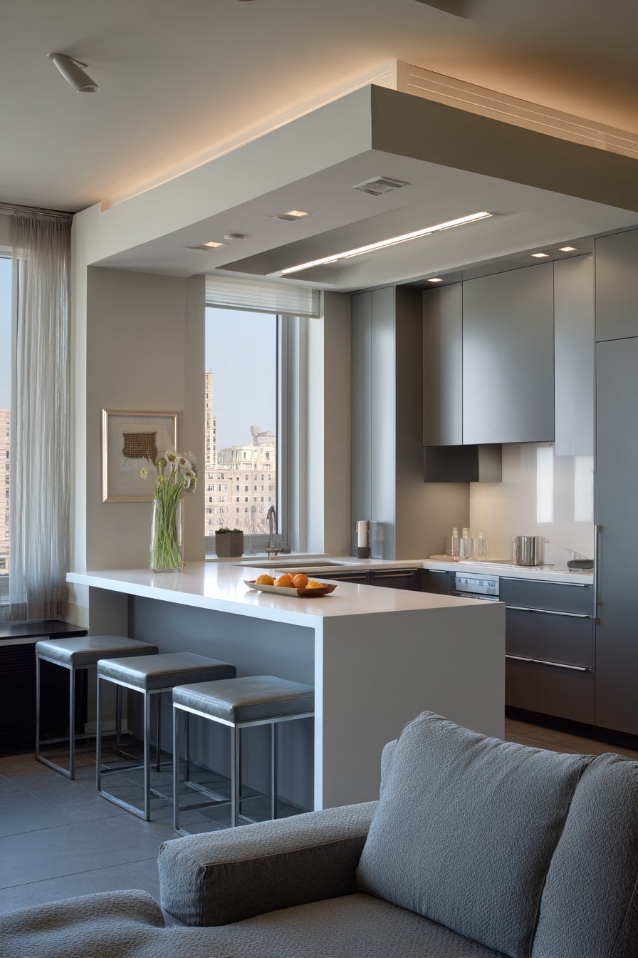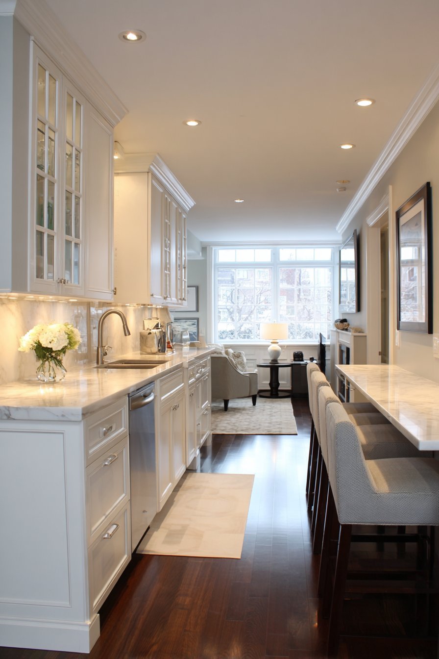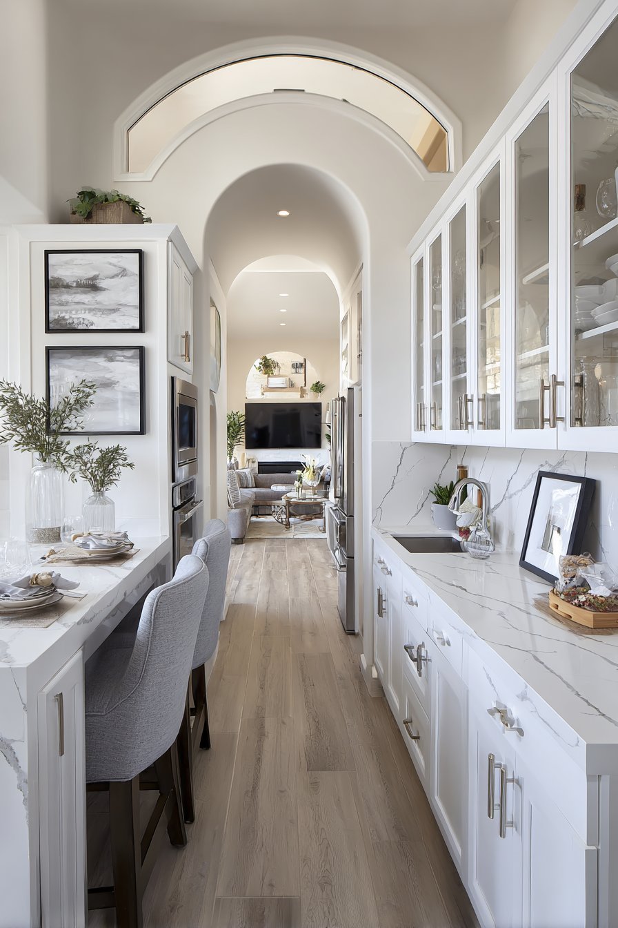A thoughtfully designed peninsula creates natural spatial division. The breakfast bar features white subway tile waterfall edge. This configuration works beautifully in galley-style layouts. The peninsula maximizes efficiency without closing off sight lines.