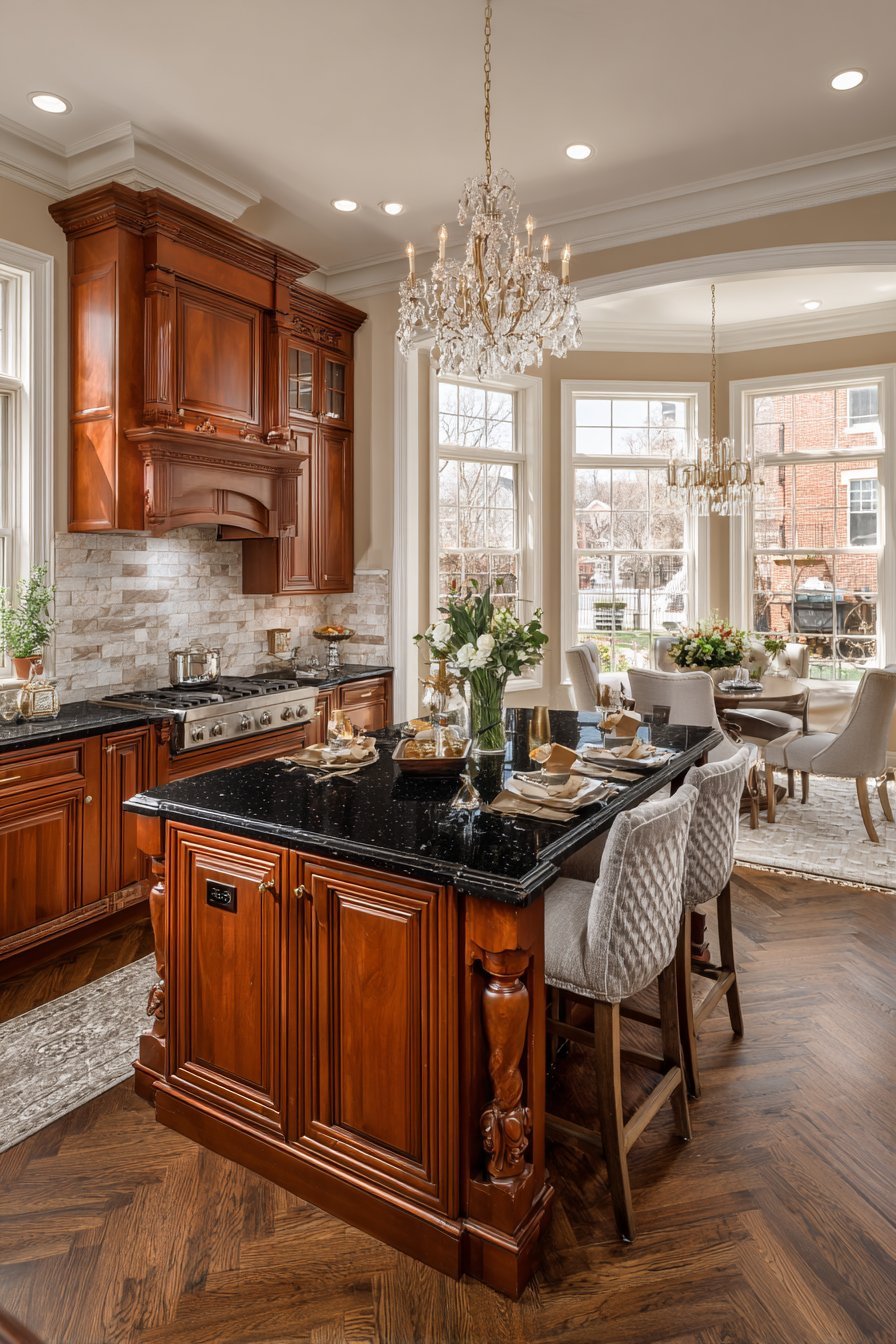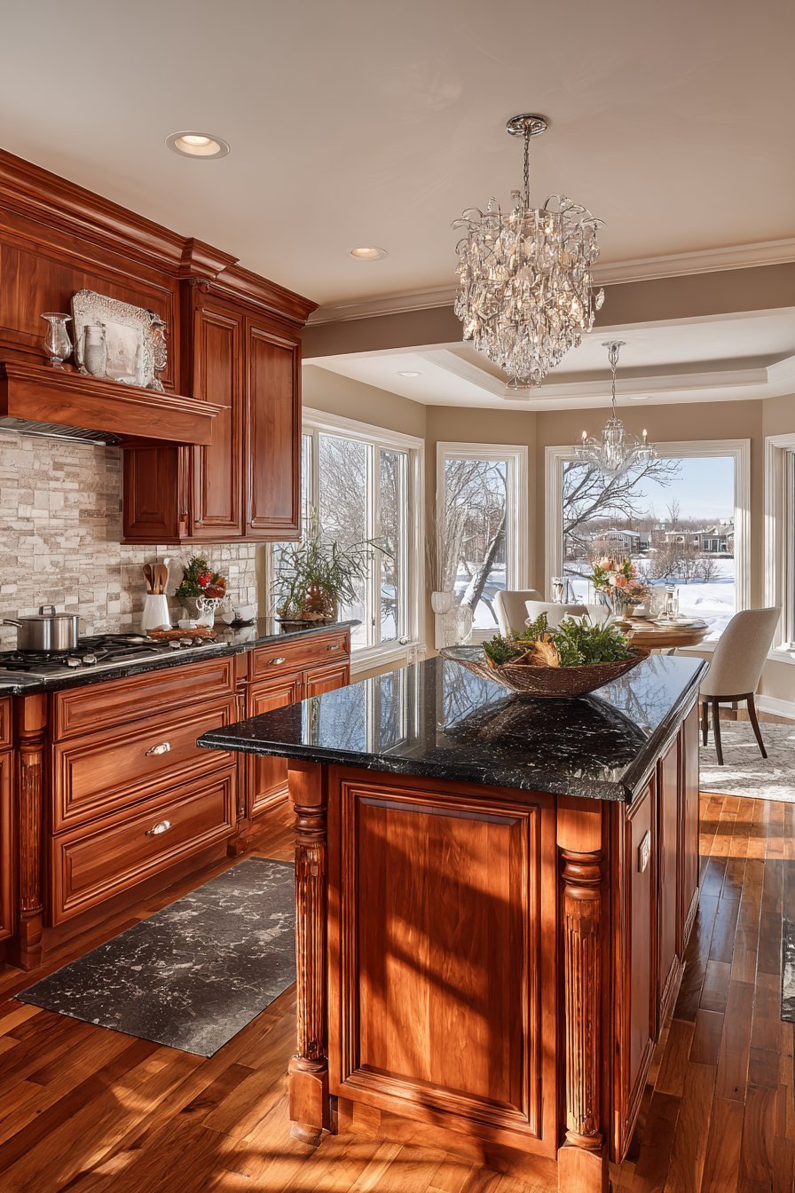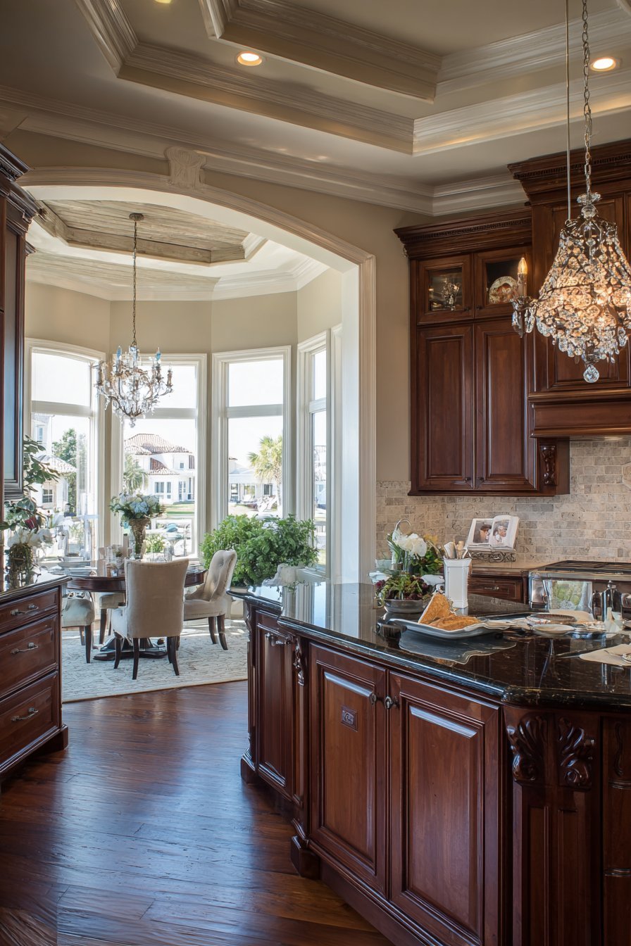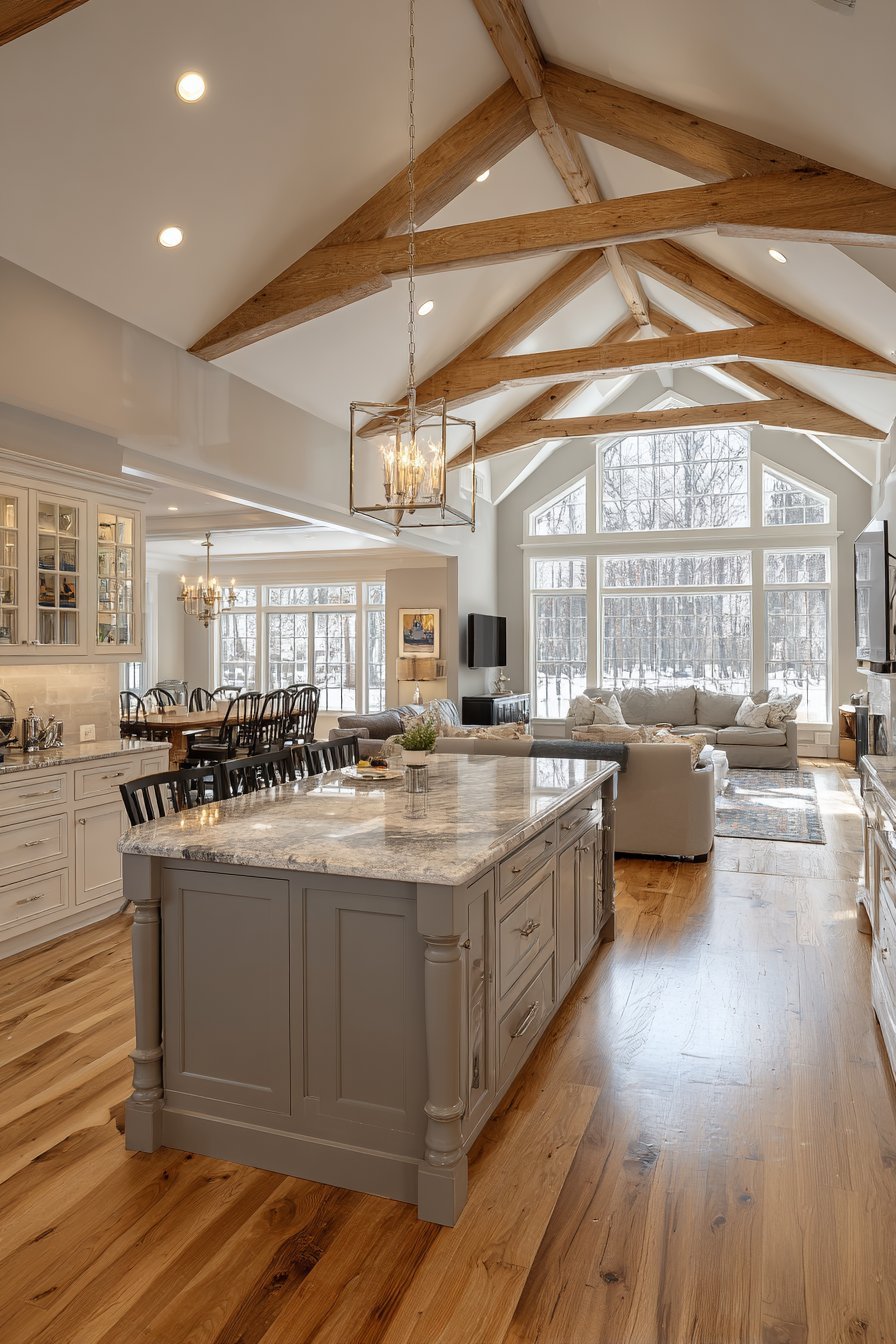 Multiple windows provide abundant natural light during daytime hours. A chandelier-style fixture hangs above the island majestically. The lighting choices enhance the transitional design approach. This kitchen proves traditional elements work in open concepts.