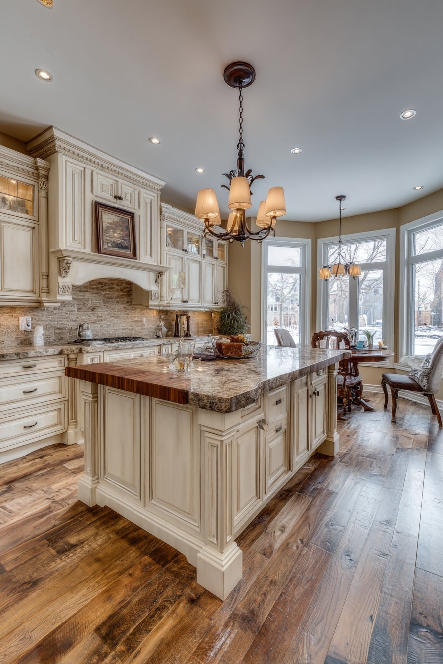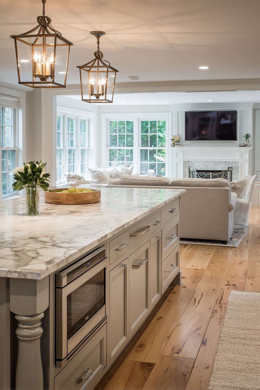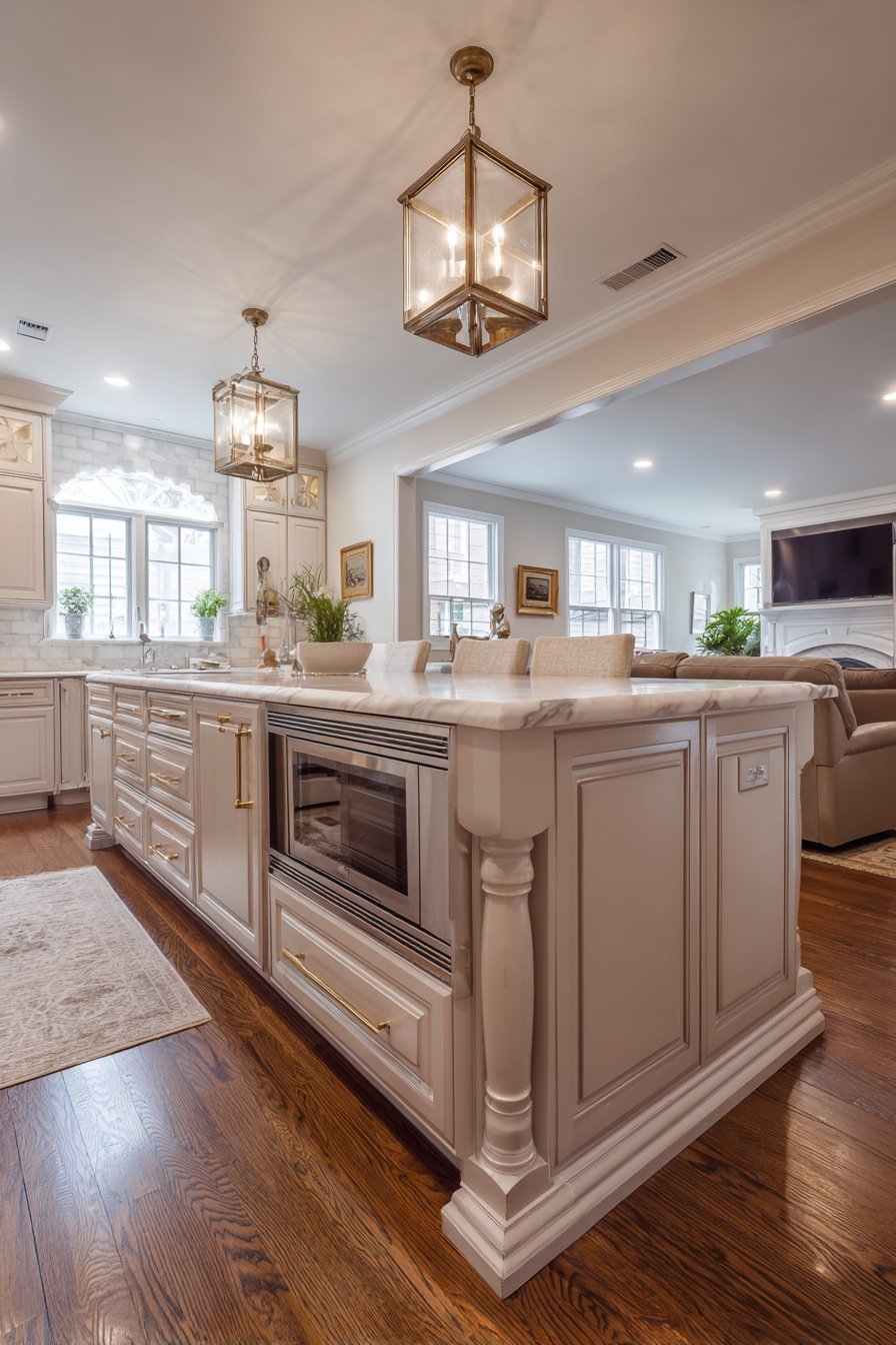 Lantern-style pendant lights in bronze finish hang above the island. Natural afternoon light from multiple windows creates warm, inviting ambiance. The classic elegance feels timeless and welcoming. The detailed island serves as centerpiece connecting functional zones.