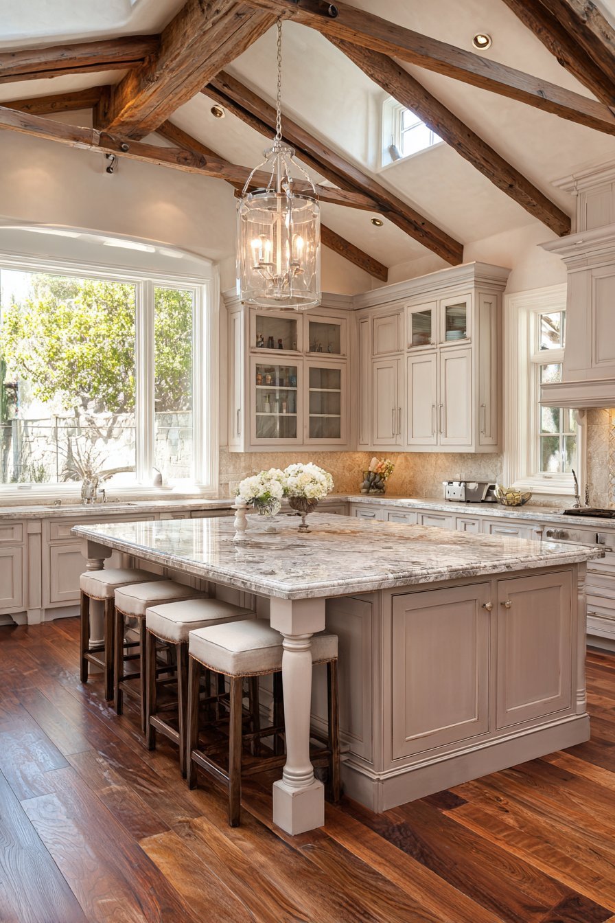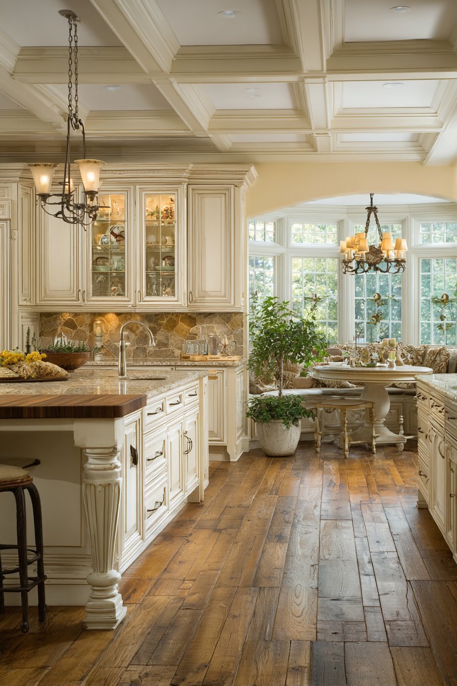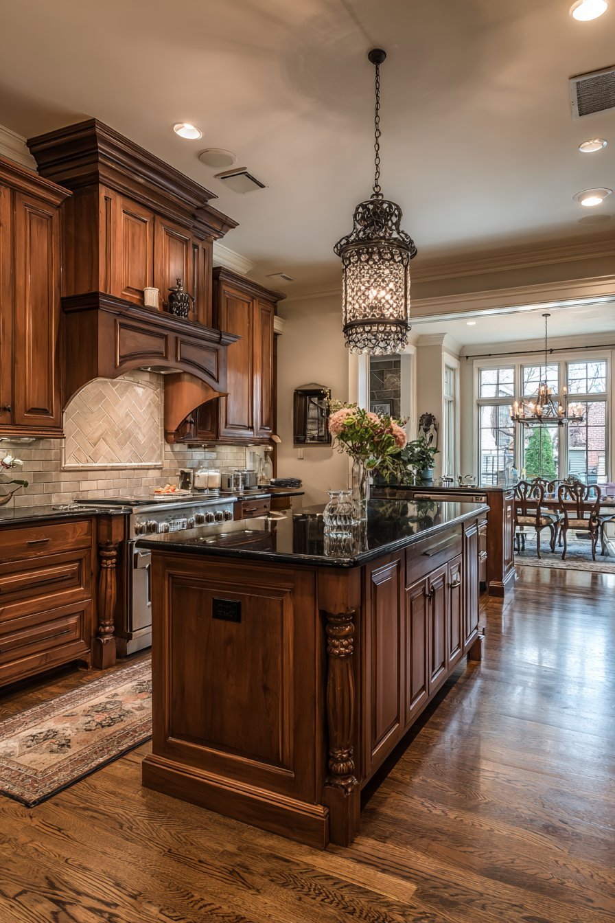 Lantern-style pendant lights in bronze finish hang above the island. Natural afternoon light from multiple windows creates warm, inviting ambiance. The classic elegance feels timeless and welcoming. The detailed island serves as centerpiece connecting functional zones.