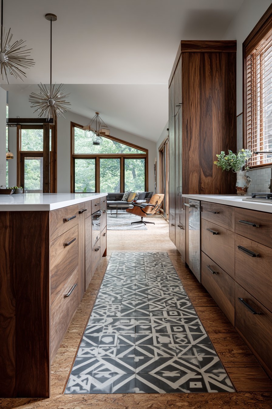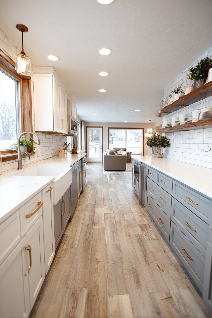 Light oak vinyl plank flooring provides warmth and durability. The wood-look surface handles kitchen traffic beautifully. Natural light from a window above the sink combines with pendant lights. The layered lighting creates functional task illumination.