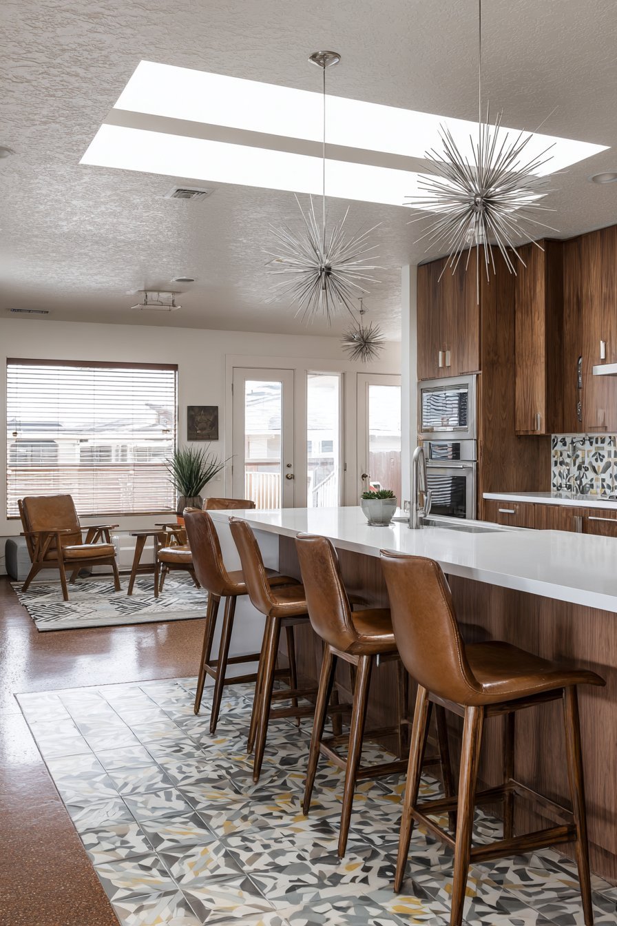 The lighting strategies employ layered approaches for maximum versatility. Ambient recessed fixtures provide overall illumination throughout connected spaces. Task lighting under cabinets ensures functional workspace brightness. Statement pendants add architectural interest while defining zones. Natural light integration through strategic window placement enhances every design.