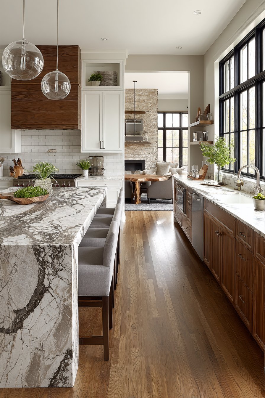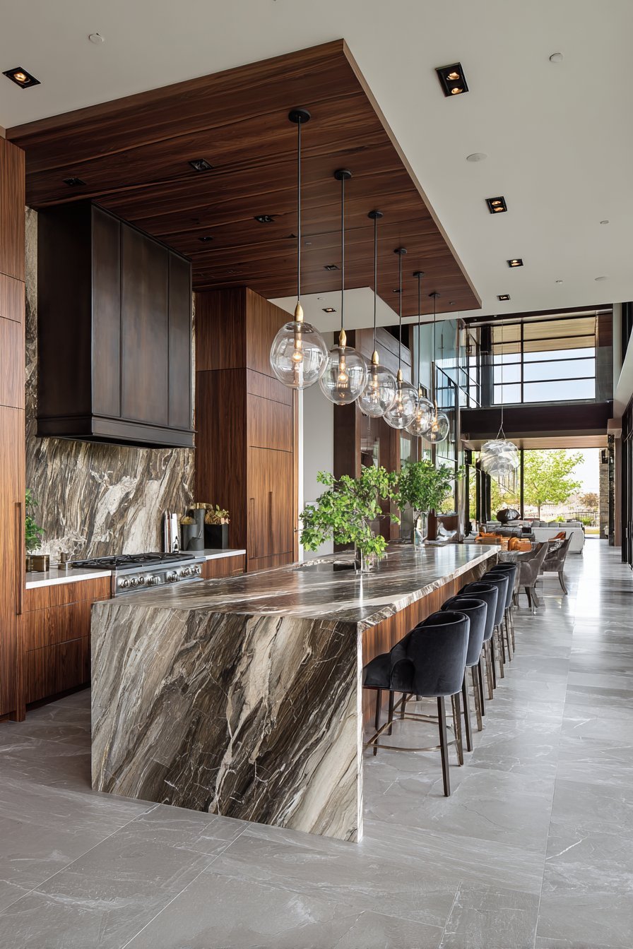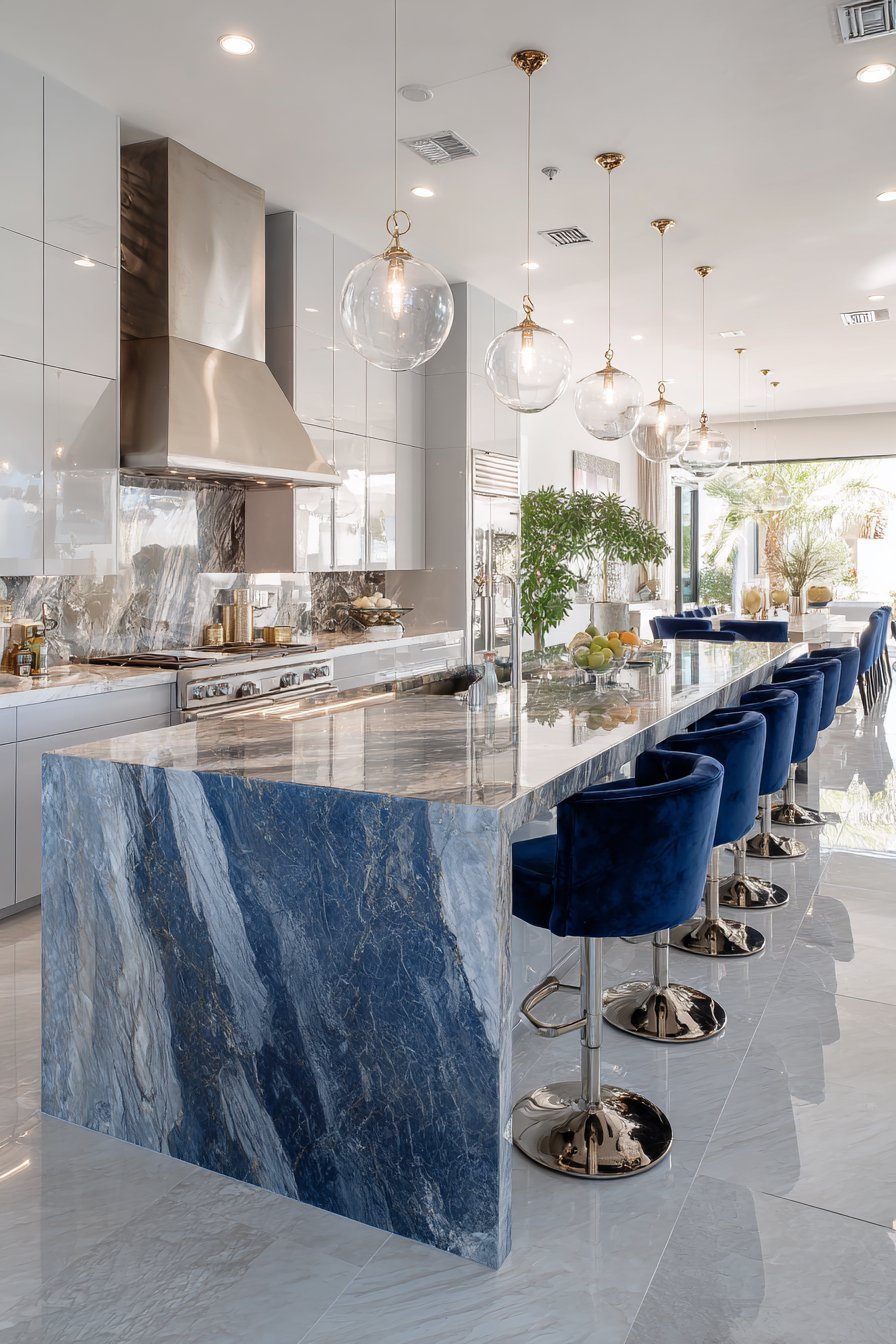 1. Waterfall Edge Island with Modern Elegance